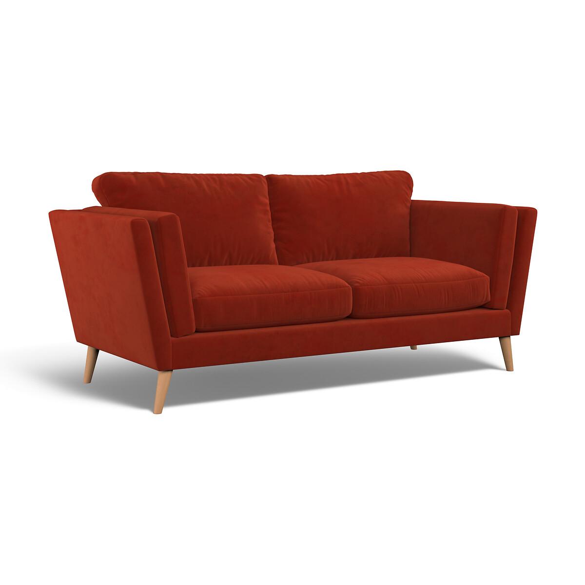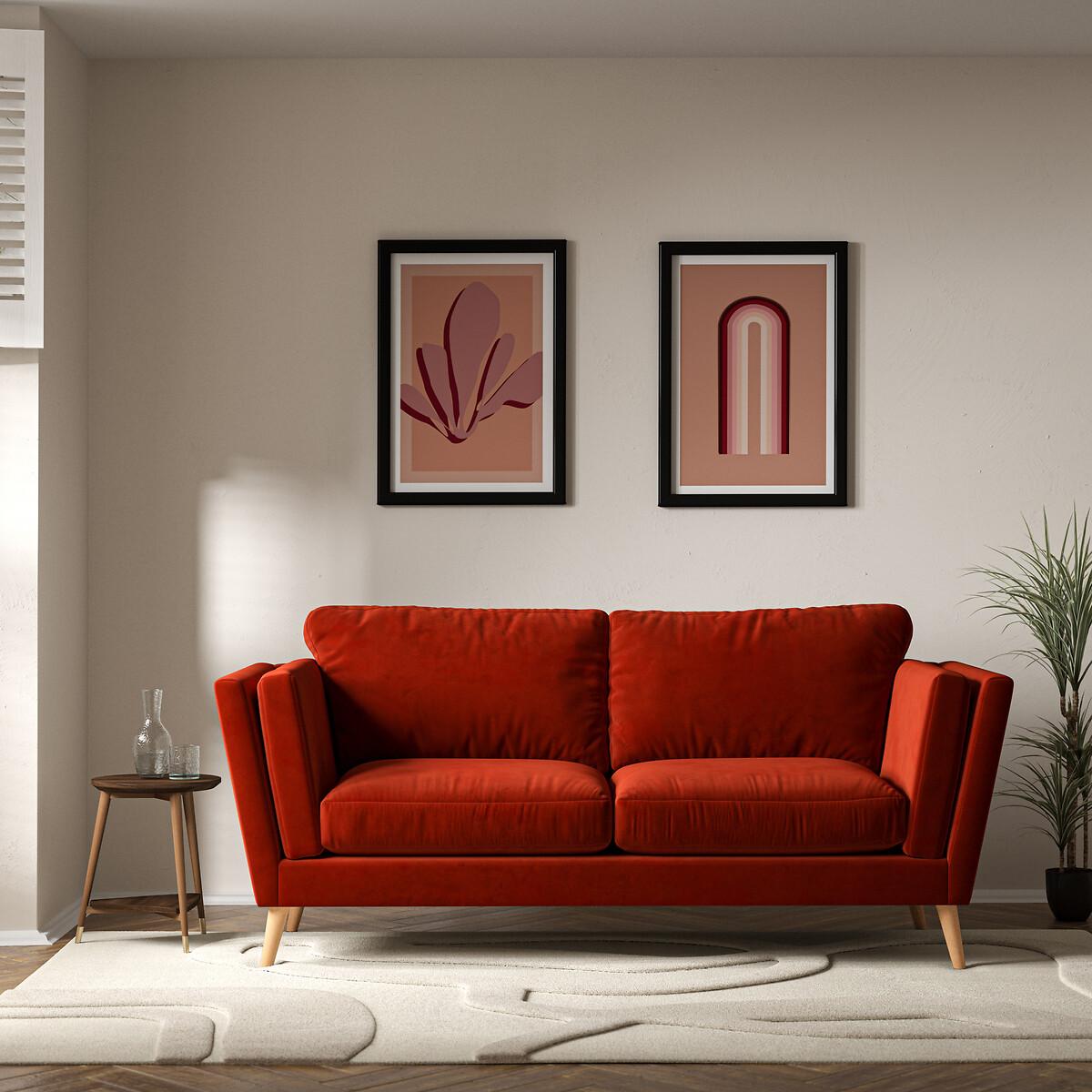 I love this sofa for its contemporary design and the plush velvet upholstery which adds a touch of luxe without feeling formal. The feather filling ensures a comfortable sit, making it perfect for everyday lounging. Its versatile shape suits both modern and eclectic interiors, and the light wood legs provide a subtle contrast that helps it feel fresh and airy. Styling tips include pairing with textured cushions or contrasting throws to add colour and personality. It works particularly well in neutral-toned schemes, where its rich colour can act as a statement piece, or in spaces with mid-century influences where the light wood legs complement other natural materials.