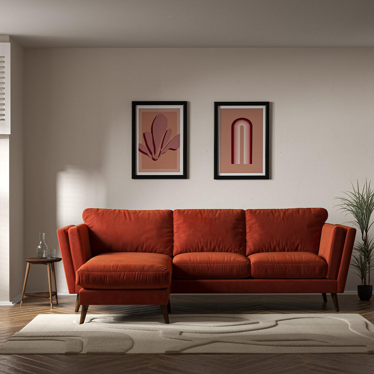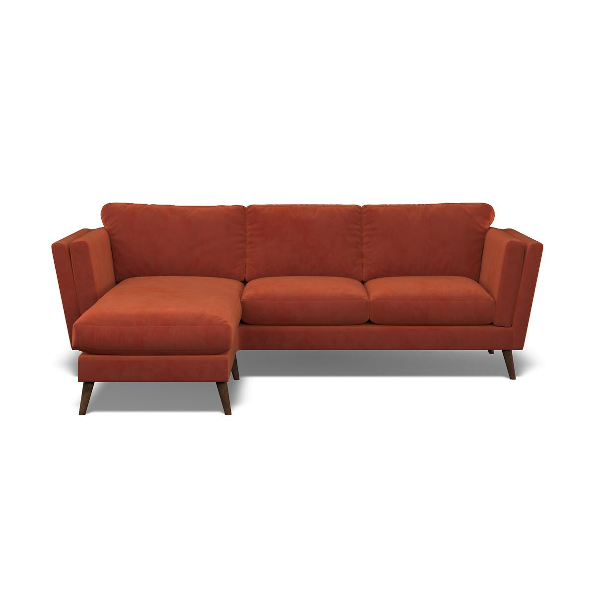 Curl up and cocoon with the beautifully designed Frida. Taking inspiration from ‘60s lounging, the Frida has a high architectural back and extra padding on the arms. Stretch out on the chaise corner and sink into squishy feathery cushions - perfect for cosy afternoon naps. Add some tapered wood legs and you have the very essence of vintage modern, and an easy way to add style to a midecntury inspired living room. Choose from our soft brushed fabric for ultimate cosiness or velvet for luxe living. A right hand sofa is also available, as well as a 2 seater, 3 seater and matching armchair. Product details• Velvet - An elegant velvet with a dense and matte finish, perfect for those wanting a rich and luxurious look. A flat finish pile makes it difficult for the material to snag – ideal if you live with pets and sure to prove durable for years to come. Check it's right for you - order a FREE swatch above.• Created with medium density foam fillings for a sofa with a level of comfort suitable for most. • Luxury seating cushions made from a blend of foam, feather and fibres offer the best of both words. A foam core with a feather wrap gives the cushion increased resilience and support without compromising on comfort, whilst fibre fillings add softness and body. Feather fillings allow air to circulate better, whilst being great at retaining heat in colder months. • Fibre backs provide extra softness and give you that "sink in" feeling.• Just flip to freshen up - the back cushions are fully finished both sides and reversible so it's easy to keep your sofa looking its best. Seat cushions are not reversible but are removable. • Both seat and back covers are removable (zip fastening)• FSC® solid beech hardwood frame - made of wood from responsibly managed forests that provide environmental, social and economic benefits.• Tapered feet crafted entirely from solid wood ensure durability and stability.• Removable feet.• Lovingly handmade in the UK.All our made to order sofas are carefully manufactured in the UK.Each hardwood frame is dowelled, glued, and screwed before being paired with the finest fabrics and fillings. And it doesn't stop there - for customer peace of mind and safety, all frames and fabrics are rigorously examined, inspected, and tested to the highest standards. All filling material(s) and covering fabric(s) meet the requirements for resistance to cigarette and match ignition in the 1988 safety regulations. This sofa comes with a 3 year manufacturer warranty from date of delivery (subject to terms and conditions)Product composition• Fabric - Velvet (100% polyester)• Seat fillings - foam/fibre/feather• Back Fillings - Fibre• Frame - Beech Hardwood (FSC), OSB (UK origin, FSC)• Feet - Solid Wood. Product Dimensions Overall width: 278 cm. Overall depth: 96/180 cm. Overall height: 95 cm. Seat height: 48 cm. Seat depth: 60 cm. Seat width between the arms: 245 cm Arm width (at highest point): 8 cm excluding cushioned part, 20 cm including cushioned part. Back height (from base): 75 cm. Back height (from seat): 46 cm. Arm height (from floor): 80 cm. Arm height (from seat): 40 cm Clearance to floor (leg height): 20 cm. Please remember to measure your available space before ordering to be sure your sofa will fit. Don't forget to measure accessways and corners, and consider any obstacles. Package DimensionsL22. 1 cm x W151 cm x H96 cm, Weight 86 kg. This product will be dispatched by one of our trusted suppliers. You’ll be contacted by their selected courier about your delivery. Your product will be delivered to your room of choice. Feet may be assembled on arrival. BELFI01