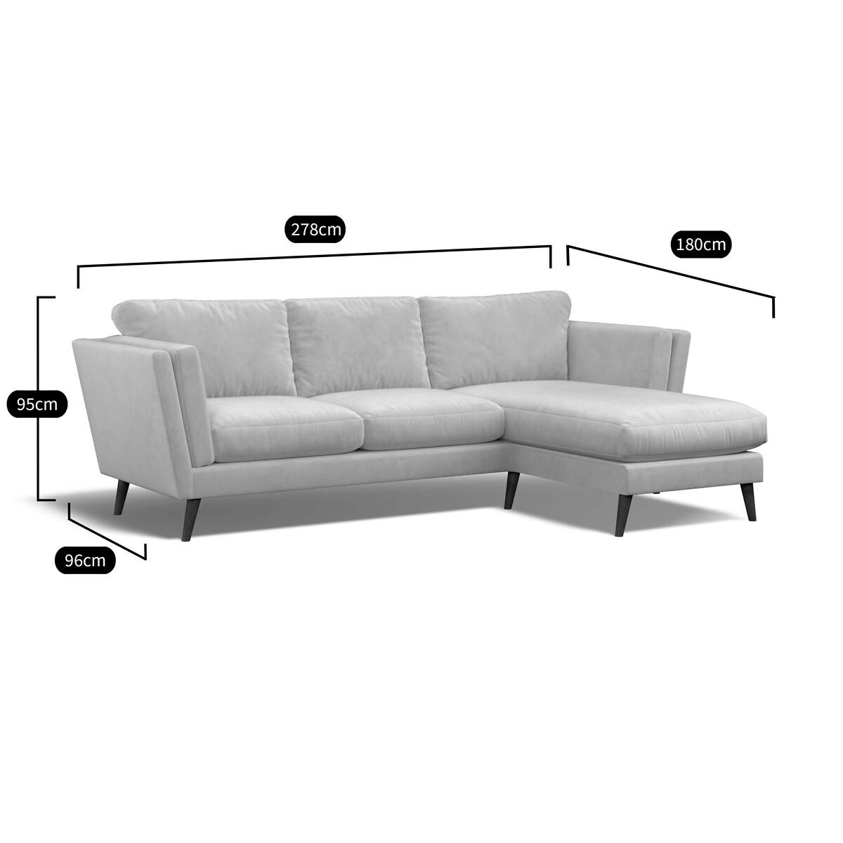 Curl up and cocoon with the beautifully designed Frida. Taking inspiration from ‘60s lounging, the Frida has a high architectural back and extra padding on the arms. Stretch out on the chaise corner and sink into squishy feathery cushions - perfect for cosy afternoon naps. Add some tapered wood legs and you have the very essence of vintage modern, and an easy way to add style to a midecntury inspired living room. Choose from our soft brushed fabric for ultimate cosiness or velvet for luxe living. A left hand sofa is also availabe, as well as a 2 seater, 3 seater and matching armchair. Product details• Velvet - An elegant velvet with a dense and matte finish, perfect for those wanting a rich and luxurious look. A flat finish pile makes it difficult for the material to snag – ideal if you live with pets and sure to prove durable for years to come. Check it's right for you - order a FREE swatch above.• Created with medium density foam fillings for a sofa with a level of comfort suitable for most. • Luxury seating cushions made from a blend of foam, feather and fibres offer the best of both words. A foam core with a feather wrap gives the cushion increased resilience and support without compromising on comfort, whilst fibre fillings add softness and body. Feather fillings allow air to circulate better, whilst being great at retaining heat in colder months. • Fibre backs provide extra softness and give you that "sink in" feeling.• Just flip to freshen up - the back cushions are fully finished both sides and reversible so it's easy to keep your sofa looking its best. Seat cushions are not reversible but are removable. • Both seat and back covers are removable (zip fastening)• FSC® solid beech hardwood frame - made of wood from responsibly managed forests that provide environmental, social and economic benefits.• Tapered feet crafted entirely from solid wood ensure durability and stability.• Removable feet.• Lovingly handmade in the UK.All our made to order sofas are carefully manufactured in the UK.Each hardwood frame is dowelled, glued, and screwed before being paired with the finest fabrics and fillings. And it doesn't stop there - for customer peace of mind and safety, all frames and fabrics are rigorously examined, inspected, and tested to the highest standards. All filling material(s) and covering fabric(s) meet the requirements for resistance to cigarette and match ignition in the 1988 safety regulations. This sofa comes with a 3 year manufacturer warranty from date of delivery (subject to terms and conditions)Product composition• Fabric - Velvet (100% polyester)• Seat fillings - foam/fibre/feather• Back Fillings - Fibre• Frame - Beech Hardwood (FSC), OSB (UK origin, FSC)• Feet - Solid Wood. Product Dimensions Overall width: 278 cm. Overall depth: 96/180 cm. Overall height: 95 cm. Seat height: 48 cm. Seat depth: 60 cm. Seat width between the arms: 245 cm Arm width (at highest point): 8 cm excluding cushioned part, 20 cm including cushioned part. Back height (from base): 75 cm. Back height (from seat): 46 cm. Arm height (from floor): 80 cm. Arm height (from seat): 40 cm Clearance to floor (leg height): 20 cm. Please remember to measure your available space before ordering to be sure your sofa will fit. Don't forget to measure accessways and corners, and consider any obstacles. Package DimensionsL22. 1 cm x W151 cm x H96 cm, Weight 86 kg. This product will be dispatched by one of our trusted suppliers. You’ll be contacted by their selected courier about your delivery. Your product will be delivered to your room of choice. Feet may be assembled on arrival. BELFI01