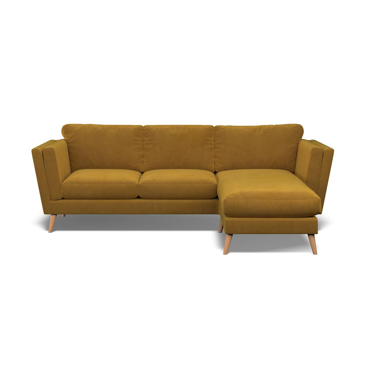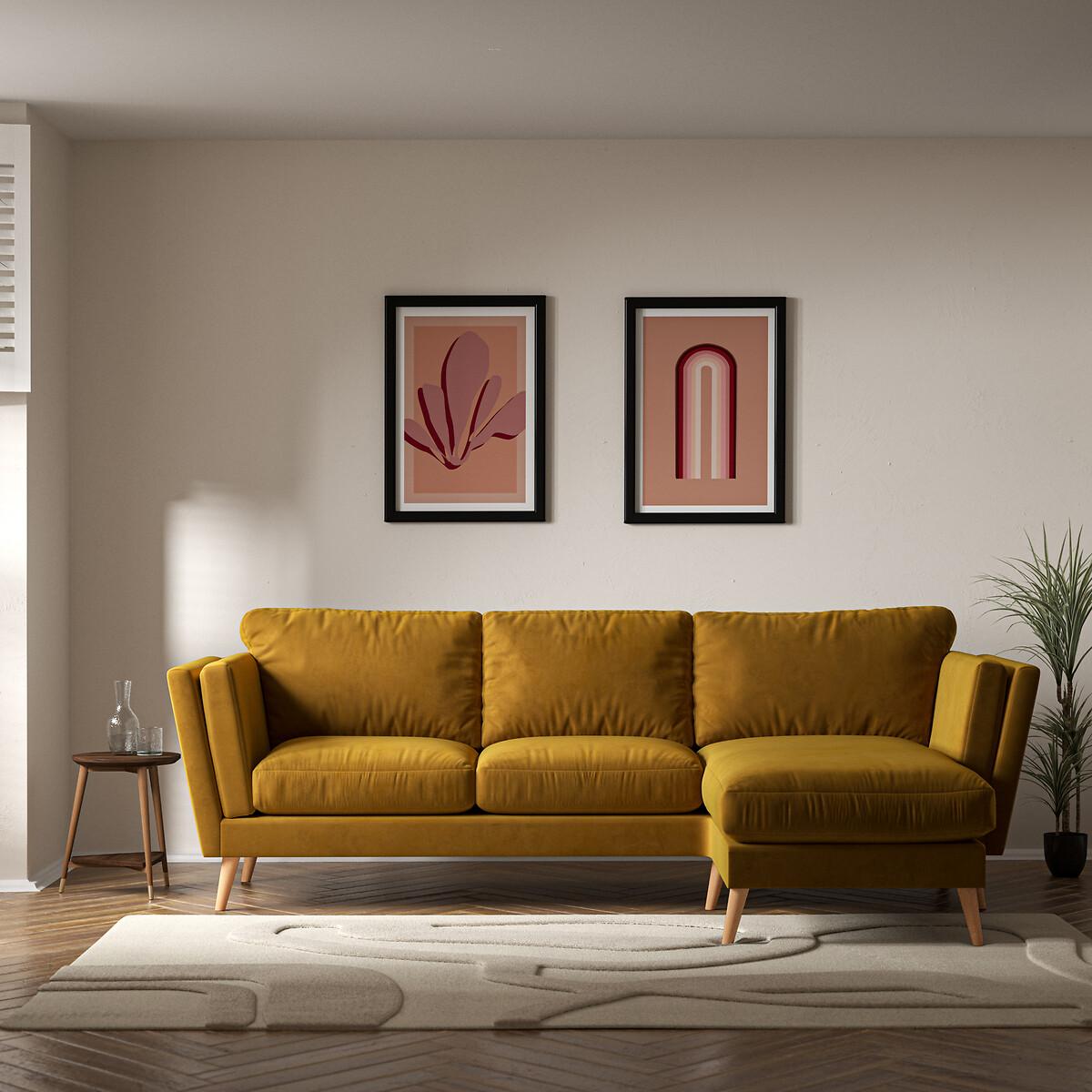 Curl up and cocoon with the beautifully designed Frida. Taking inspiration from ‘60s lounging, the Frida has a high architectural back and extra padding on the arms. Stretch out on the chaise corner and sink into squishy feathery cushions - perfect for cosy afternoon naps. Add some tapered wood legs and you have the very essence of vintage modern, and an easy way to add style to a midecntury inspired living room. Choose from our soft brushed fabric for ultimate cosiness or velvet for luxe living. A left hand sofa is also availabe, as well as a 2 seater, 3 seater and matching armchair. Product details• Velvet - An elegant velvet with a dense and matte finish, perfect for those wanting a rich and luxurious look. A flat finish pile makes it difficult for the material to snag – ideal if you live with pets and sure to prove durable for years to come. Check it's right for you - order a FREE swatch above.• Created with medium density foam fillings for a sofa with a level of comfort suitable for most. • Luxury seating cushions made from a blend of foam, feather and fibres offer the best of both words. A foam core with a feather wrap gives the cushion increased resilience and support without compromising on comfort, whilst fibre fillings add softness and body. Feather fillings allow air to circulate better, whilst being great at retaining heat in colder months. • Fibre backs provide extra softness and give you that "sink in" feeling.• Just flip to freshen up - the back cushions are fully finished both sides and reversible so it's easy to keep your sofa looking its best. Seat cushions are not reversible but are removable. • Both seat and back covers are removable (zip fastening)• FSC® solid beech hardwood frame - made of wood from responsibly managed forests that provide environmental, social and economic benefits.• Tapered feet crafted entirely from solid wood ensure durability and stability.• Removable feet.• Lovingly handmade in the UK.All our made to order sofas are carefully manufactured in the UK.Each hardwood frame is dowelled, glued, and screwed before being paired with the finest fabrics and fillings. And it doesn't stop there - for customer peace of mind and safety, all frames and fabrics are rigorously examined, inspected, and tested to the highest standards. All filling material(s) and covering fabric(s) meet the requirements for resistance to cigarette and match ignition in the 1988 safety regulations. This sofa comes with a 3 year manufacturer warranty from date of delivery (subject to terms and conditions)Product composition• Fabric - Velvet (100% polyester)• Seat fillings - foam/fibre/feather• Back Fillings - Fibre• Frame - Beech Hardwood (FSC), OSB (UK origin, FSC)• Feet - Solid Wood. Product Dimensions Overall width: 278 cm. Overall depth: 96/180 cm. Overall height: 95 cm. Seat height: 48 cm. Seat depth: 60 cm. Seat width between the arms: 245 cm Arm width (at highest point): 8 cm excluding cushioned part, 20 cm including cushioned part. Back height (from base): 75 cm. Back height (from seat): 46 cm. Arm height (from floor): 80 cm. Arm height (from seat): 40 cm Clearance to floor (leg height): 20 cm. Please remember to measure your available space before ordering to be sure your sofa will fit. Don't forget to measure accessways and corners, and consider any obstacles. Package DimensionsL22. 1 cm x W151 cm x H96 cm, Weight 86 kg. This product will be dispatched by one of our trusted suppliers. You’ll be contacted by their selected courier about your delivery. Your product will be delivered to your room of choice. Feet may be assembled on arrival. BELFI01
