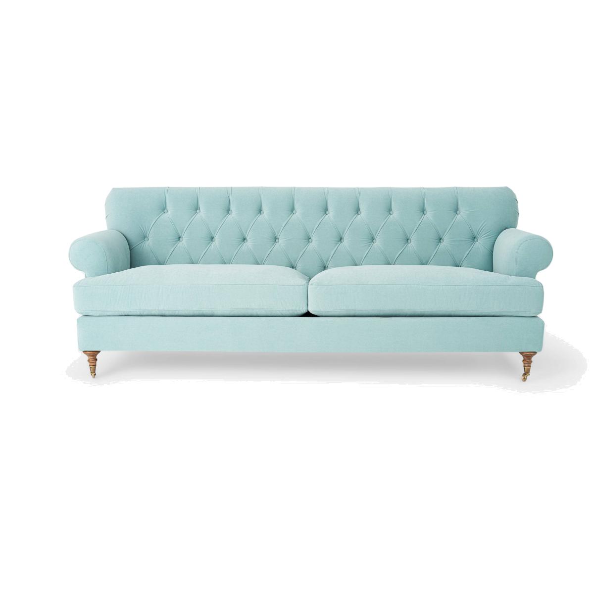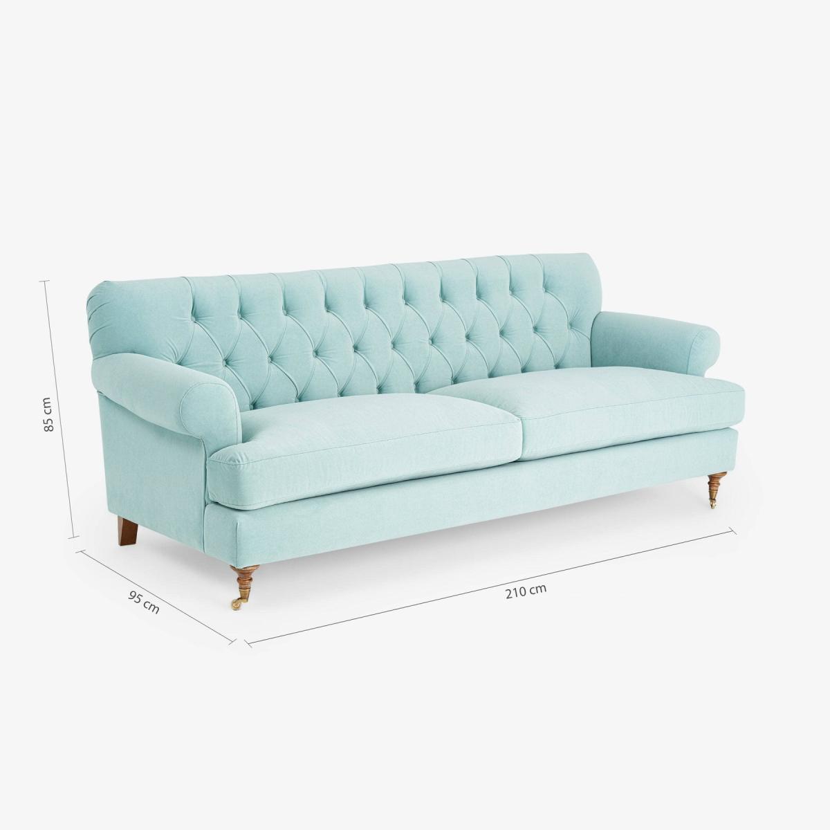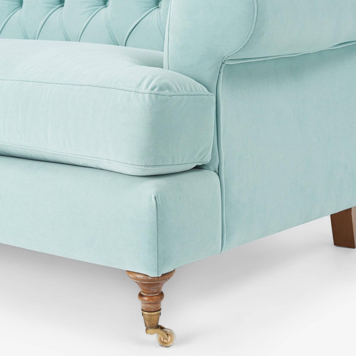 Enjoy the vintage charm of our Frieda 3-seater sofa with its tradition-rich deep buttons and sumptuous seating. Adding a welcome dose of drama to your interior scheme, this sophisticated sofa is made from a hornbeam wood frame. Adding to its charm are Frieda's pleated round arms, matched by the button-back detailing on the back cushion, and its turned wooden legs with bronze castors. This velvet sofa also has a generously wide seating area that is equally comfortable, thanks to its foam and feather filling, for the entire family. Upholstered in duck egg blue, this eye-catching sofa will look equally stylish in both traditional and contemporary settings. It complies with UK safety regulations and has a flame retardant certificate that has been verified.