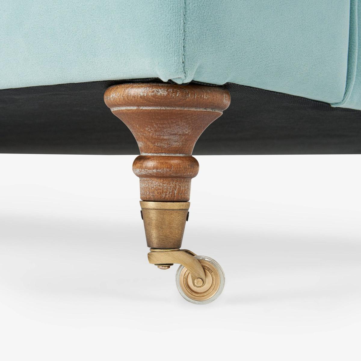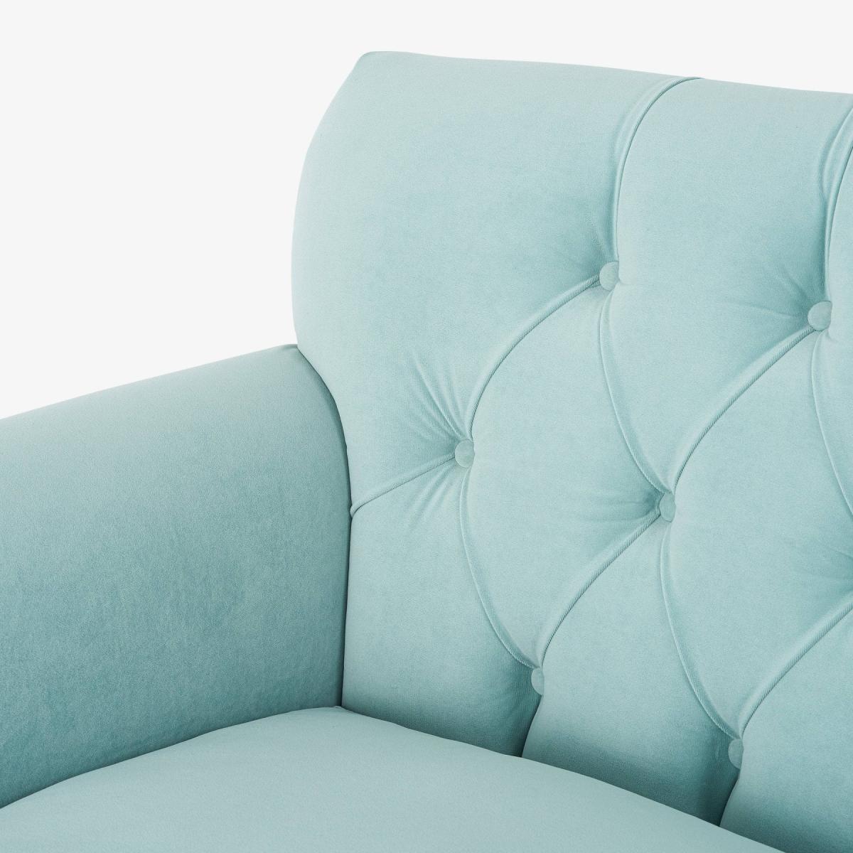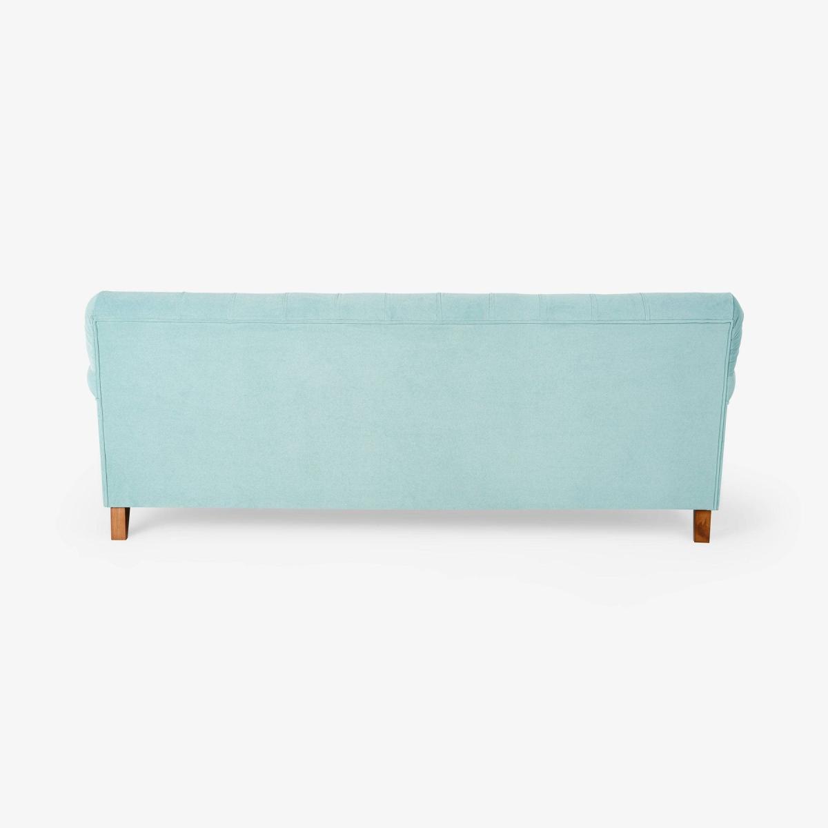 Enjoy the vintage charm of our Frieda 3-seater sofa with its tradition-rich deep buttons and sumptuous seating. Adding a welcome dose of drama to your interior scheme, this sophisticated sofa is made from a hornbeam wood frame. Adding to its charm are Frieda's pleated round arms, matched by the button-back detailing on the back cushion, and its turned wooden legs with bronze castors. This velvet sofa also has a generously wide seating area that is equally comfortable, thanks to its foam and feather filling, for the entire family. Upholstered in duck egg blue, this eye-catching sofa will look equally stylish in both traditional and contemporary settings. It complies with UK safety regulations and has a flame retardant certificate that has been verified.