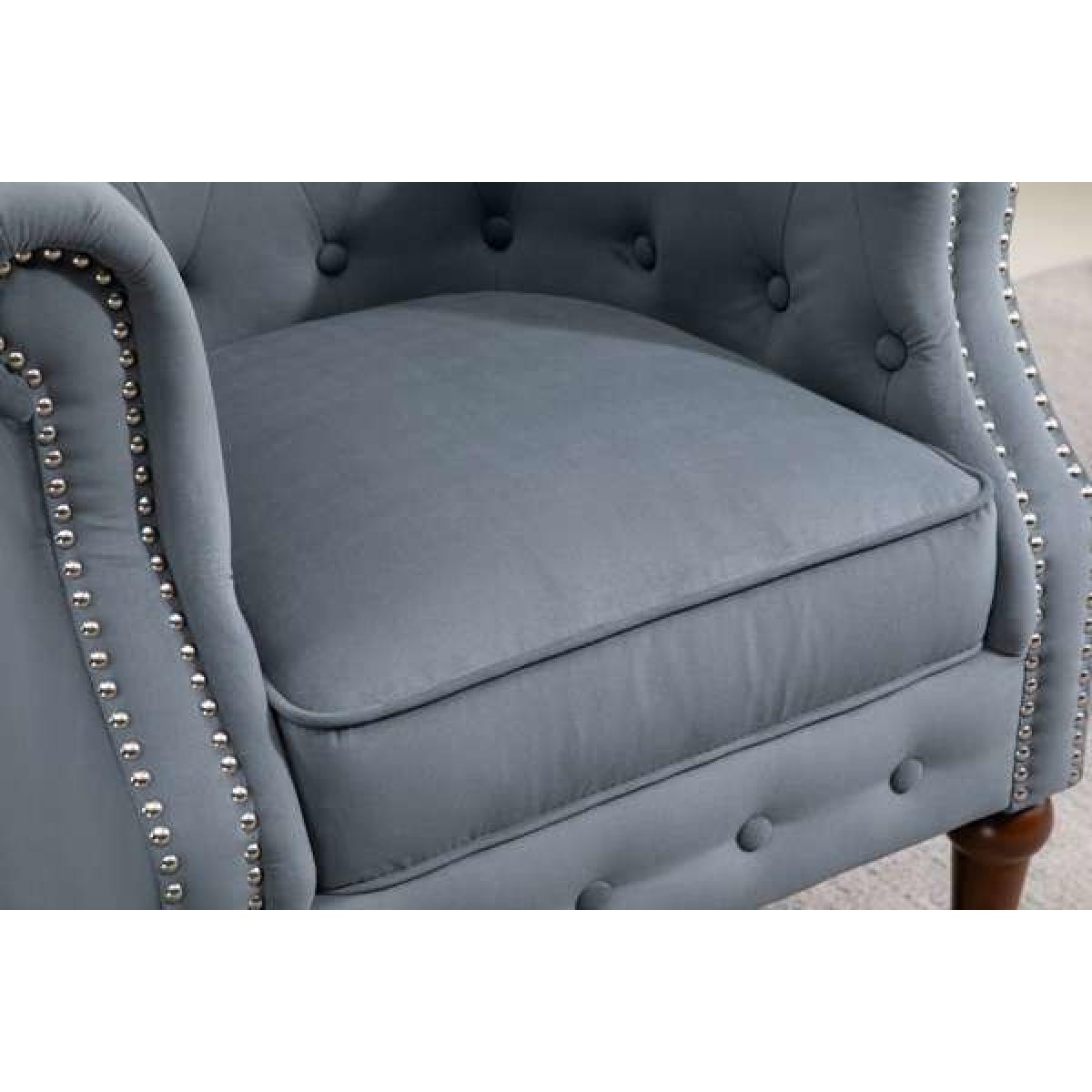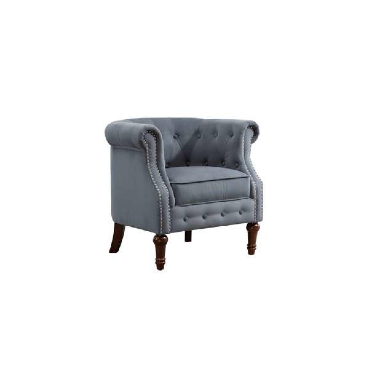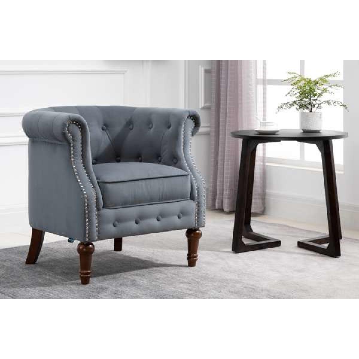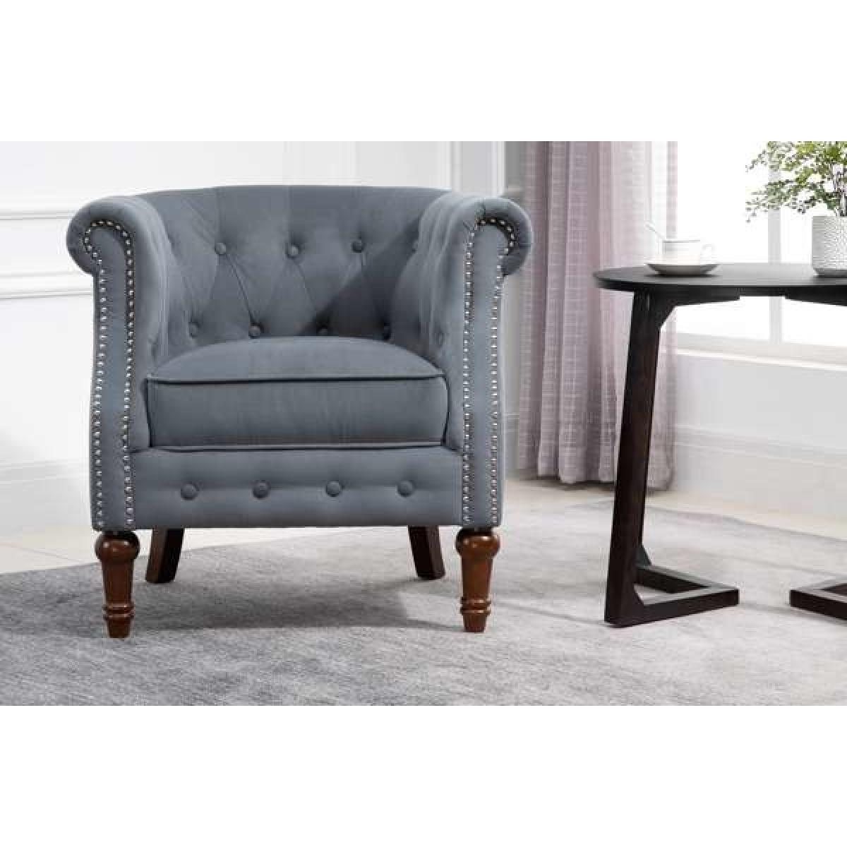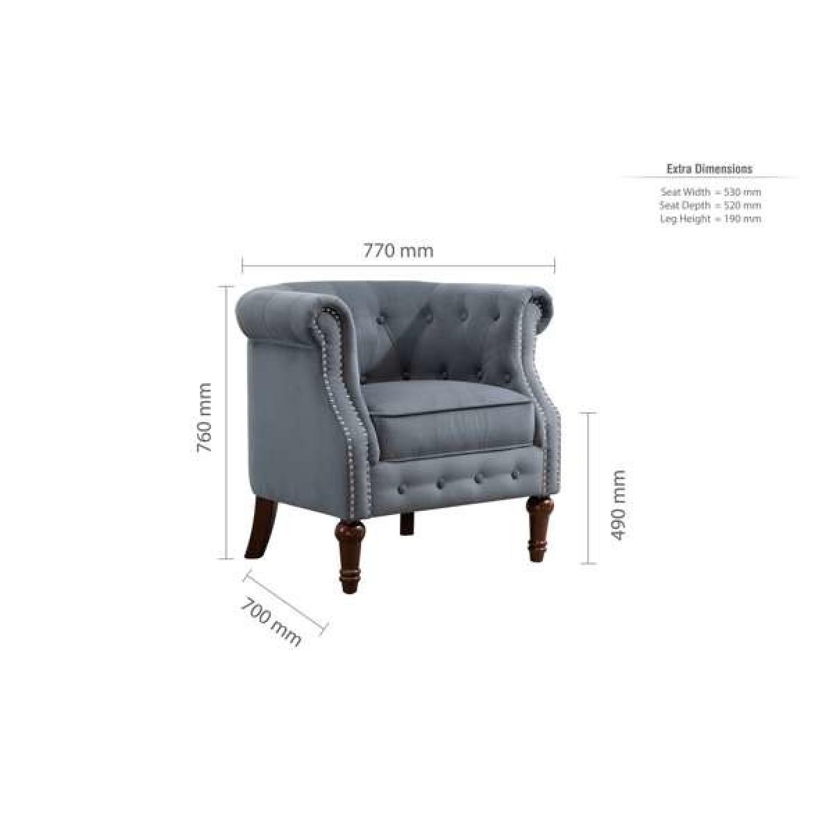 I love this armchair for its timeless charm and neutral grey tone, making it versatile for a range of interiors. It works particularly well in classic or eclectic spaces, where its traditional shape can be complemented with contemporary accessories or vintage finds. The tufted back and nailhead detailing lend a sense of sophistication, while the sturdy wooden legs keep it grounded and practical. For styling tips, consider pairing it with textured cushions or a cosy throw to create a welcoming nook, or place it in a corner with a small side table and lamp for an inviting reading spot. Its neutral hue and elegant silhouette make it easy to incorporate into both modern and traditional settings.