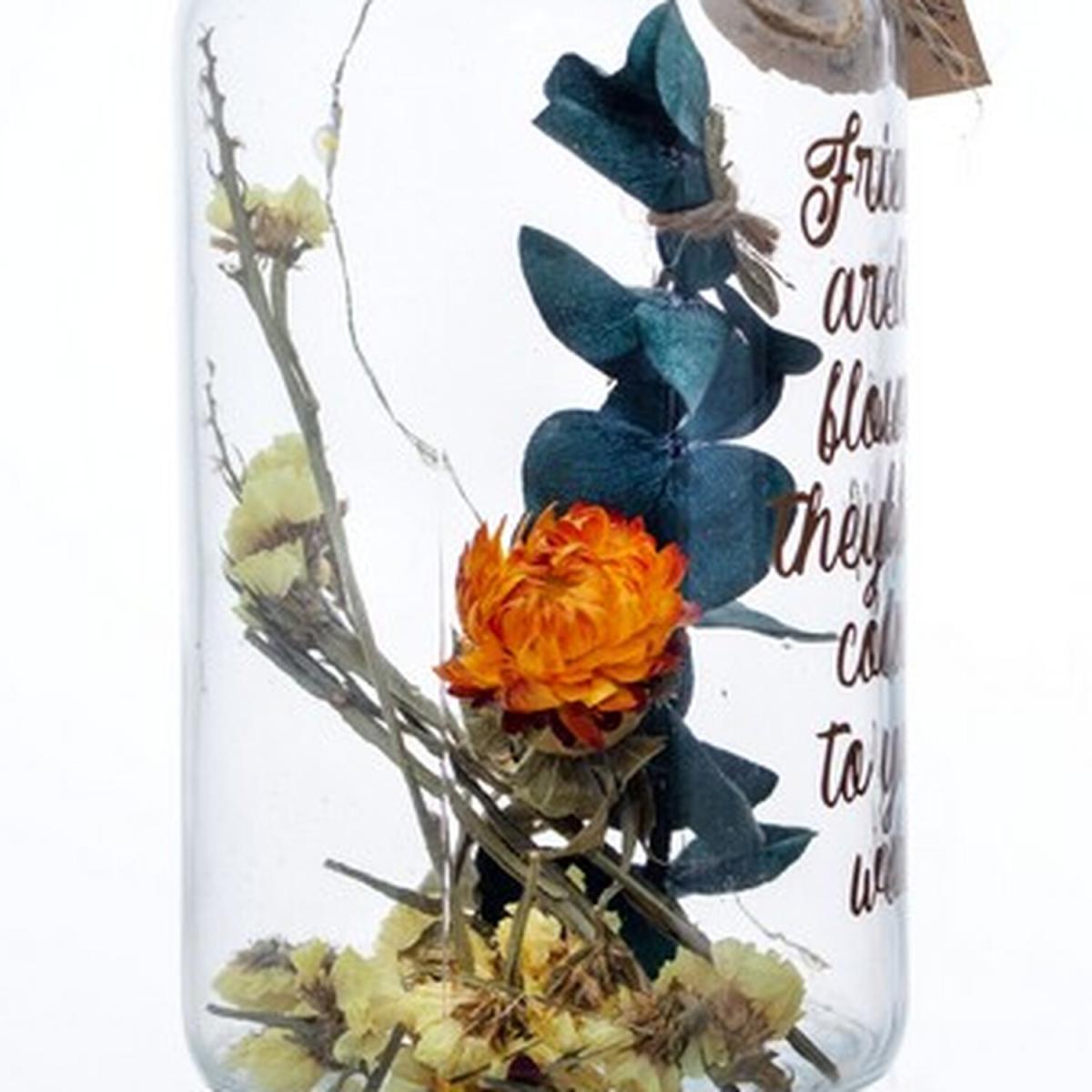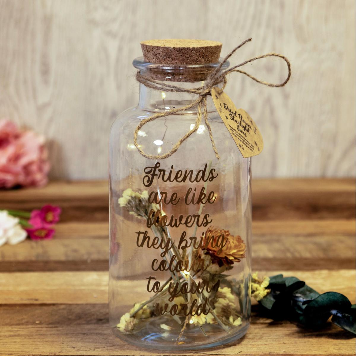 Shop our range of gorgeous Dried Flower Starlight Jars for the perfect sentimental homeware gift for a special friend! Filled with vibrant dried flowers and soft LED fairy lights, this gorgeous jar is perfect for beinging light into any home! Complete with a rustic cork stopper and heartfelt text decals that say 'Friends Are Like Flowers, They bring Colour To Your World', this light-up jar makes a beautiful unique gift for friends nearest and dearest to your heart!