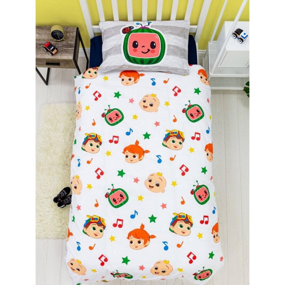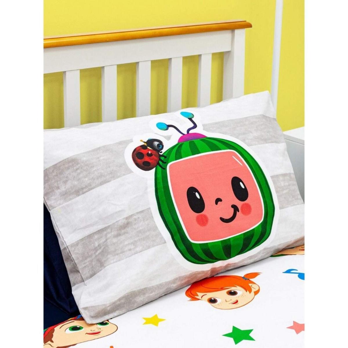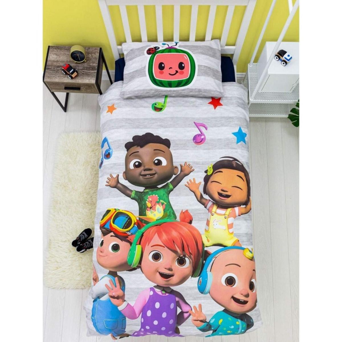 This official Cocomelon Friends Panel Single Duvet Cover and Pillowcase Set is a must for any little fans of the popular children's You Tube channel. The design features Melon, Cody, Nina, Tom. Tom, Yo Yo and J.J posing with various hand signals patterned with colourful stars and music note emotes, set on a white and grey marl background. The reverse has a repeat pattern of Melon, Tom. Tom, Yo Yo and J.J surrounded by more colourful stars and music notes. This single bedding set is suitable for machine washing and can be tumble dried on a cool setting.