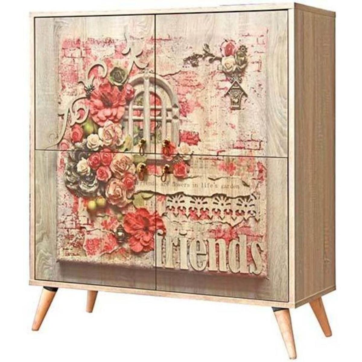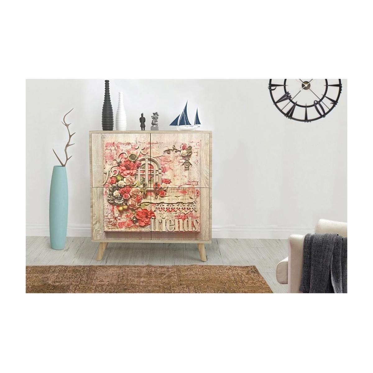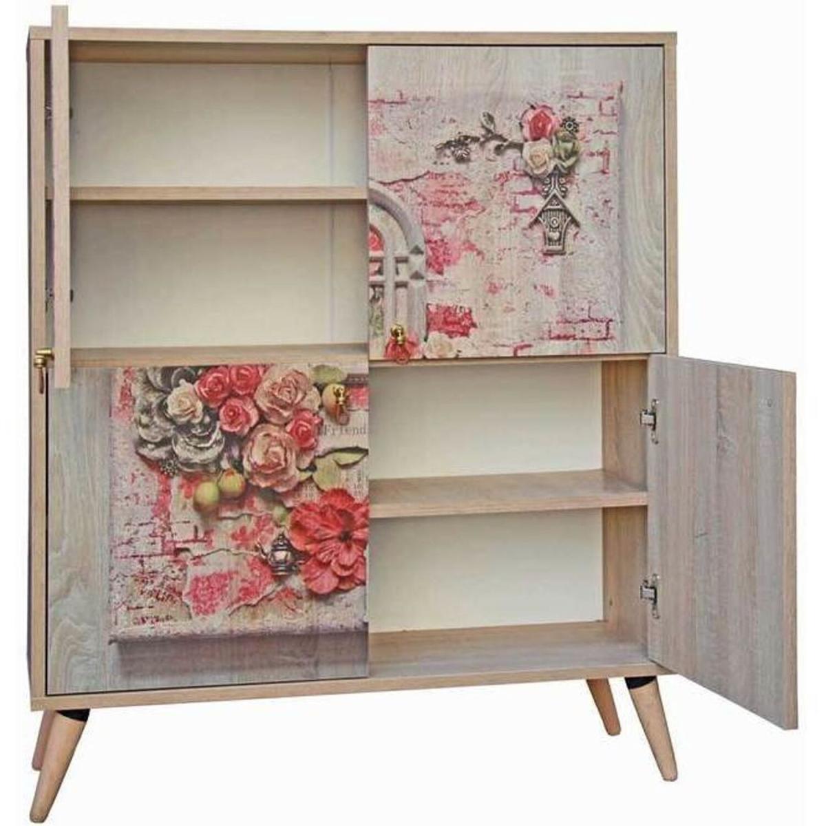This sideboard has an elegant and functional design. It has 4 doors and 4 shelves that offer ample amount of storage space for your needs. The doors have a madame-themed design made using ultraviolet digital printing technique. This technique increases the durability of the pattern against scratches and fading.
