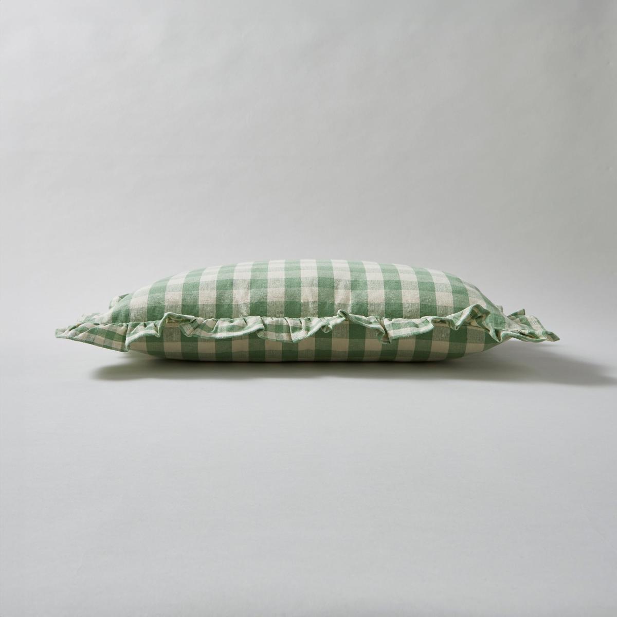 * Zip to secure inserted filling* Filled with recycled polyester* Machine washable Embrace the charm of our Frilled Gingham cushion in Green. The 30x50 size adds a touch of whimsy to your decor. Zip to secure the recycled polyester filling, and enjoy the ease of machine washability. Elevate your comfort with this delightful blend of frills and gingham.