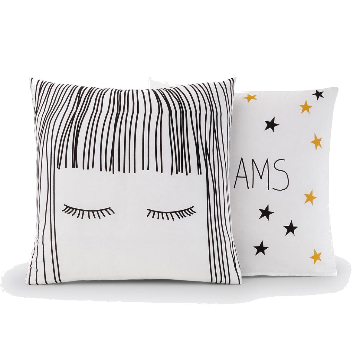 Fringe Printed Pillowcase. An on-trend illustration with sweet words, the Fringe set mixes black/white/gold stars and a message.. Cotton is part of our daily lives. We love it for its suppleness and softness. Easy Care, it is ideal for the beds of young and old alike!Product Details • 100% cotton • 144 thread count • Sack shape • One side with message, one side with stars. Care Advice • Machine washable at 60°C • By washing your laundry at 40°C instead of 60°C, you limit energy consumption. Dimensions • 63 x 63cm: Square pillowcase • OEKO-TEX® Standard 100. Standard 100 certification by OEKO-TEX® tests textile products for harmful substances via an independent, international label.