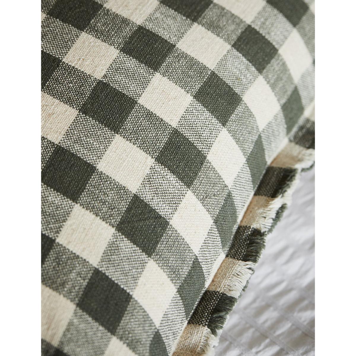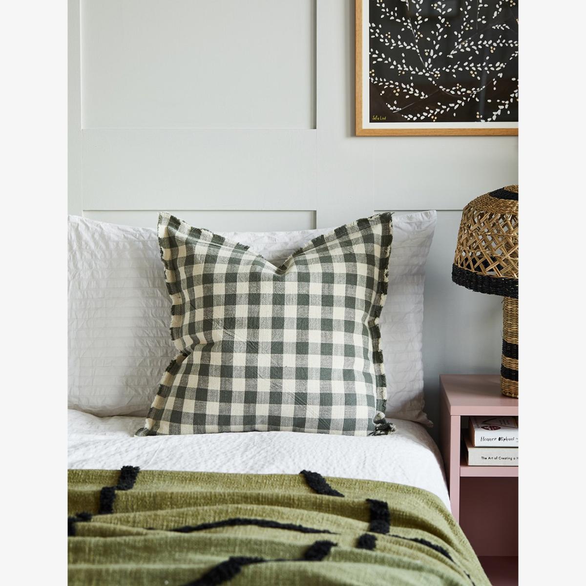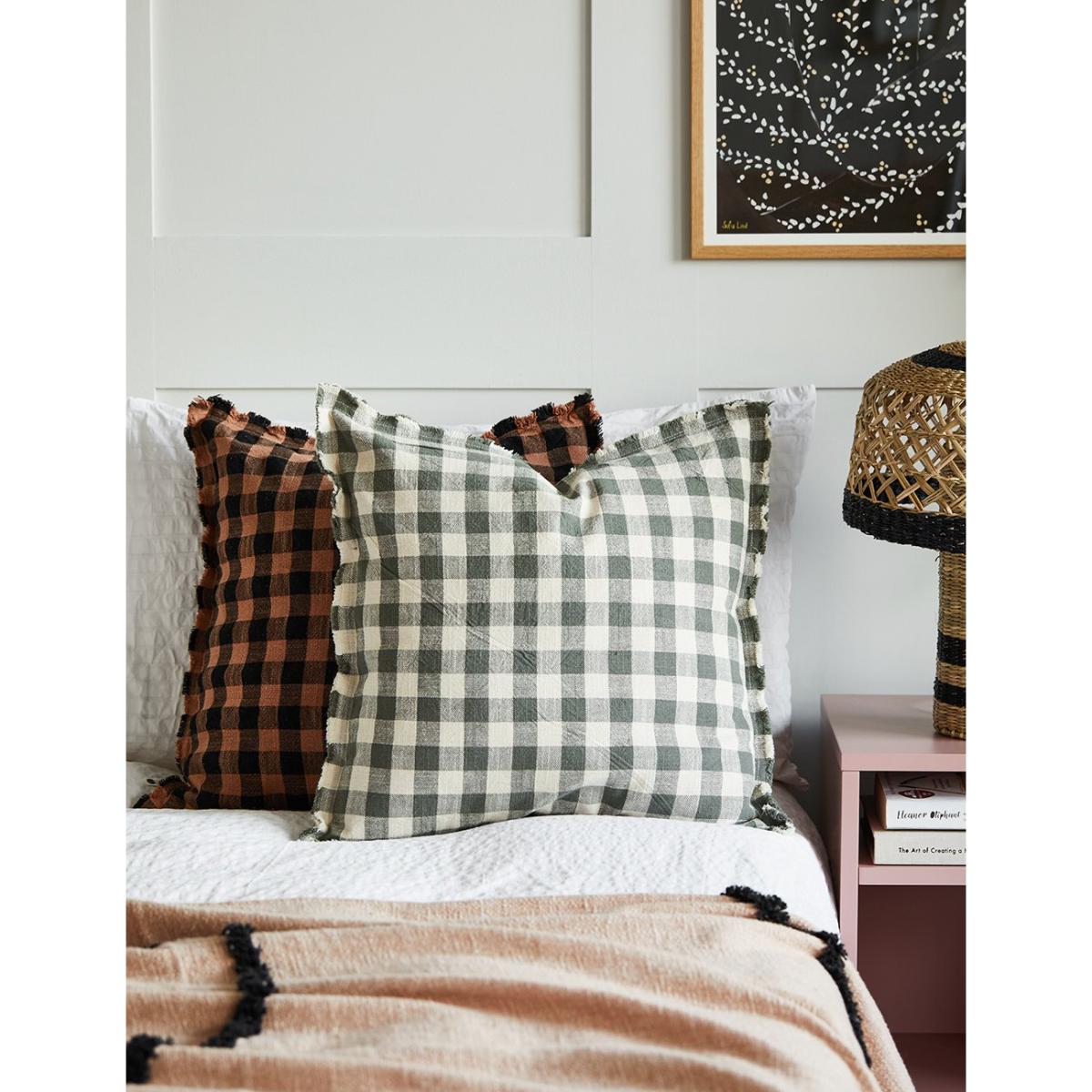 Rest your head on our Fringe Gingham Cushion. Filled with premium feather filling for extra comfort and luxury, our large check cushion features a two-tone design with sage green hues that are complimented by off-white tones. Boasting a soft texture and fringe edge detail, this statement cushion cover adds a charming and luxurious touch to the room. Our decorative check cushion is available in a two-toned black and rust colour to suit a moodier home interior style.