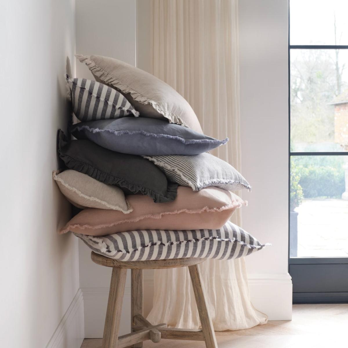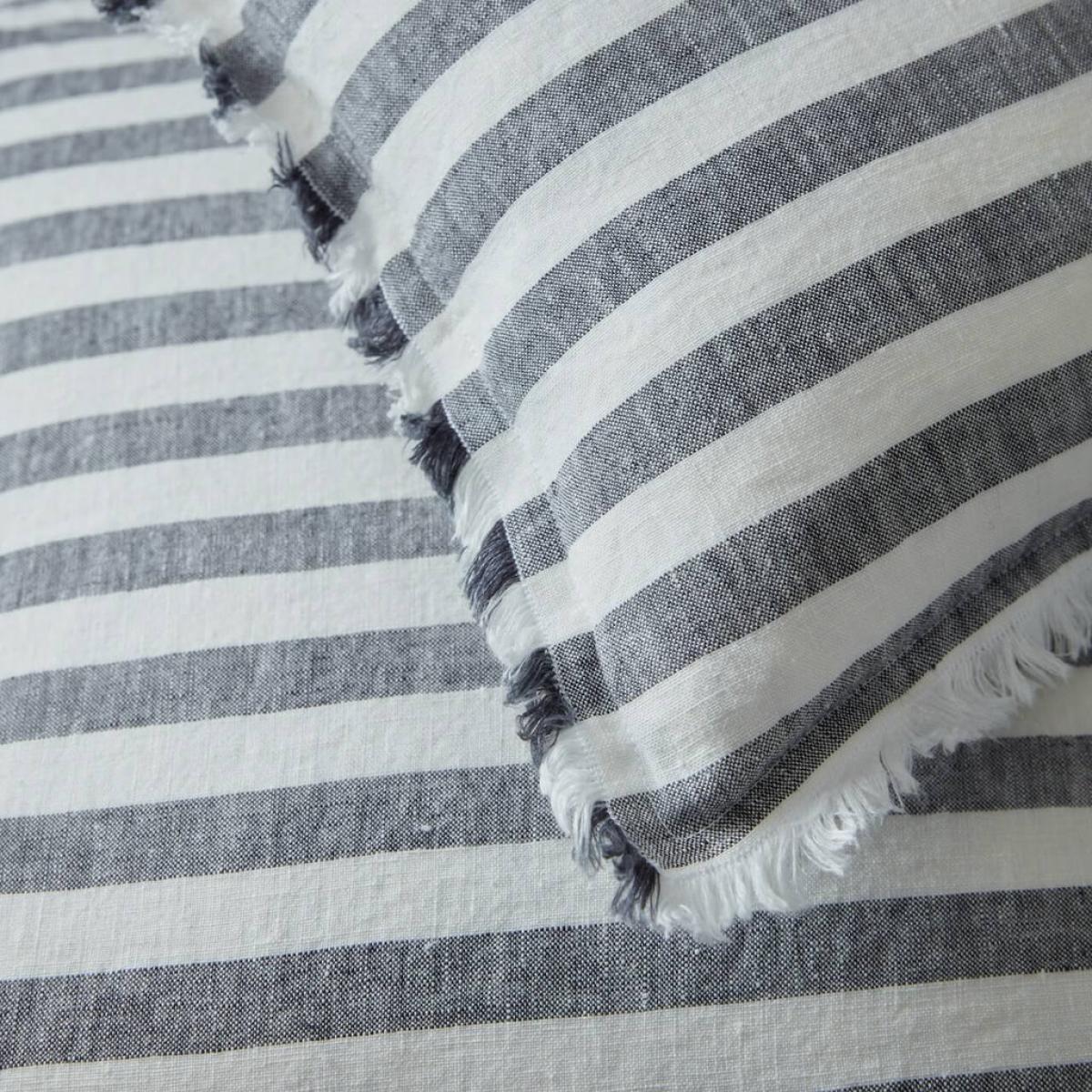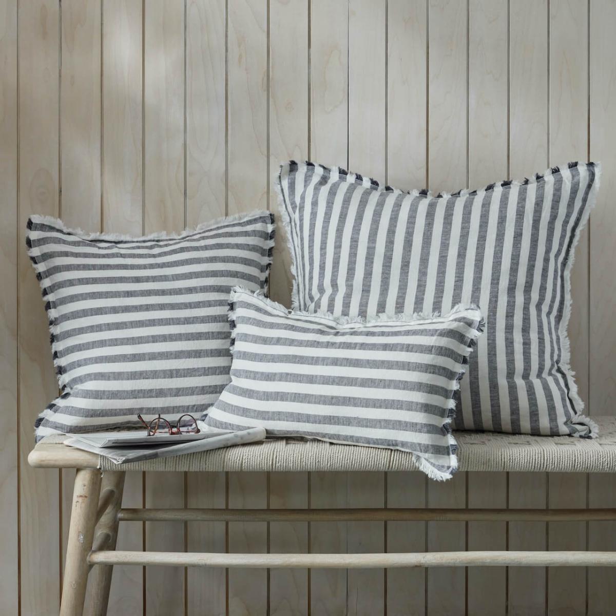 Bang on trend, our love of stripes is going nowhere fast. It's fair to say that these new thick striped addition to our linen cushion cover range are a huge hit within the Layered Lounge team. Woven from a combination of ink and antique white coloured linen they are finished off with a frayed edge which beautifully highlights the stripe effect. A perfect choice for sprucing up your summer bed or sofa.