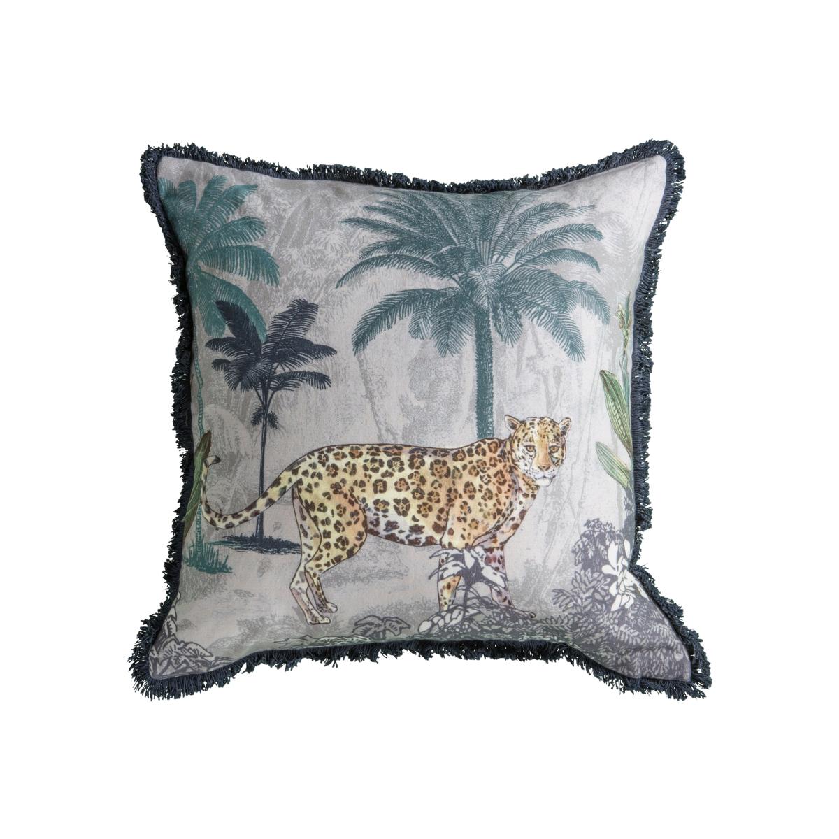 Create a statement full of style and boldness in your home with this animal themed design of a fierce leopard. This square shaped cushion is made from 100% cotton, has a plain grey velvet reverse to suit a contemporary home décor colour scheme and a black fringing detail for added elegance.