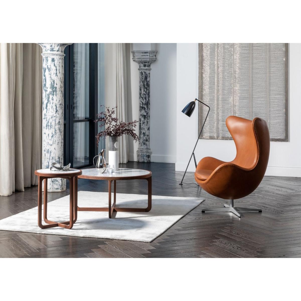 The Egg™ is one of the triumphs of Jacobsen’s total design - a sculptural contrast to the building’s almost exclusively vertical and horizontal surfaces. The Egg sprang from a new technique, which Jacobsen was the first to use; a strong foam inner shell underneath the upholstery. Experience originality and timeless design with the Egg in fabric and indulge in its sculptural curves that will last for generations. When Arne Jacobsen in the end of the 1950s designed the SAS Royal Hotel in Copenhagen, he too created the Egg™, the Swan™, the Swan Sofa™, the Series 3300™ and the Drop™. With this furniture, Arne Jacobsen wrote history within Danish design worldwide.