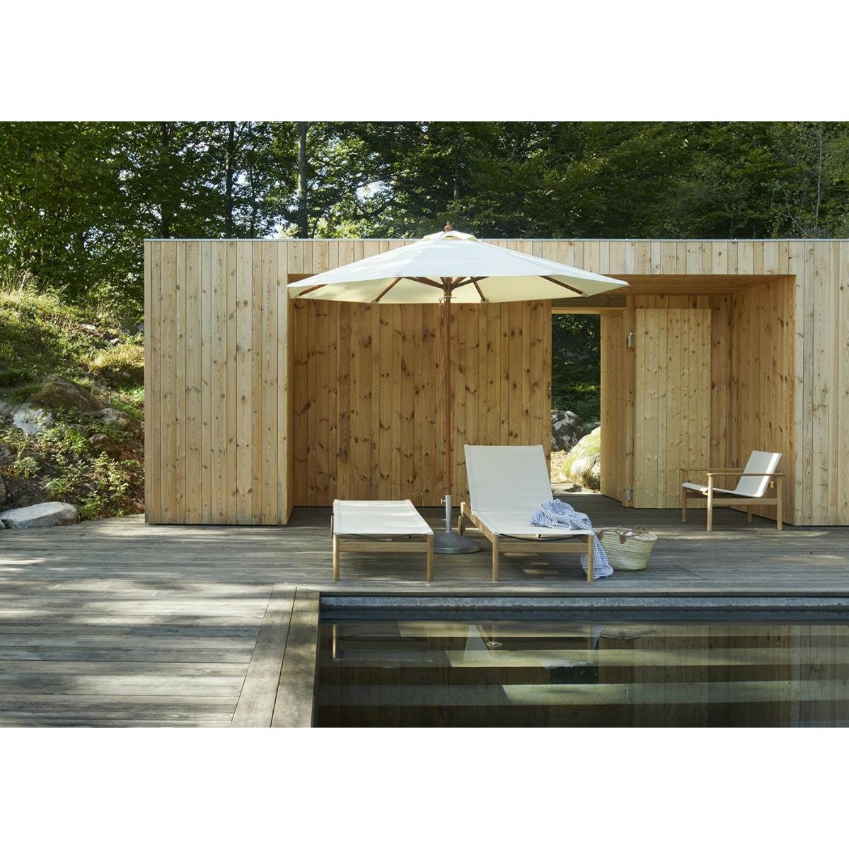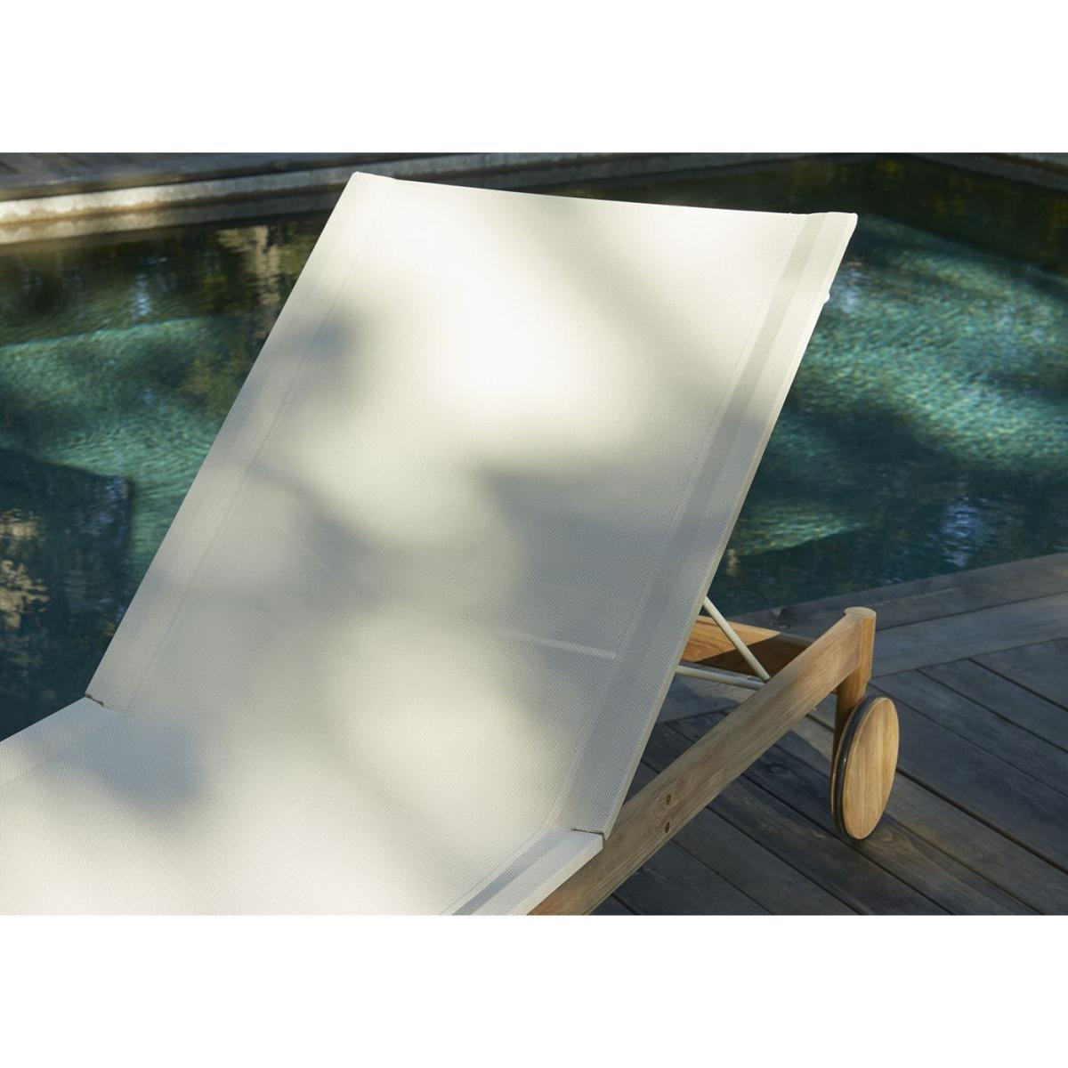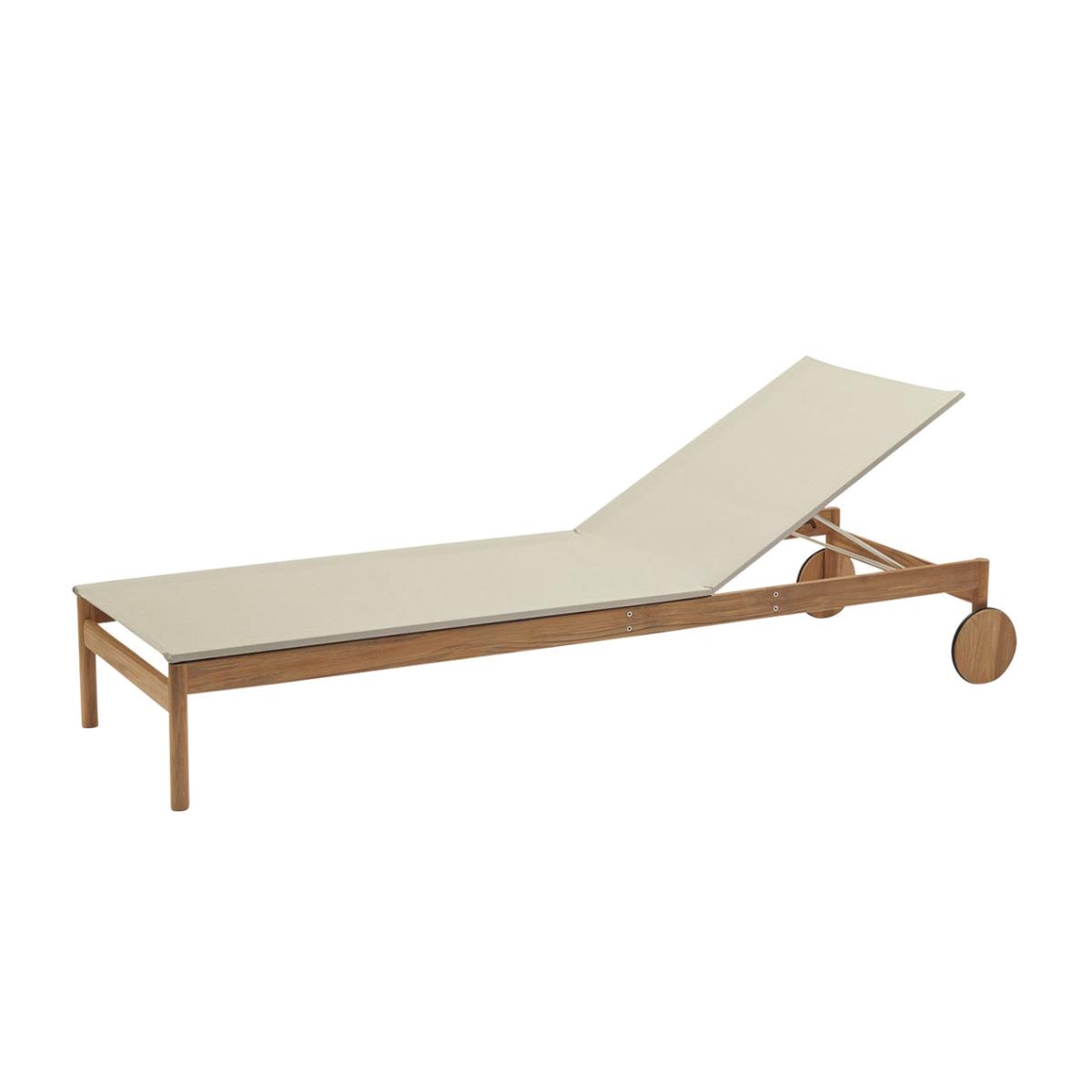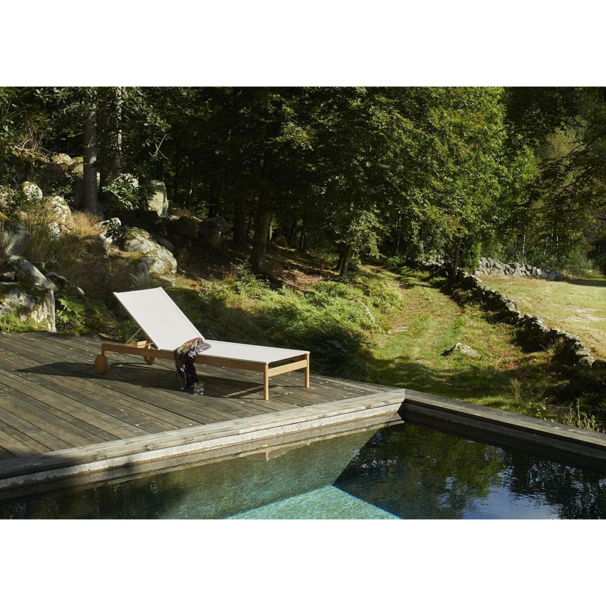 The Pelagus Sunbed is designed for total relaxation and aesthetic pleasure, with a distinctive yet understated design language. Supremely comfortable and flexible, it offers five reclining positions for lying down, reclining, or sitting. The well-crafted, 100% FSC-certified teak frame is both expressive and simple, while archetypal wooden wheels make it easy to move and follow the sun. The weatherproof sling textile seat adds a modern edge with its lightness and transparency.