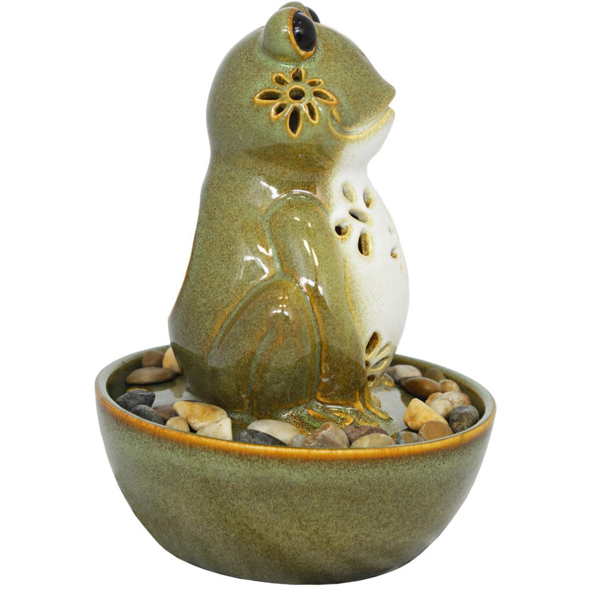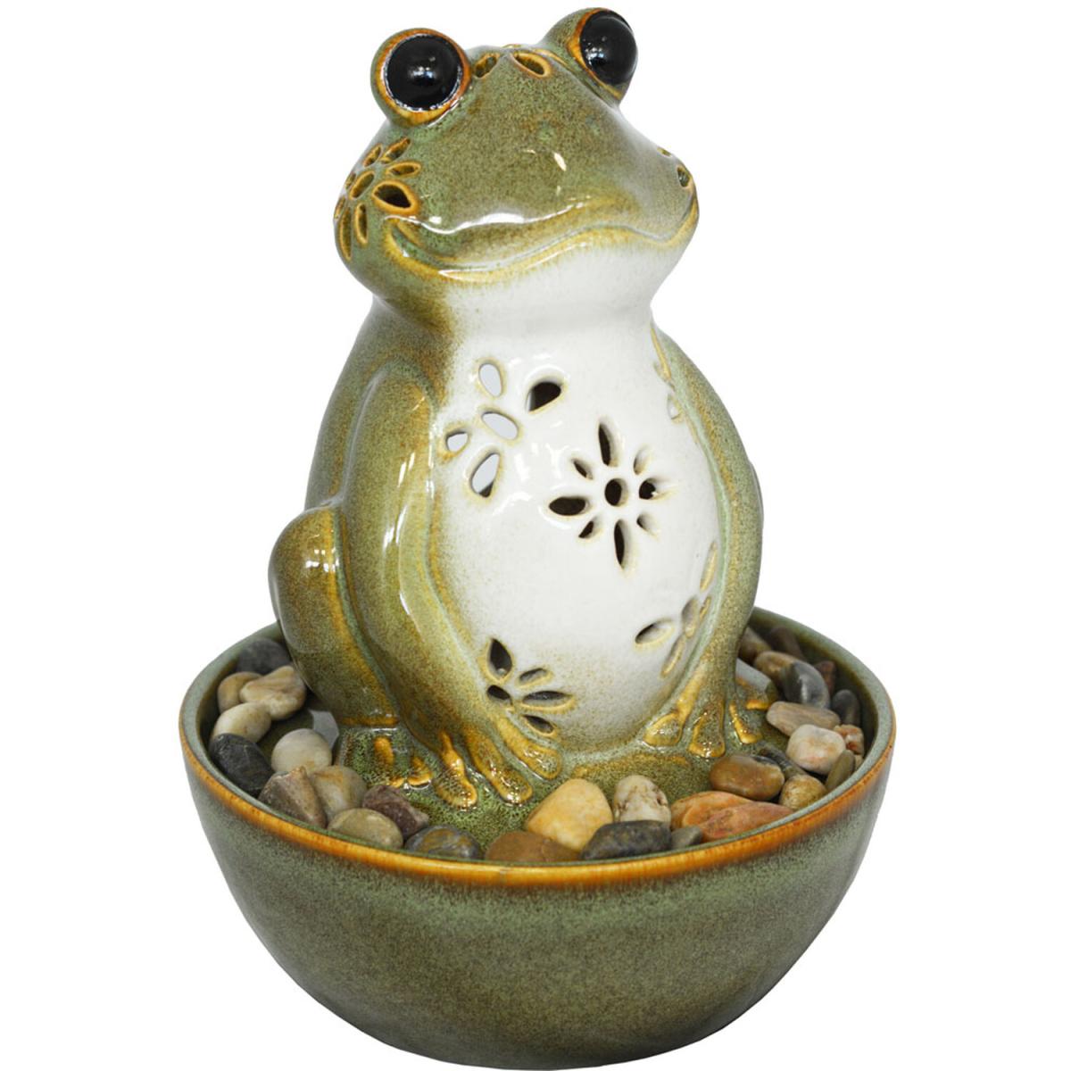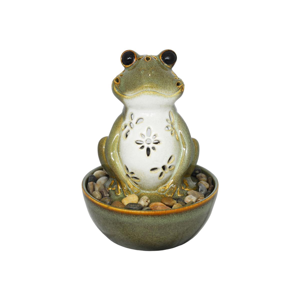Cute decorative Frog indoor water feature complete with real mini pebbles on the base and LED light to shine out through the filigree holes. The water bubbles inside the Frogs tummy to create a trickling cascade. Made from ceramic with cut outs to let the light shine through and completed with a beautiful detailed glazed finish. Ideal for indoor spaces this compact self contained water feature would look great in any room in the home. Comes supplied with 3 pin plug - for indoor use only. Pump is 180lh with variable flow. The pump vibration will naturally cause a minor humming sound on some surfaces. Please note, the water recirculates and will need replacing from time to time and evaporation will occur, please ensure the fountain is periodically topped up.