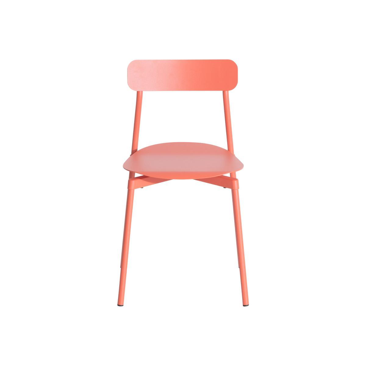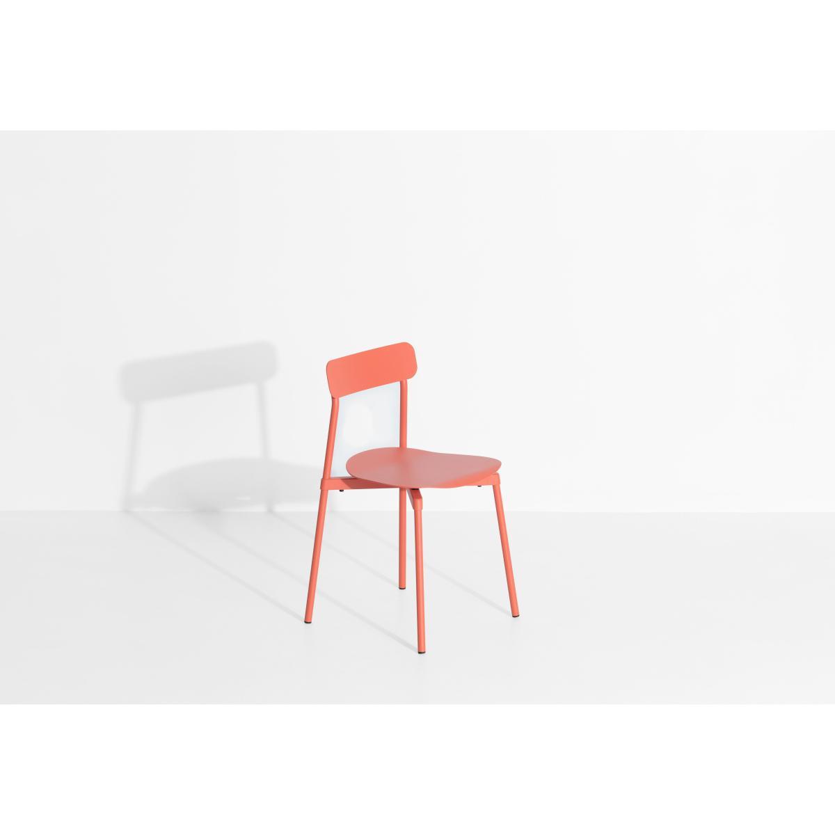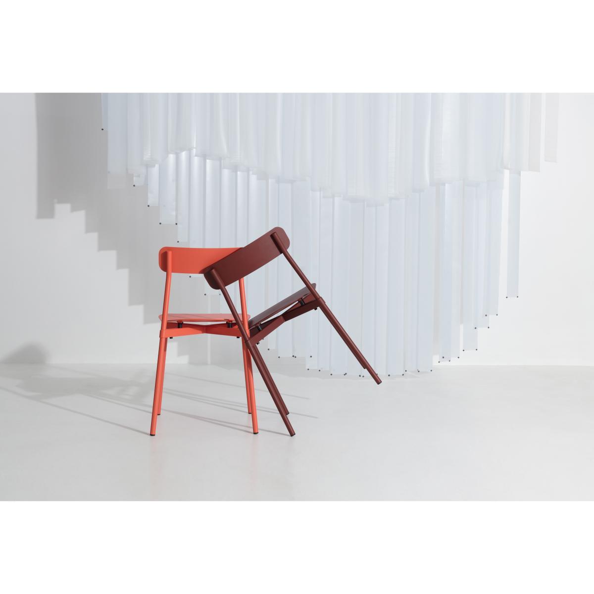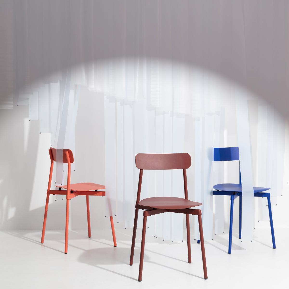 Competition chair. Pure lines and incredible lightness for this aluminium chair with its extremely successful design. A real featherweight (just 4 kilos), this chair is rock solid thanks in particular to a specific and very technical assembly of the different parts. Highly ergonomic, the Fromme chair stands out with the absorbers placed under the seat which, like shock absorbers on a car, provide flexibility and suppleness for optimal comfort. The slightly curved shape of the seat and inclined plane on its front further increase comfort. A confirmed cyclist, Canadian designer Yom Chung used to climb Fromme Mountain outside Vancouver and was fascinated by the technical performance of his bike. He sought to rediscover the efficiency it brought him to reinvent the most common object and yet the greatest challenge for a designer: a chair. This new addition to the line of avant-garde products from Petite Friture proves once again that the brand gives young designers a chance and trusts them to create key pieces for its collections. Each colour gives a new conception of the sleek design of this incredibly light and efficient chair. Made of aluminium, it can be used both indoors and out and is easily stackable.