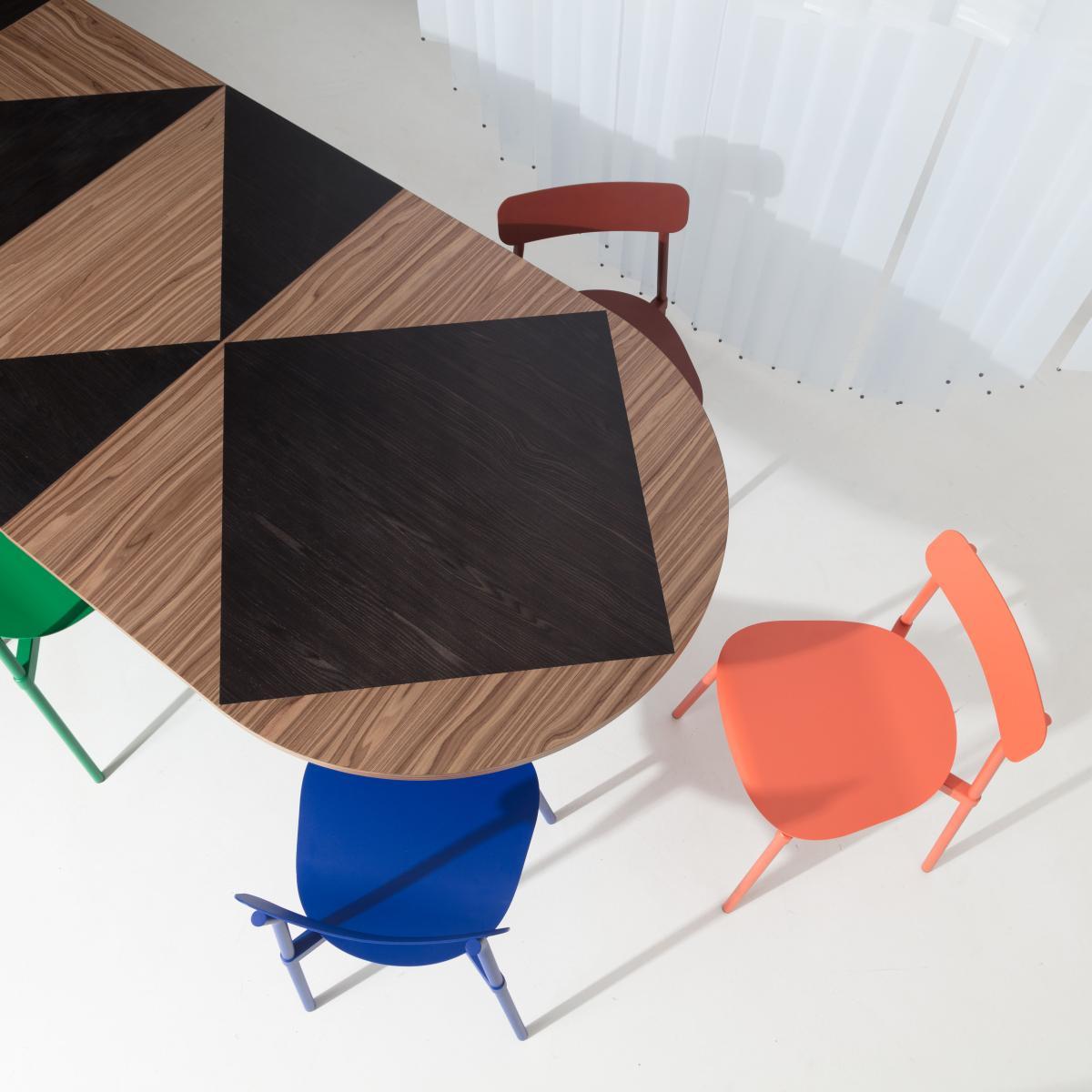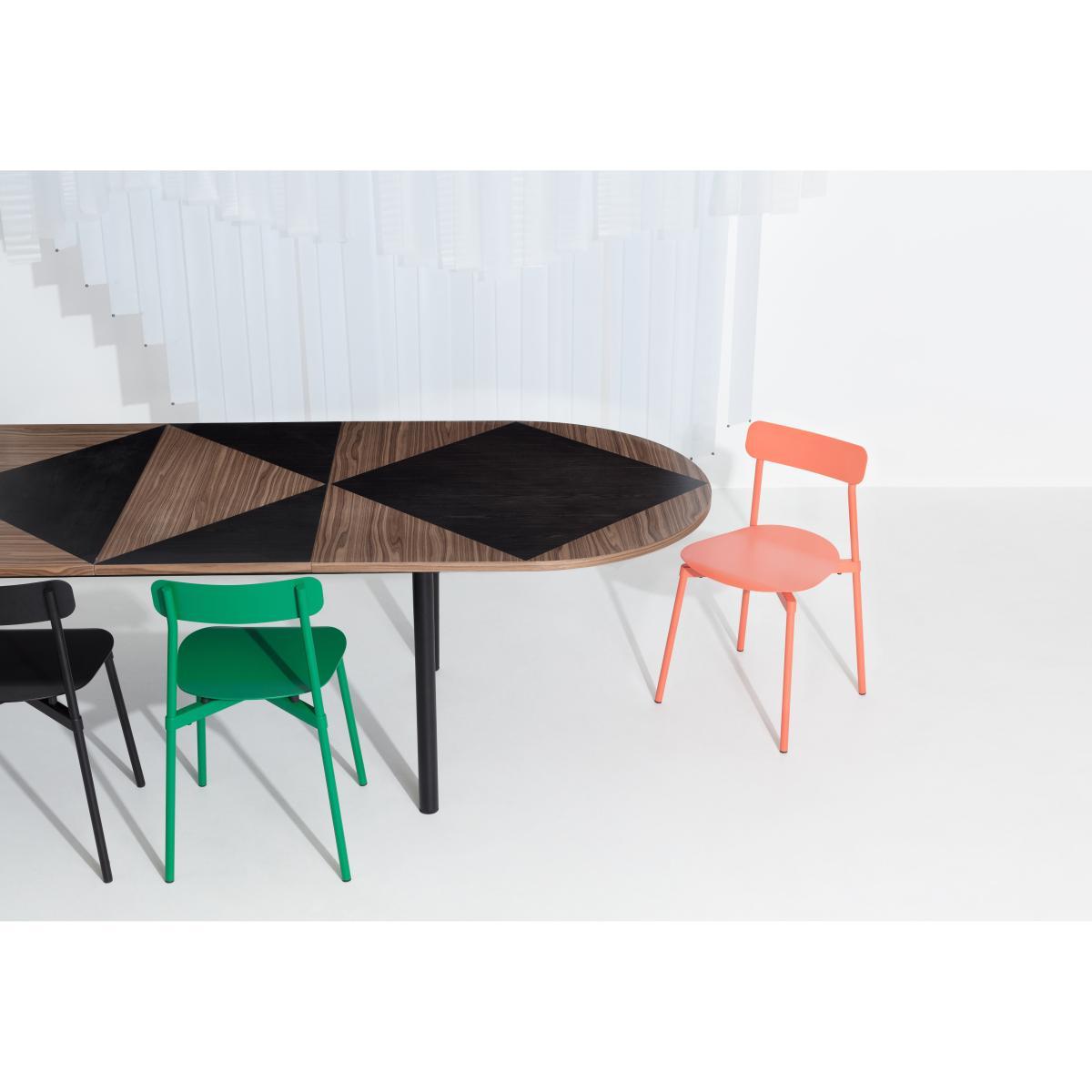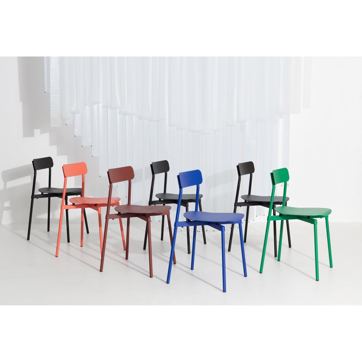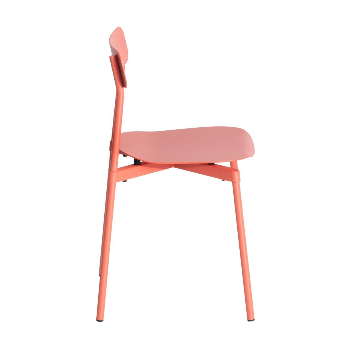 Competition chair. Pure lines and incredible lightness for this aluminium chair with its extremely successful design. A real featherweight (just 4 kilos), this chair is rock solid thanks in particular to a specific and very technical assembly of the different parts. Highly ergonomic, the Fromme chair stands out with the absorbers placed under the seat which, like shock absorbers on a car, provide flexibility and suppleness for optimal comfort. The slightly curved shape of the seat and inclined plane on its front further increase comfort. A confirmed cyclist, Canadian designer Yom Chung used to climb Fromme Mountain outside Vancouver and was fascinated by the technical performance of his bike. He sought to rediscover the efficiency it brought him to reinvent the most common object and yet the greatest challenge for a designer: a chair. This new addition to the line of avant-garde products from Petite Friture proves once again that the brand gives young designers a chance and trusts them to create key pieces for its collections. Each colour gives a new conception of the sleek design of this incredibly light and efficient chair. Made of aluminium, it can be used both indoors and out and is easily stackable.