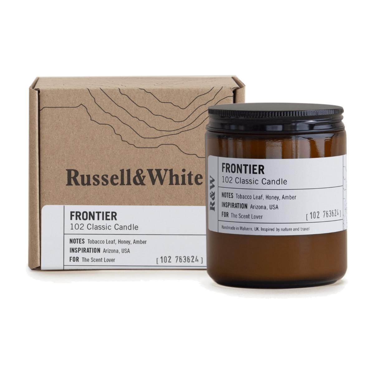 A scent evoking the days exploring wild deserts, rustic terrains and hot springs across Western America. The smoky aroma of tobacco leaf, combined with sweet honey and warm amber produces a subtly addictive scent. Our most-popular size, the classic candle fits all occasions and fragrances every type of room or space. Made using 100% soy wax and set in an amber glass jar with a single cotton/linen mix wick, topped with an aluminium screw top lid. Enclosed within a signature Russell & White box, inspired by the hills in our hometown of Malvern.