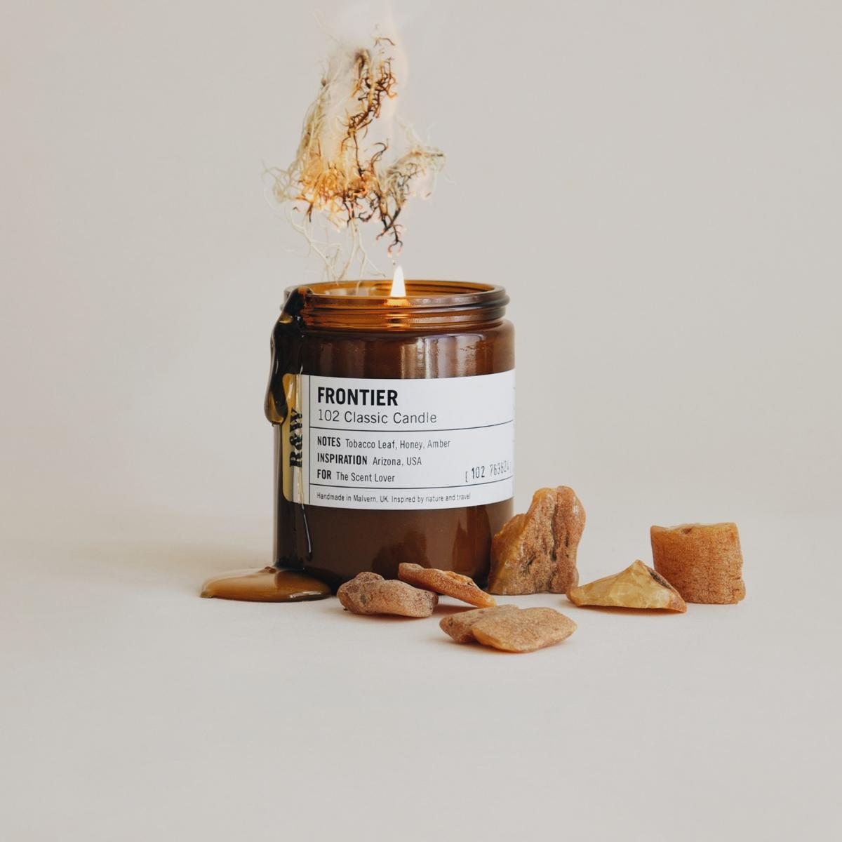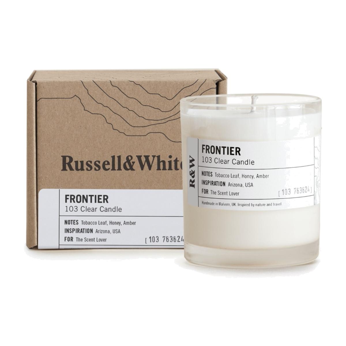 A scent evoking the days exploring wild deserts, rustic terrains and hot springs across Western America. The smoky aroma of tobacco leaf, combined with sweet honey and warm amber produces a subtly addictive scent. Our clear candle fits all occasions and fragrances every type of room or space. Made using 100% soy wax and set in a clear glass jar with a single cotton/linen mix wick. Enclosed within a signature Russell & White box, inspired by the hills in our hometown of Malvern.