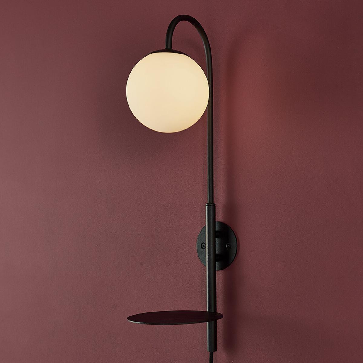 Gain a clever spot for a phone or book as well as wonderful illumination with the Frosinone Satin Black Paint and Matt Opal Glass Wall Lamp. It has a lovely opal glass globe for warm light and sleek style. Perfect next to a bed, sofa, or favourite chair this lamp would be a stylish touch to any interior.