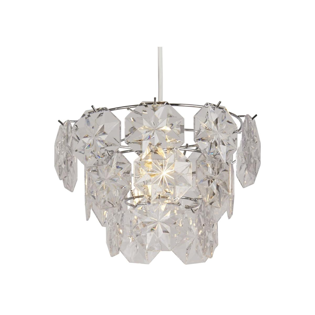 Adding depth to any room, the Frost Tiered Ceiling Shade is constructed with mild steel, stainless steel, and acrylic materials, offering durability and style. Its chrome and clear finish enhances its sleek appearance, while the acrylic shade provides a clear, textured design that adds visual interest. Versatile and compatible with any interior decor, this shade is a perfect addition to your home or office space. Bulb not included. We recommend B22, E14 or E27 bulbs, 7. W.