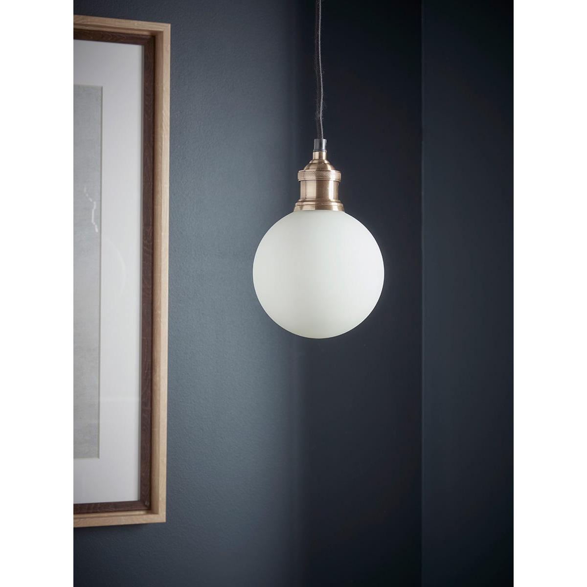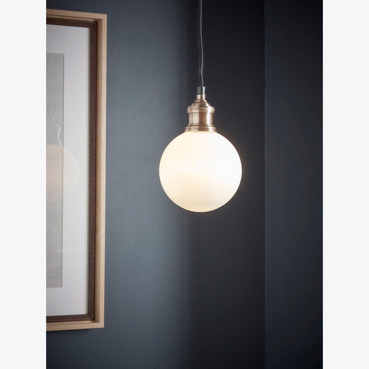 With a milky white frosted globe shade and antiqued brass fixtures, this elegant pendant lamp will bring a gentle ambient light to your space. With timeless appeal, this classic pendant will elevate in a contemporary bedroom, kitchen or hallway. Discover how to create the perfect lighting scheme for your home using our Lighting Buying Guide.