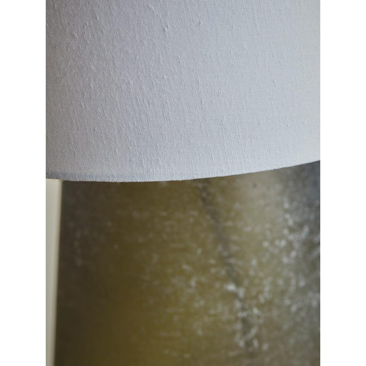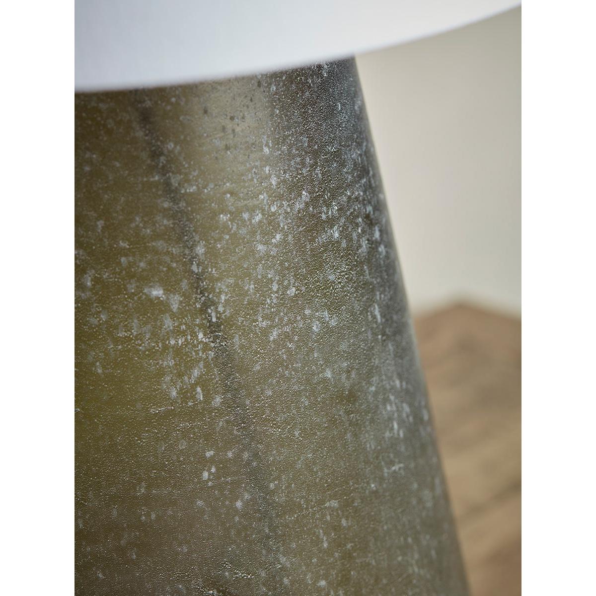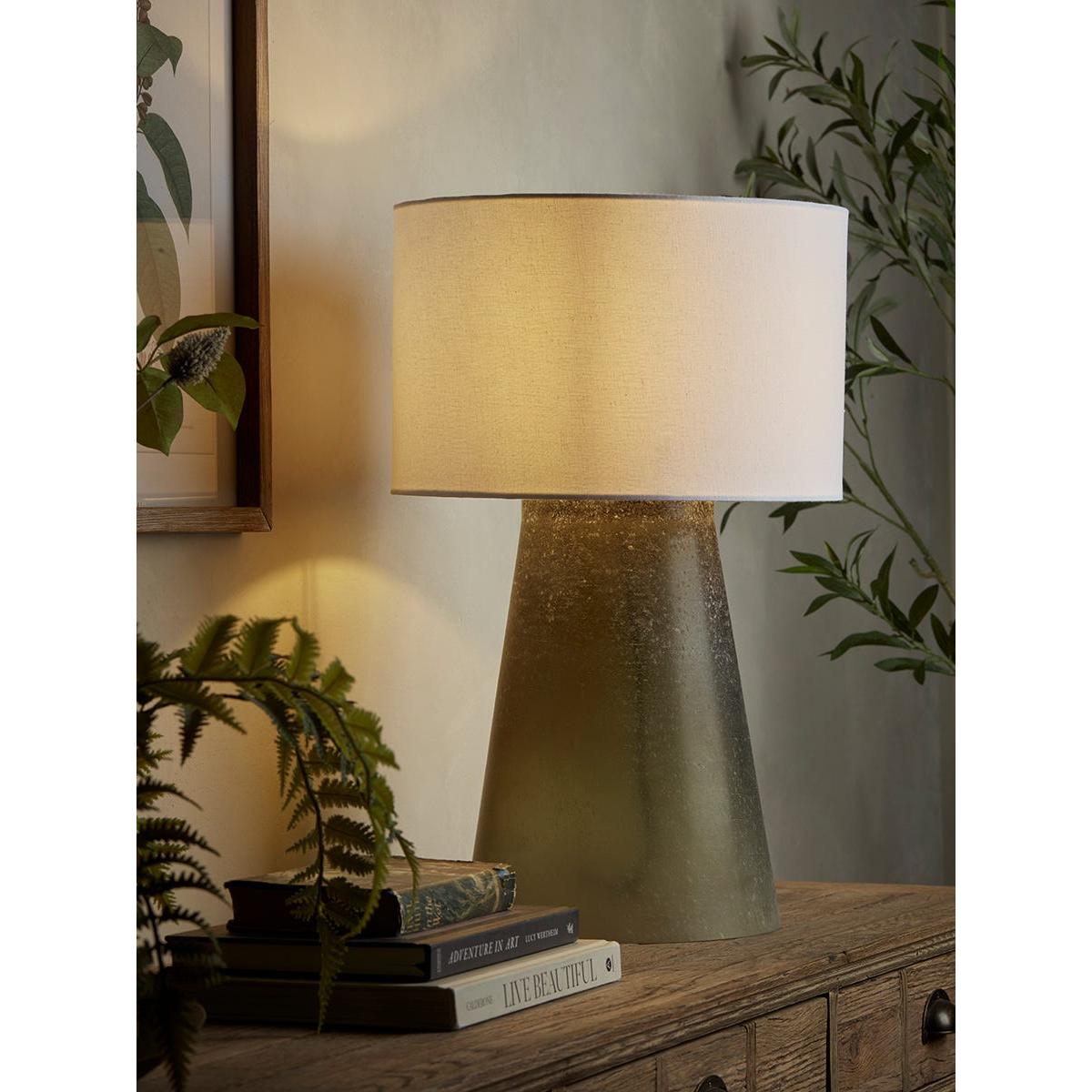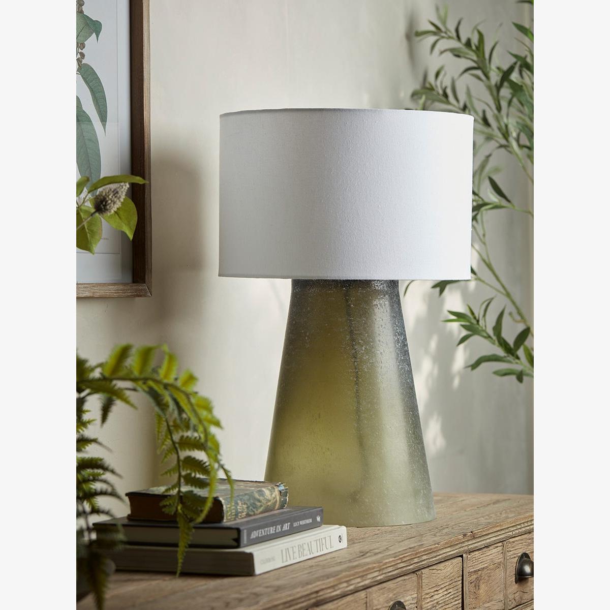 Keep your home well-lit and full of colour with our Frosted Green Glass Table Lamp. A tapered base is crafted from a frosted glass that has wonderful tones of green, adding a subtle brightness to your home. Contrasted with the light cotton shade, the glow of the bulb brings the green tones to life and brings a wonderful energy to wherever you choose to place this lamp. Discover how to create the perfect lighting scheme for your home using our Lighting Buying Guide.