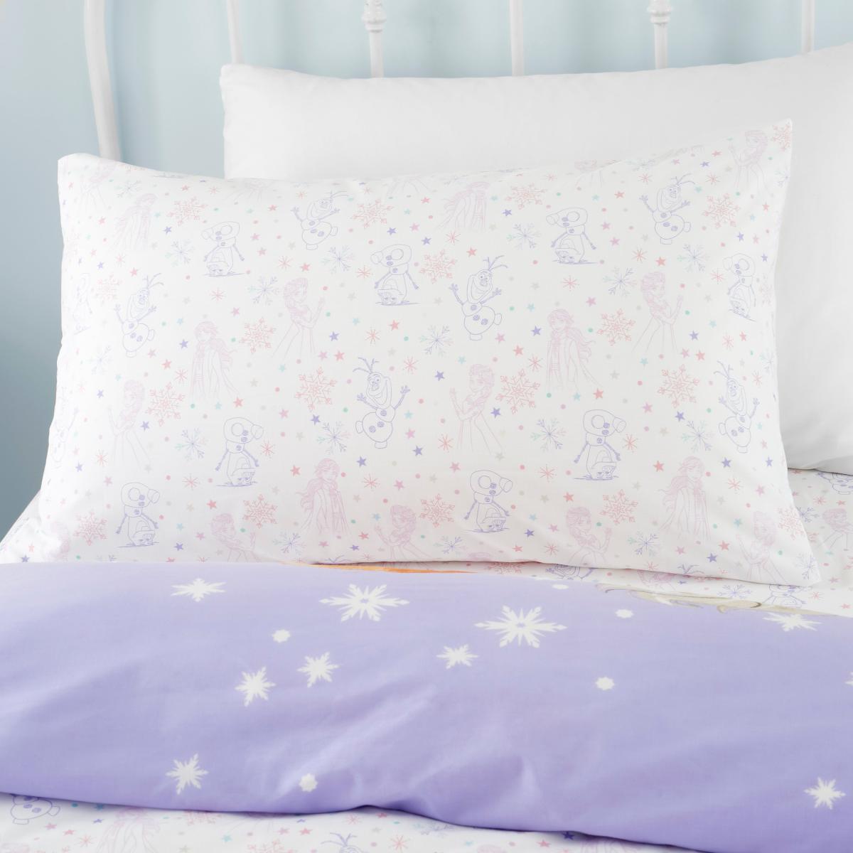 Featuring some of your favourite Frozen characters, this duvet cover set is a fun way to dress your little one's bed. A pastel Olaf print decorates the reverse of this duvet cover set. Crafted from a polycotton material, the set is easy to care for and is fully machine washable. The duvet cover set has been finished with a button closure which helps secure the cover around the duvet whilst in use. Pair the duvet cover with the matching fitted sheet for a coordinated look. This collection is verified by OEKO-TEX® and independently tested for harmful substances as well as manufactured using sustainable processes.