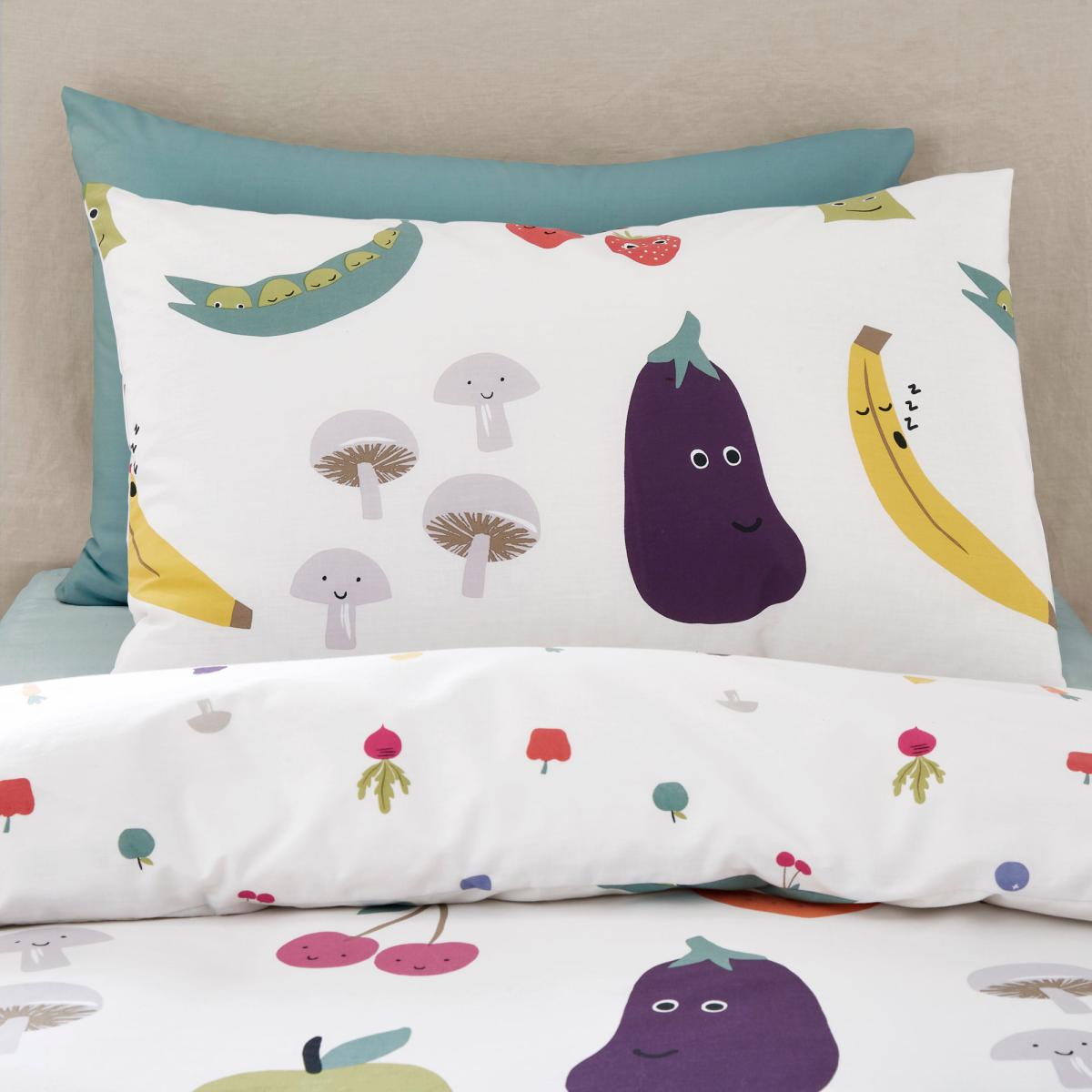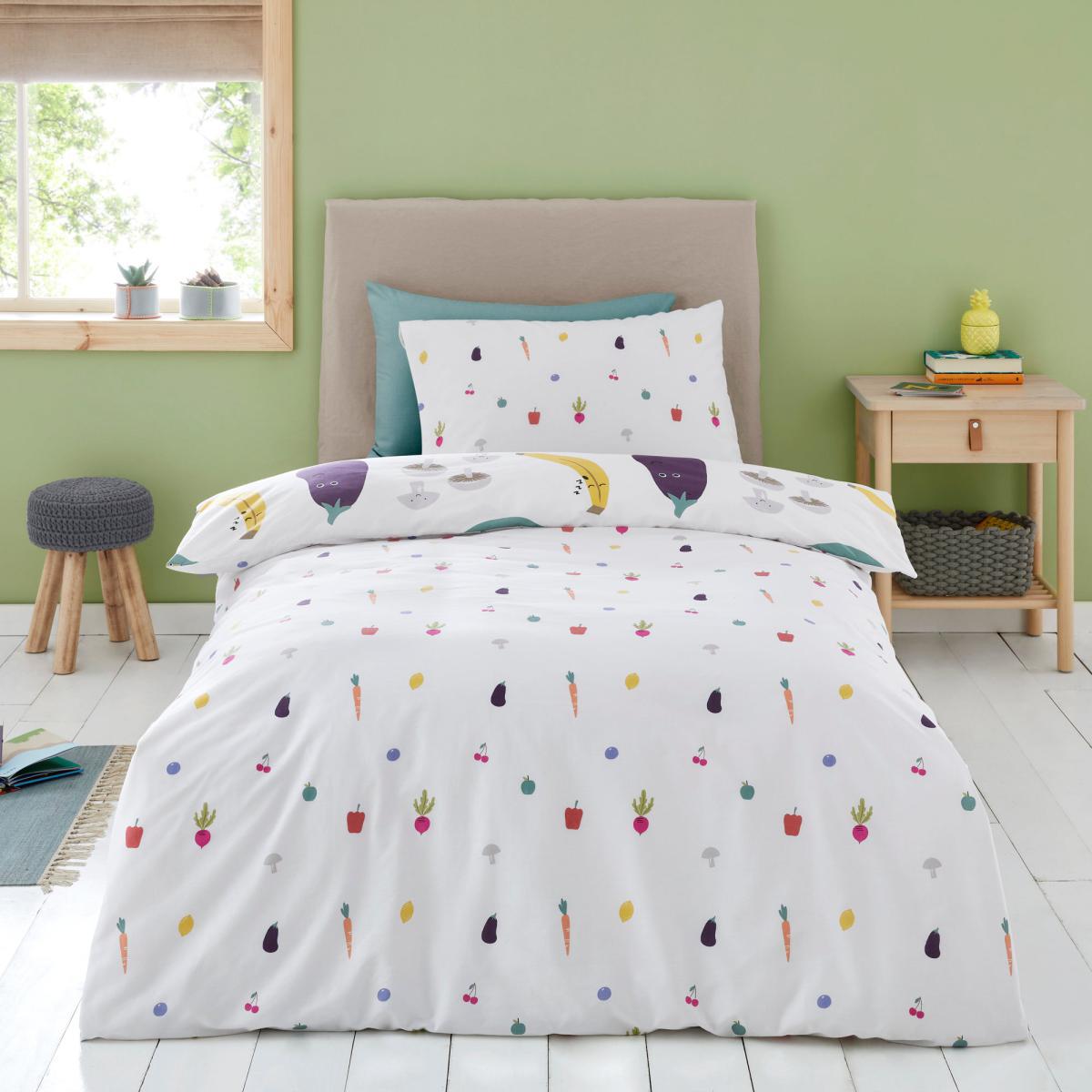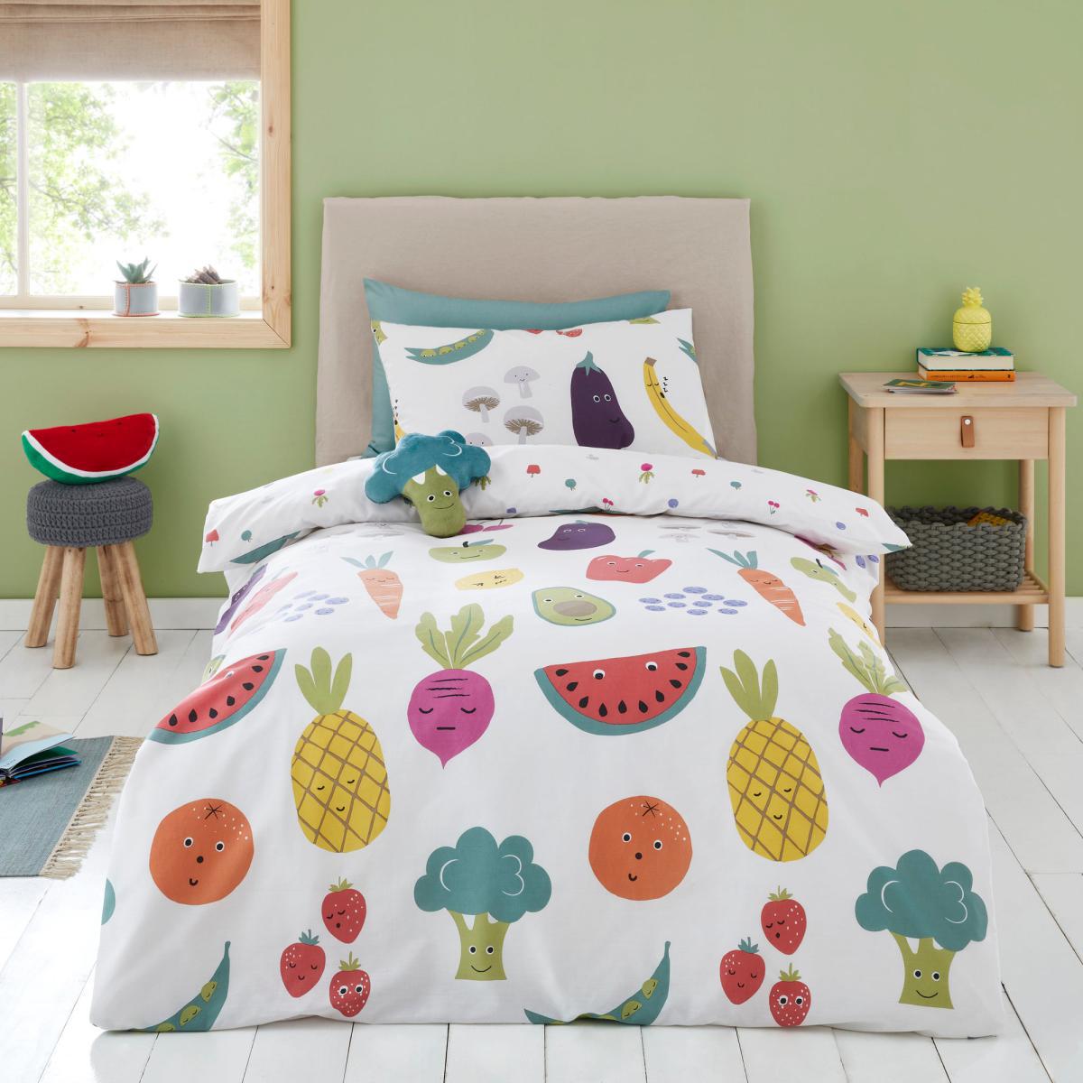 Boasting an education design, this. Fruit and Vegetables Duvet Cover and Pillowcase Set is perfect for helping your kids learn in a fun way. With a fully reversible design, you can choose between two fun prints. Made from 100% cotton, this bedding set is soft, durable, and machine washable. This collection is verified by OEKO-TEX® and independently tested for harmful substances as well as manufactured using sustainable processes under socially responsible working conditions. MADE IN GREEN by OEKO-TEX® is a unique product label to trace the countries and production facilities - search the product label for more information on. Here.