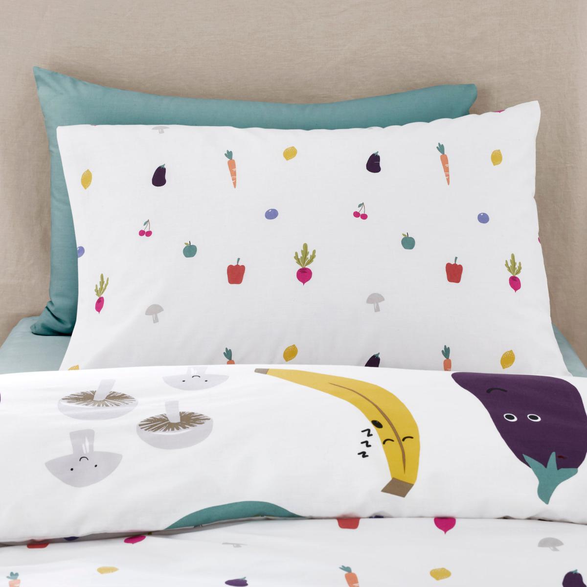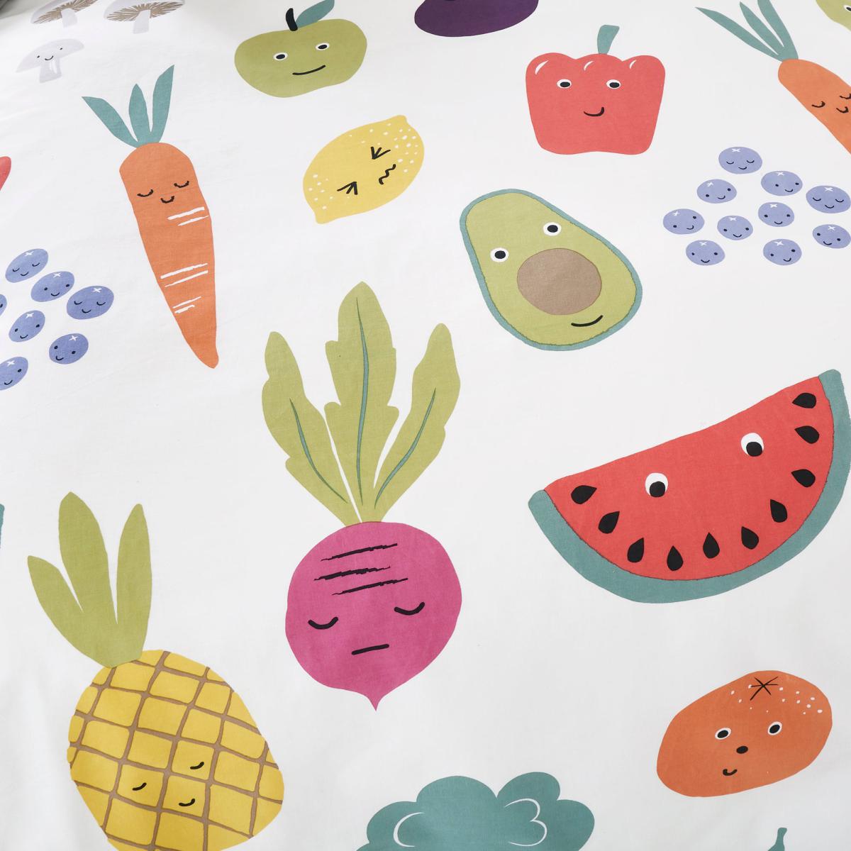 Fruit and Vegetables Reversible 100% Cotton Duvet Cover and Pillowcase Set White, Blue and Yellow