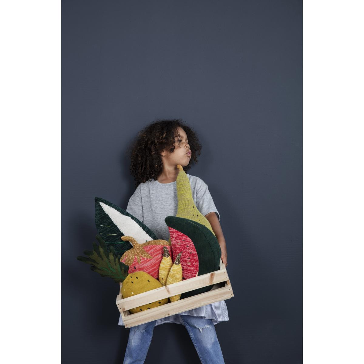 Tropical inspiration for these knitted juicy fruit shaped cushions! Fun and colourful, these cushions add a touch of exoticism, softness and poetry to your decoration. Children will love playing with these oversize fruit that are half way between a cushion and a toy. They can play shop. Environmentally friendly, these cushions are in 100% organic cotton. For the children's collection, the founder and designer of the Danish brand Trine Andersen, has designed a series of objects with simple and colourful patterns in a Scandinavian spirit, where design, quality and nature are intimately linked.