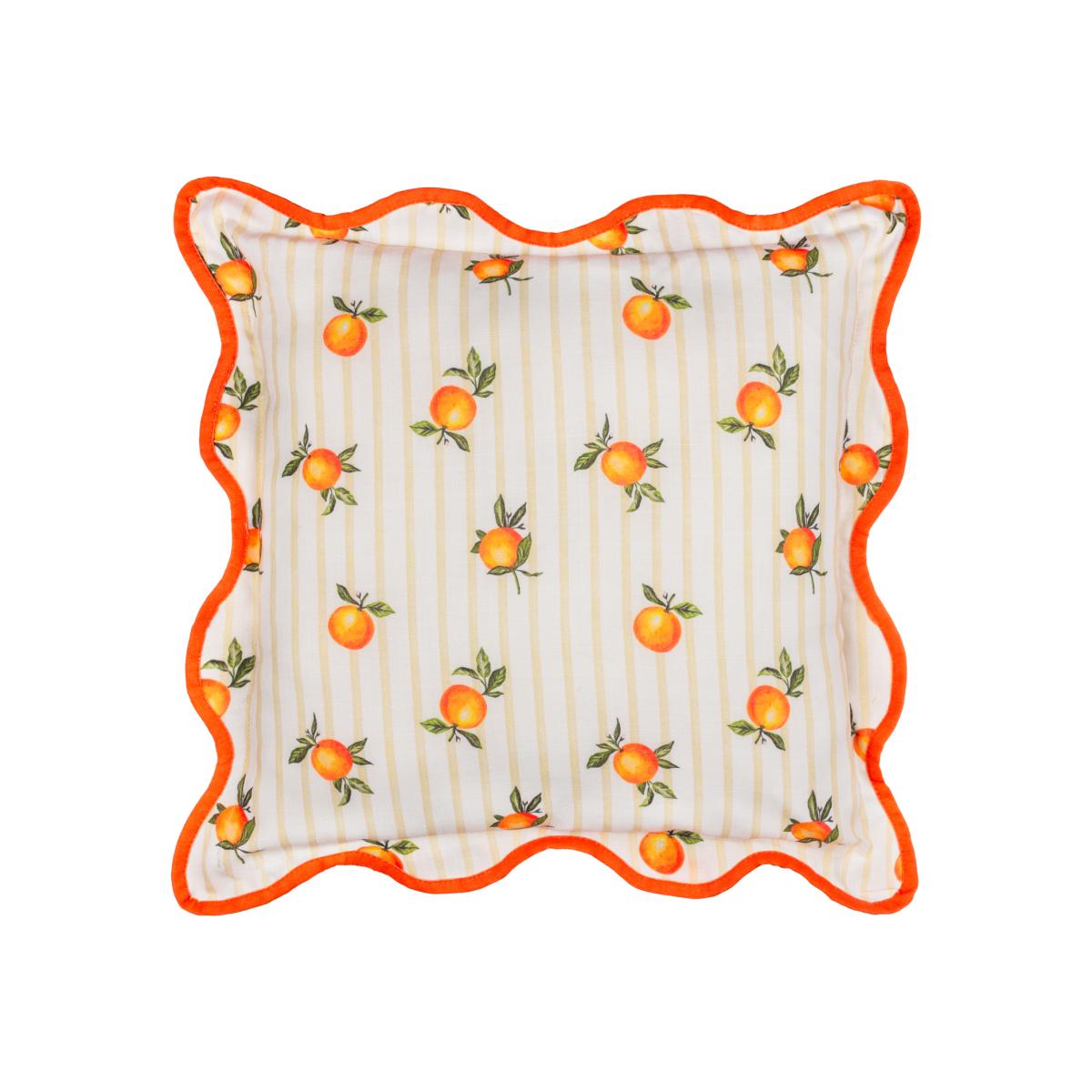 Transform your outdoor space with this charming Fruits Oranges Outdoor Cushion, featuring hand-painted oranges against delicate stripes and finished with playful wiggle trim. Crafted from soft material with water-repellent coating, it's perfect for both garden gatherings and indoor styling.