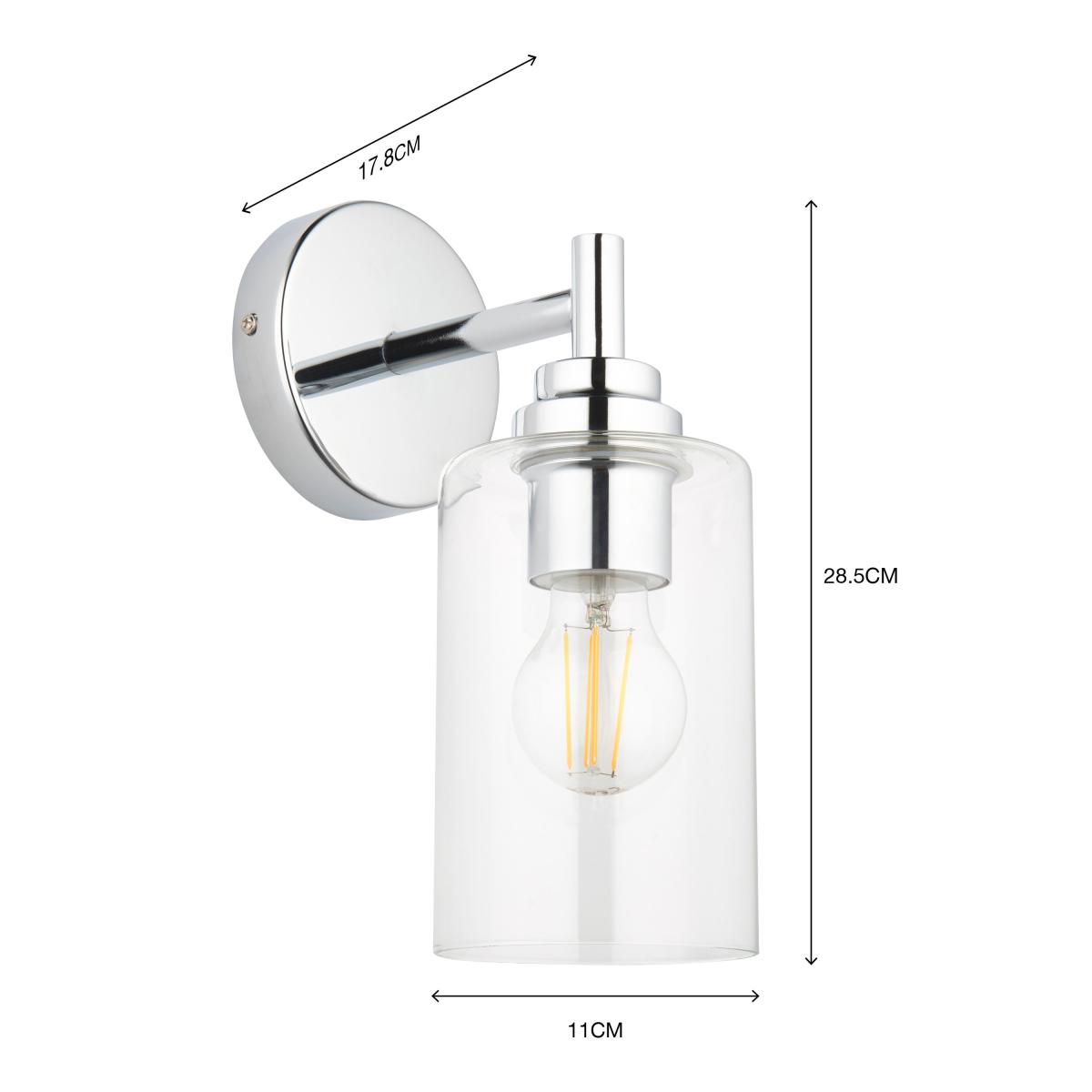 Complete your bathroom look with this classy wall light, designed with a sleek and shiny chrome plate and a glass shade. This light is dimmable, so you can set the perfect ambience to suit you. Coordinate with our matching Fryer items for a complete look. Please note: Bulb not included.