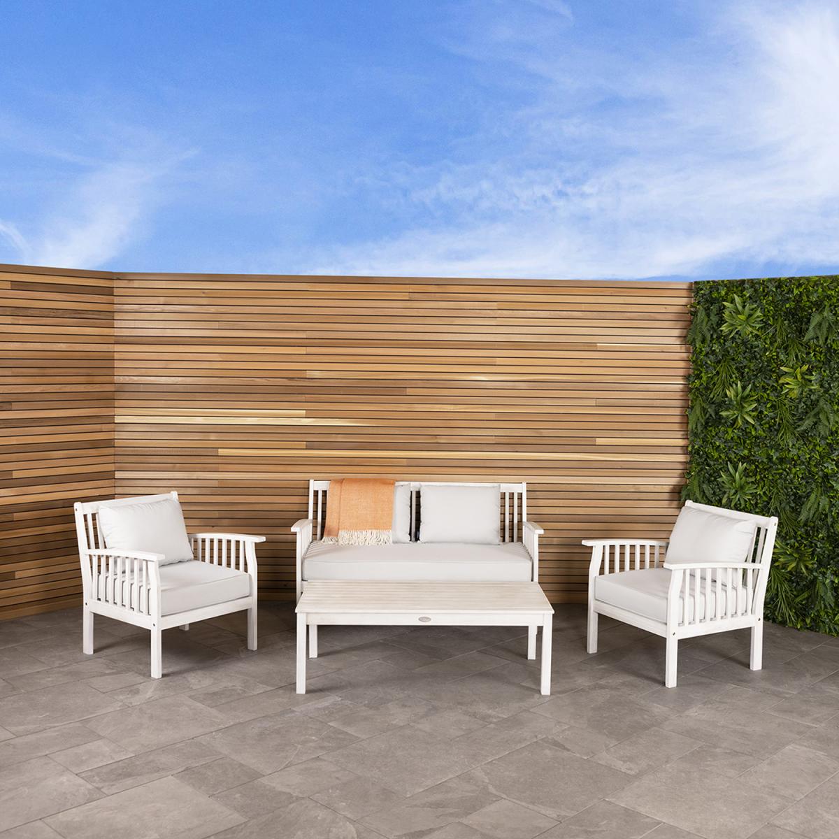 This stylish lounge set is a beautiful addition to any garden, this includes seating for four people with cushion pads for extra comfort and a matching coffee table. Crafted from white washed FSC Acacia Hardwood which has been ethically sourced and sustainably produced to the highest quality. This is ideal for family dining and relaxing in your outdoor space in the summer months. A range of matching outdoor furniture pieces are also available. Features. Seating for 4 people. Seat and back cushion pads for extra comfort in light grey - removable coversFS. C Certified Acacia Hardwood White Washed Finish Contemporary take on traditional designIncludes. 2 x chairs with seat pad and 1 back cushion on each chair1 x bench with seat pad and 2 back cushions1 x coffee tableMaterials. This product contains FSC Certified wood. 100 FSCFSC Certified Acacia HardwoodPolyesterDimensions Chair H78 x L68 x D75cm (x2)Bench H78 x L142 x D75cm Table H40 x W60 x L120cmWeights. Chair 10.5kg (single chair)Bench 16.6kg. Table 12kgColours White Washed Finish Light Grey Polyester Additional Info Height from floor to seat 42cm (chair and bench)Max User 160kg (chair and bench)Chair seat cushion Thickness 12.5cm W57cm x D59cm Bench seat cushion Thickness 13cm W131.5 x D56.5cm. Back Scatter Cushions Thickness 14.5cm W29.5 x L42.5cm. Some self-assembly required. Full instructions provided. This product will be delivered on a pallet, which cannot be disposed of by the courier team. The recipient will be responsible for the disposal of the pallet.