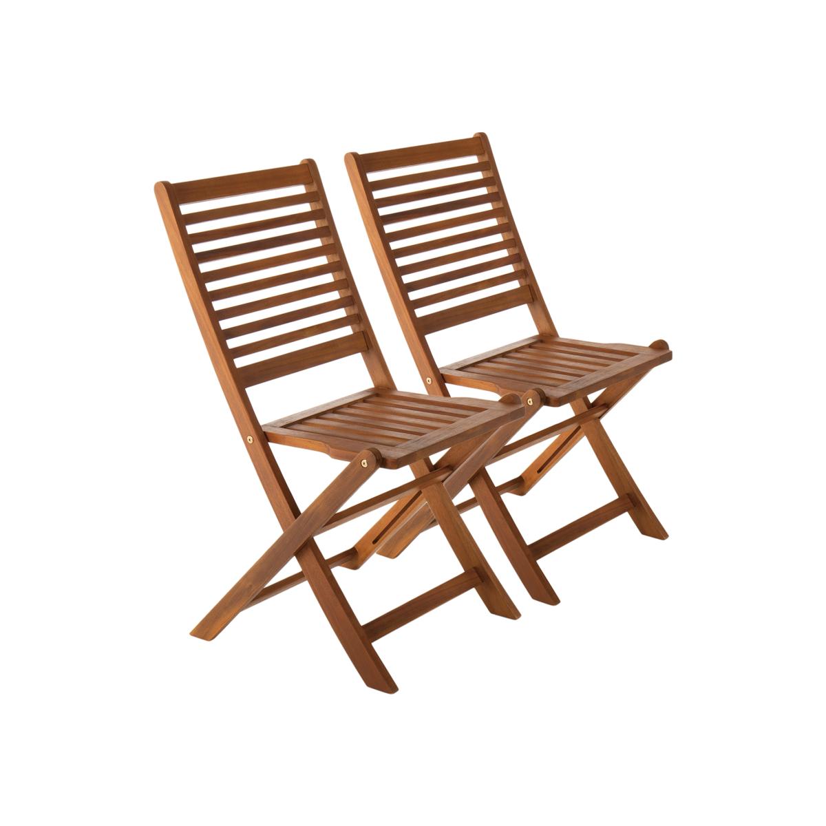 This pair of wooden foldable chairs are ideal for dining outdoors on the patio or in the garden. The chairs are foldable, feature a slatted design and are made from acacia wood. Matching tables and armchairs can be purchased separately. Features. Foldable for easy storage. Slatted designIncludes. 2x chairsMaterials. This product contains FSC Certified wood. 100 FSCFSC acacia certified wood. Oil coated natural colourDimensionsH87.. 5 x D54 x W46cm Floor to seat height 43.5cm. Depth of seat area 35.5cmWeights4.8kg per chair. Max. user weight 160kg