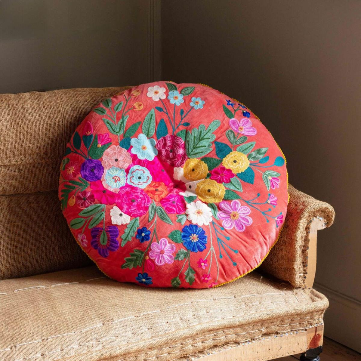 Adorned with an assortment of brightly coloured embroidered flowers on a jewel-toned background and finished with a contrasting pom pom trim. Each flower has been crafted by artisans on hand-driven machines that can take up to ten years to master. It's that human touch which means each cushion will be slightly different and unique. Diameter: 75cm. Made from a 100% cotton outer with a polyester fibre filling. Embroidered on hand-driven machines, so each design may be slightly different. Spot clean only, covers not removeable.
