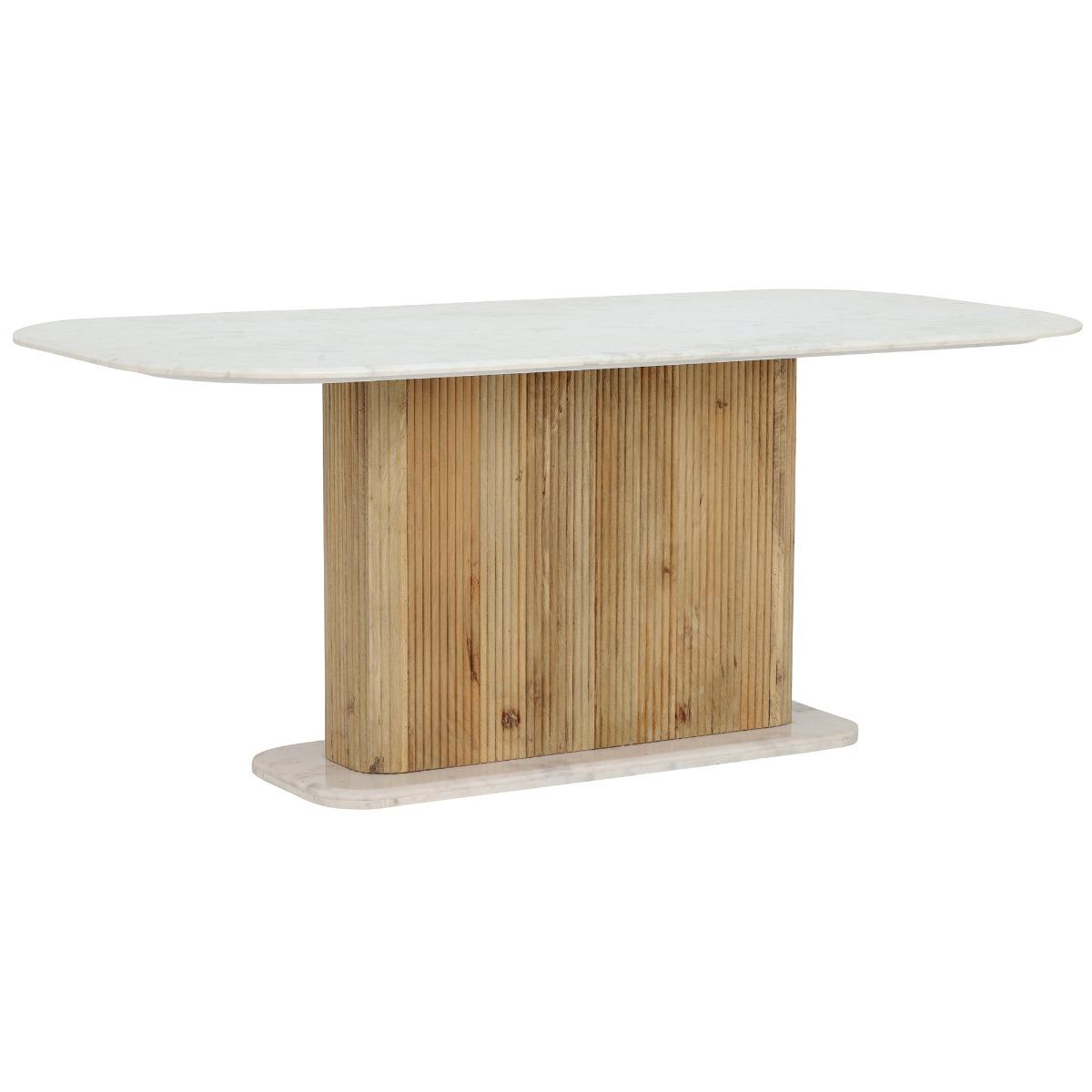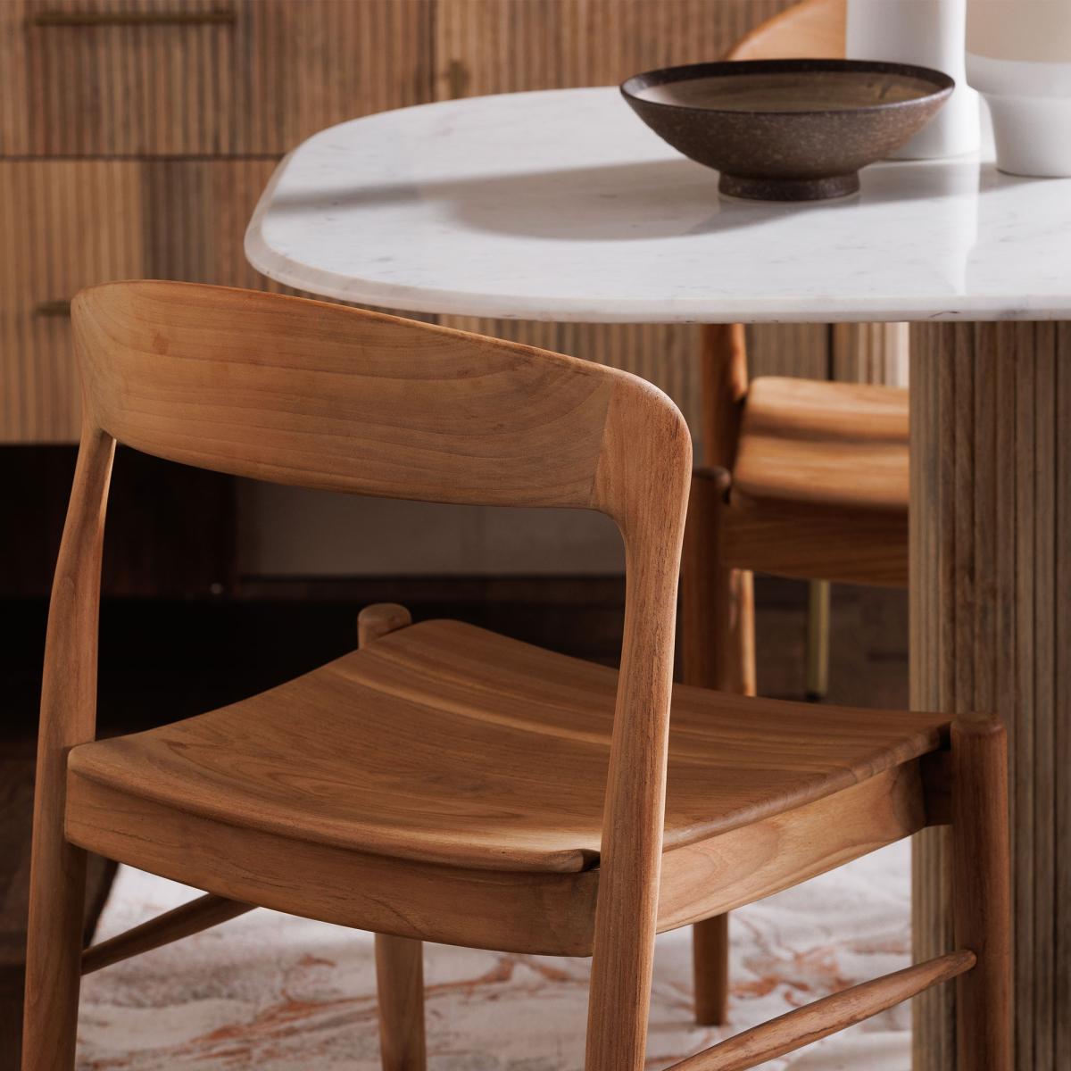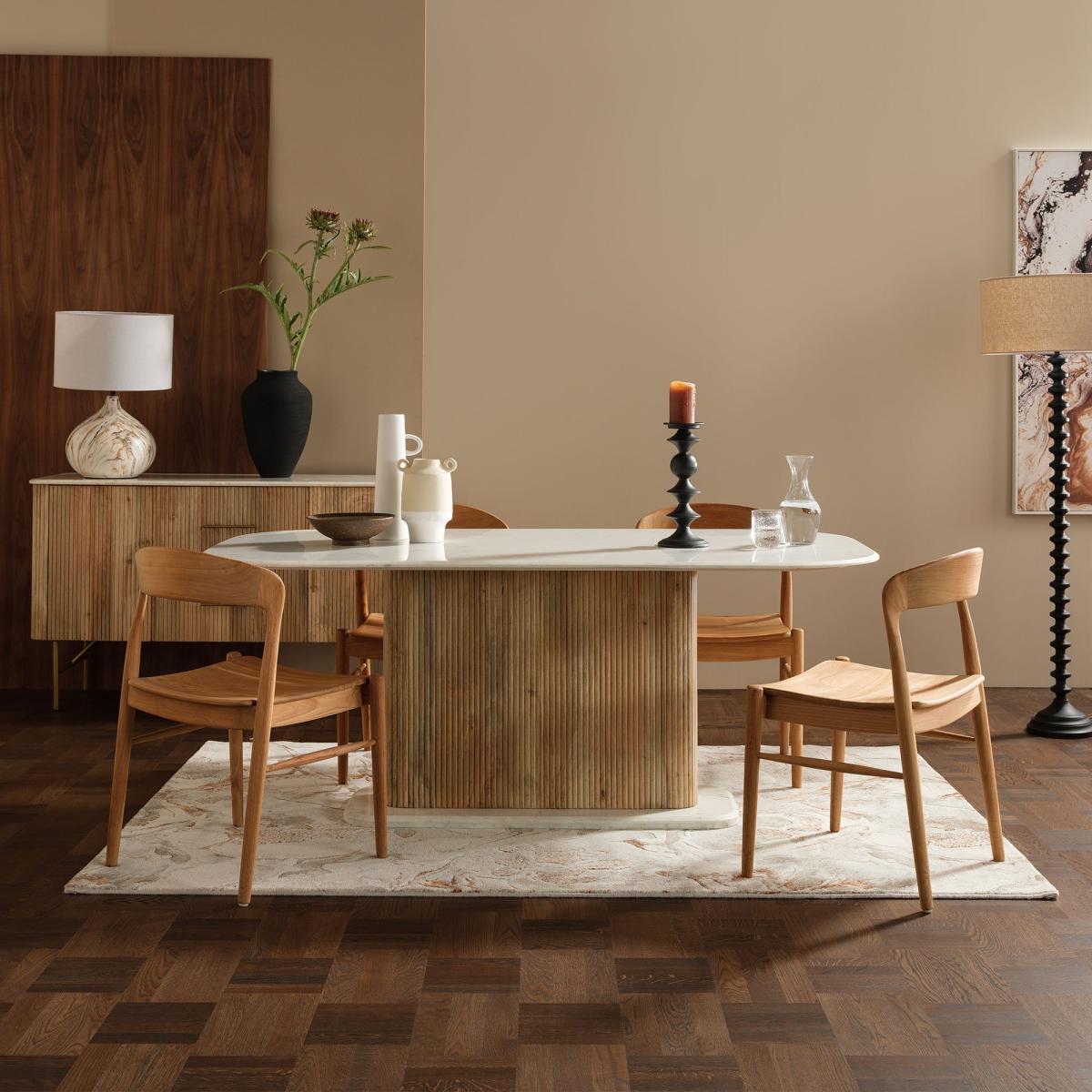 The Curved Marble 180cm Dining Table with a Wood Base and 4 Teak Wood Open Back Dining Chairs is a perfect marriage of elegance and sturdiness for your dining room. The table, adorned with a white marble top and a base crafted from bleached mango wood, features a unique curved design, adding a touch of sophistication. Paired with four fine-sanded teak wood open-back chairs, this ensemble offers both style and comfort. It is the ideal setting for a cosy 4-seater dining experience