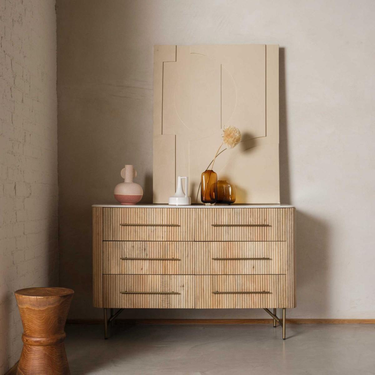 I love this chest because it offers a natural, warm touch to both contemporary and vintage-inspired interiors. Its bleached mango wood finish lends a relaxed, organic feel, making it versatile in living rooms, bedrooms, or even hallways. The drawers provide practical storage, keeping clutter out of sight, while its sleek, minimal handles keep the look streamlined. For styling, consider pairing it with earthy textiles or minimalist decor to highlight its natural beauty, or add a few decorative boxes or baskets on top for additional organisation and visual interest. It works particularly well in spaces that blend modern simplicity with rustic charm, creating an inviting yet functional focal point.