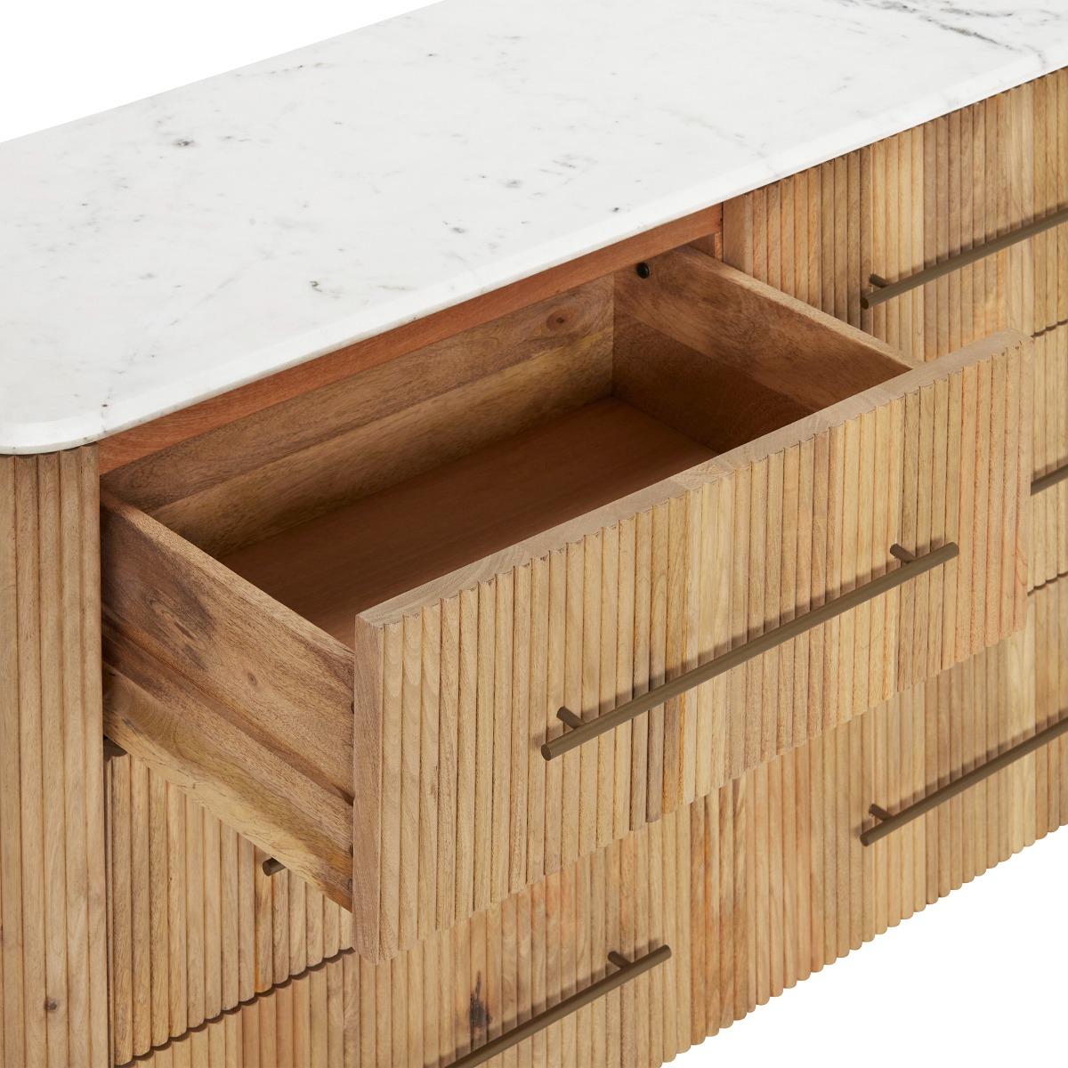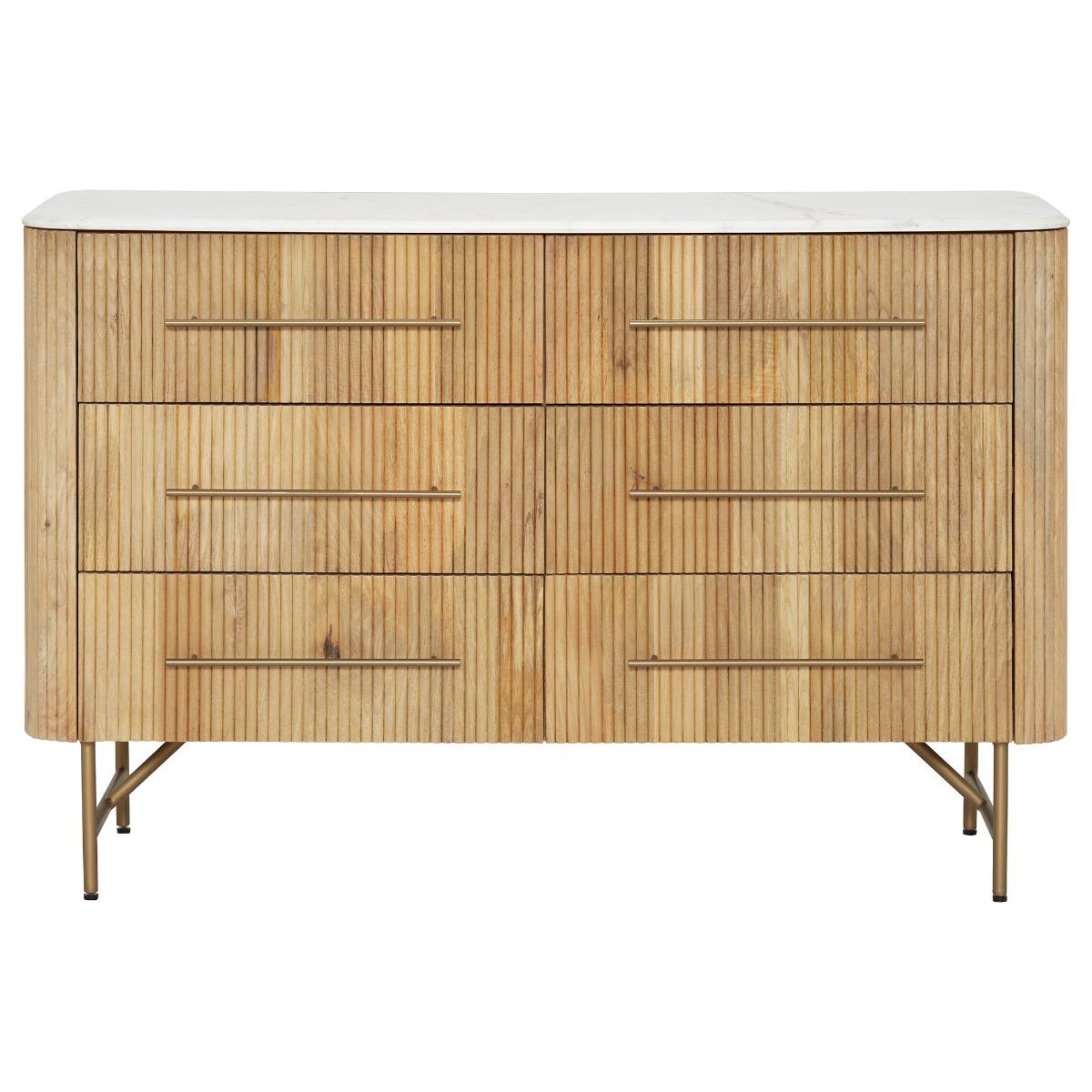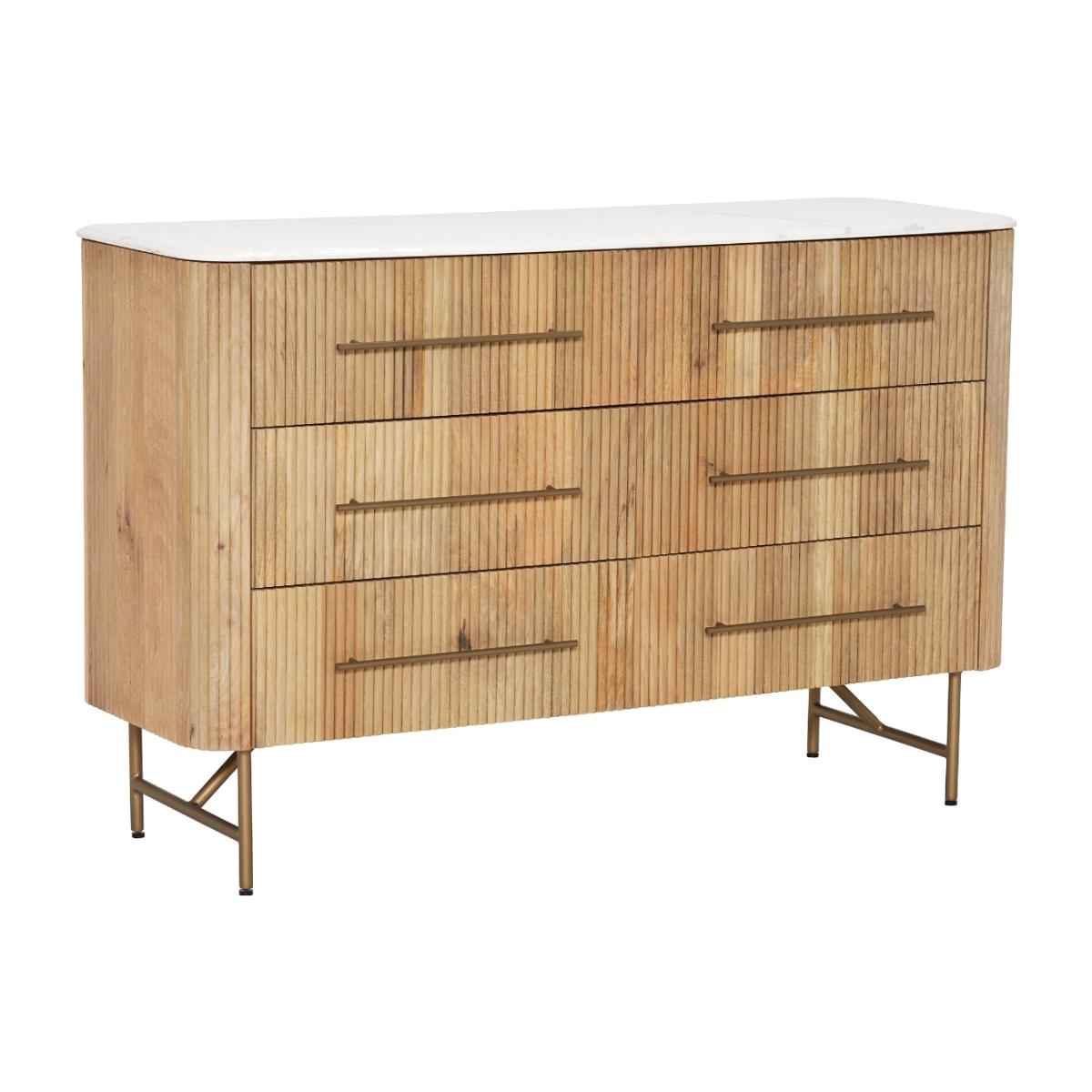 The Fuji 6 Drawer Chest sits atop slim bronze legs with matching handles that complement the bleached mango wood. The subtle slatted design adds an interesting pattern to the drawer fronts, finished off with a stunning white marble top which the Fuji is known for. Featuring 6 large drawers so you have plenty of storage space to fill with your favourite clothing, the Fuji 6 Drawer Chest is an essential piece of furniture for your bedroom.