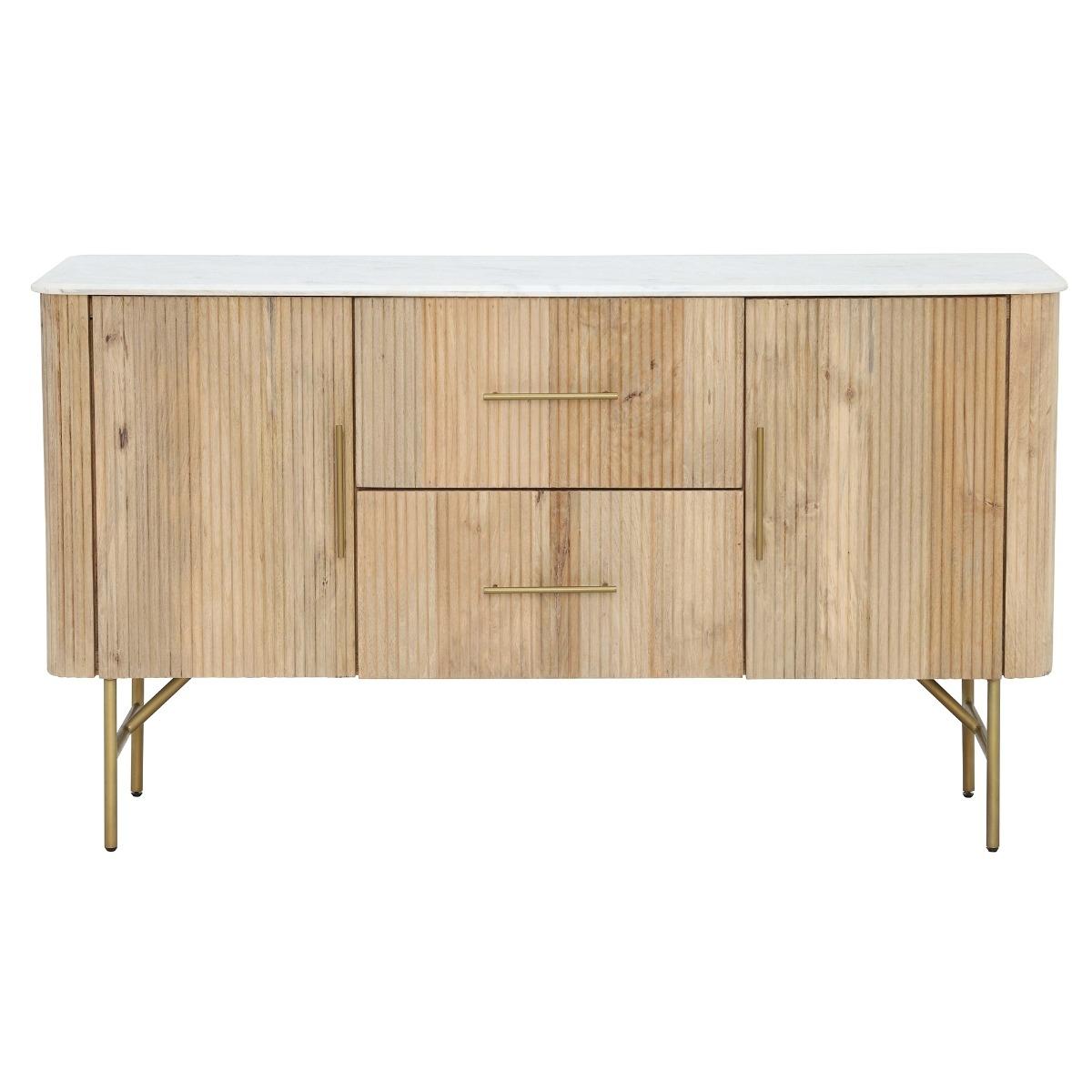 Design. Featuring a beautiful slatted front design that very much nods to the 70’s. The Fuji Sideboard is a contemporary piece that will look stunning in your home. Delicate natural veins from the marble top contrast against the rustic nature of the wood, creating a serene feeling that will look great in your dining room. With two drawers and plenty of cupboard space, this stylish space saving piece is a must have for anyone looking to get the most out of their home.