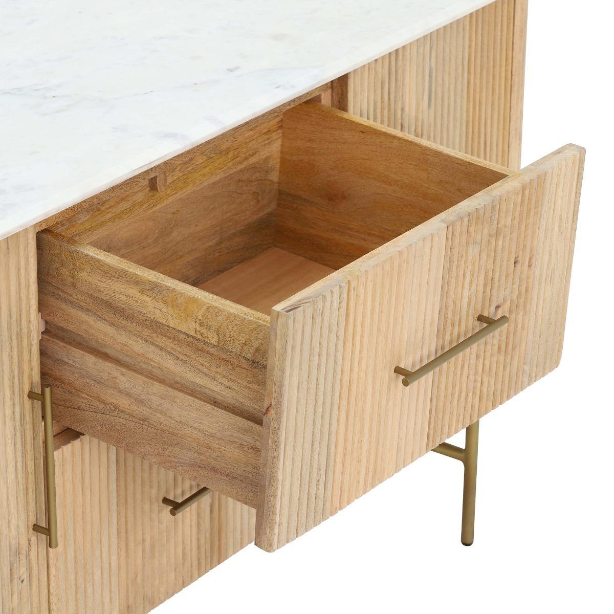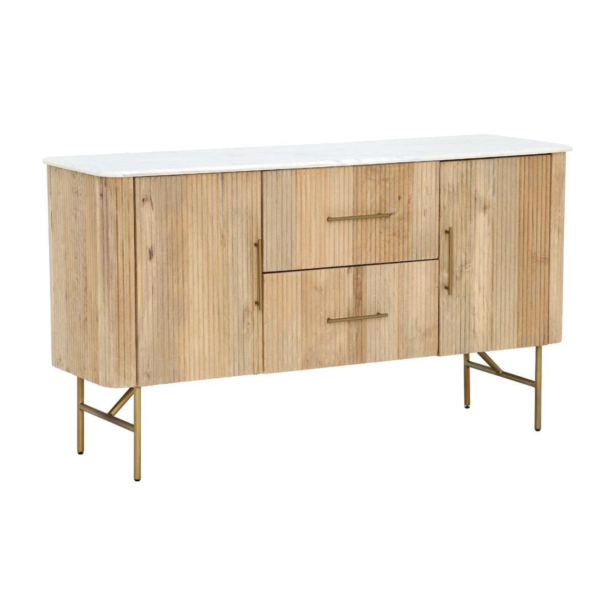Design. Featuring a beautiful slatted front design that very much nods to the 70’s. The Fuji Sideboard is a contemporary piece that will look stunning in your home. Delicate natural veins from the marble top contrast against the rustic nature of the wood, creating a serene feeling that will look great in your dining room. With two drawers and plenty of cupboard space, this stylish space saving piece is a must have for anyone looking to get the most out of their home.