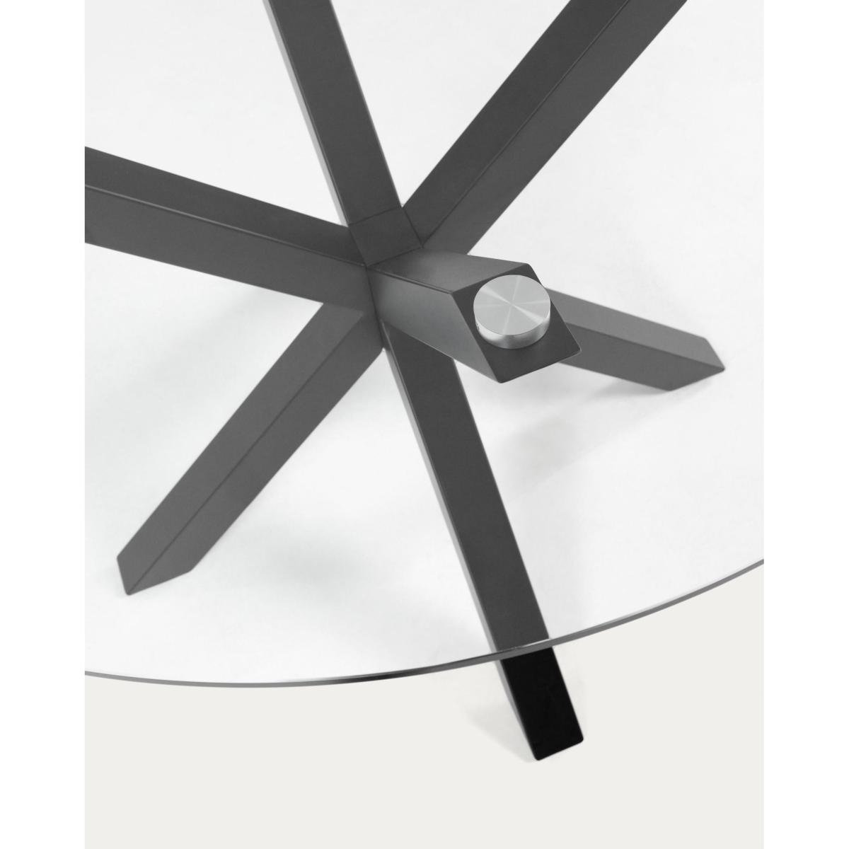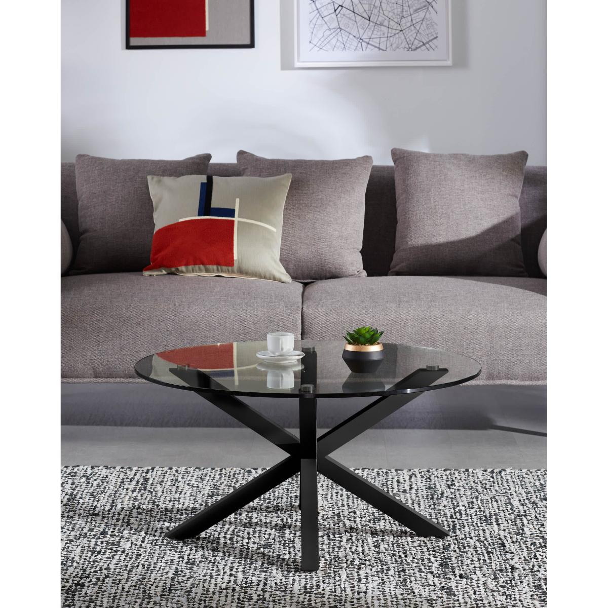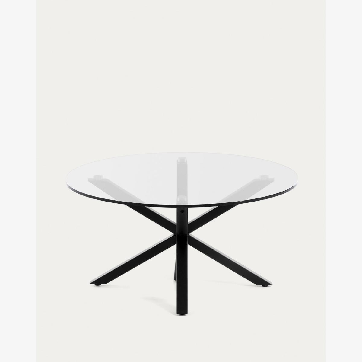 This coffee table, with a tempered glass top and steel legs with a black finish, boasts design as well as materials and finishes. With an 82cm top, you can make use of it comfortably, thanks to its scale. In addition, it is supported on top of a structure where the legs seem to intertwine, a top design which also provides stability. Enjoy the design with this essential piece for the focal point of your living room.