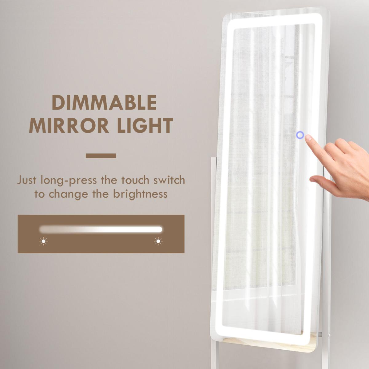 Full Length Mirror with LED, Dimmable Floor Mirror with Storage Shelf - White