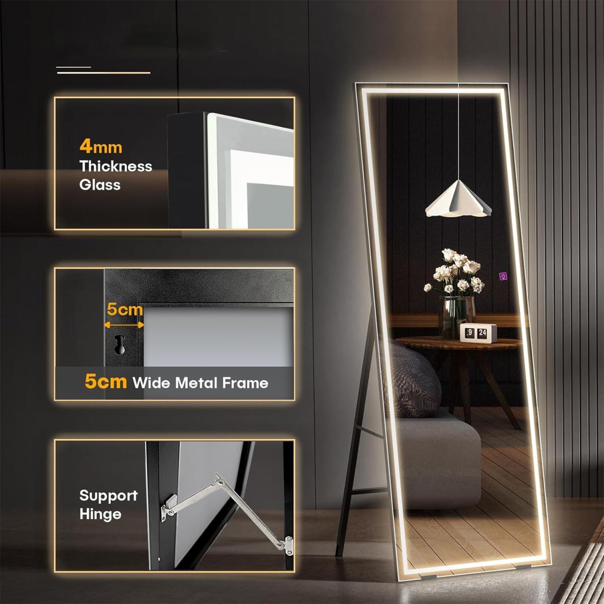 Full size body mirror with LED lights, the brightness and light temperature of this full length mirror are controlled by a smart touch button. Short press the switch to change the color temperature into white light, warm light or yellow light. Long press the switch for seconds to adjust the brightness to your liking. Our standing mirror is clear and more HD. The shattered glass with the explosion-proof membrane will not be spilled out even impacted by an external force, which is more protective
