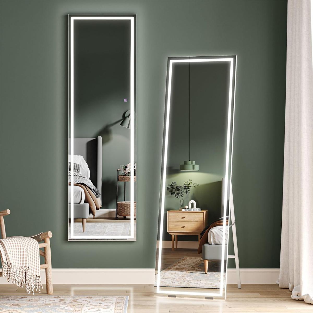 Full size body mirror with LED lights, the brightness and light temperature of this full length mirror are controlled by a smart touch button. Short press the switch to change the color temperature into white light, warm light or yellow light. Long press the switch for seconds to adjust the brightness to your liking. Our standing mirror is clear and more HD. The shattered glass with the explosion-proof membrane will not be spilled out even impacted by an external force, which is more protective