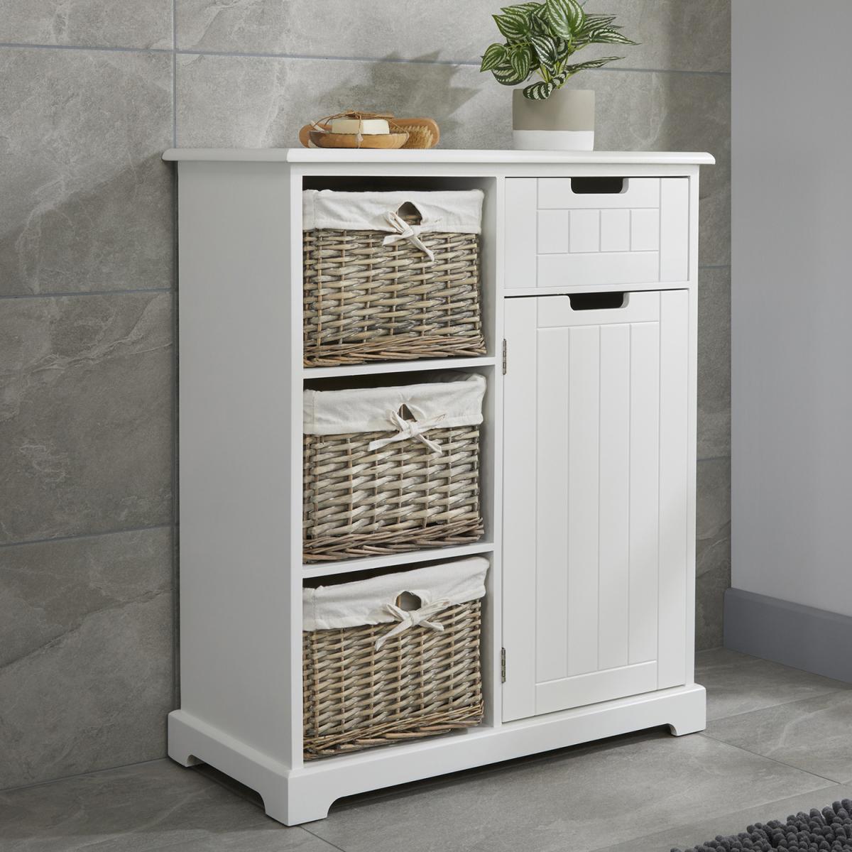 Fully Assembled Console Cabinet with Woven Baskets in Grey - White