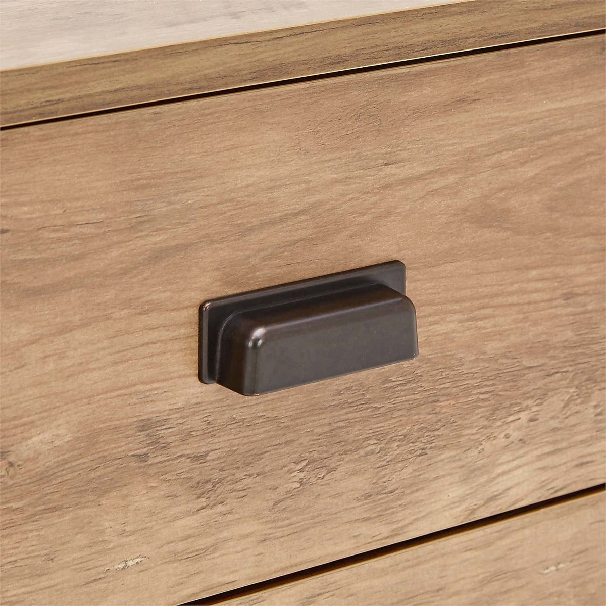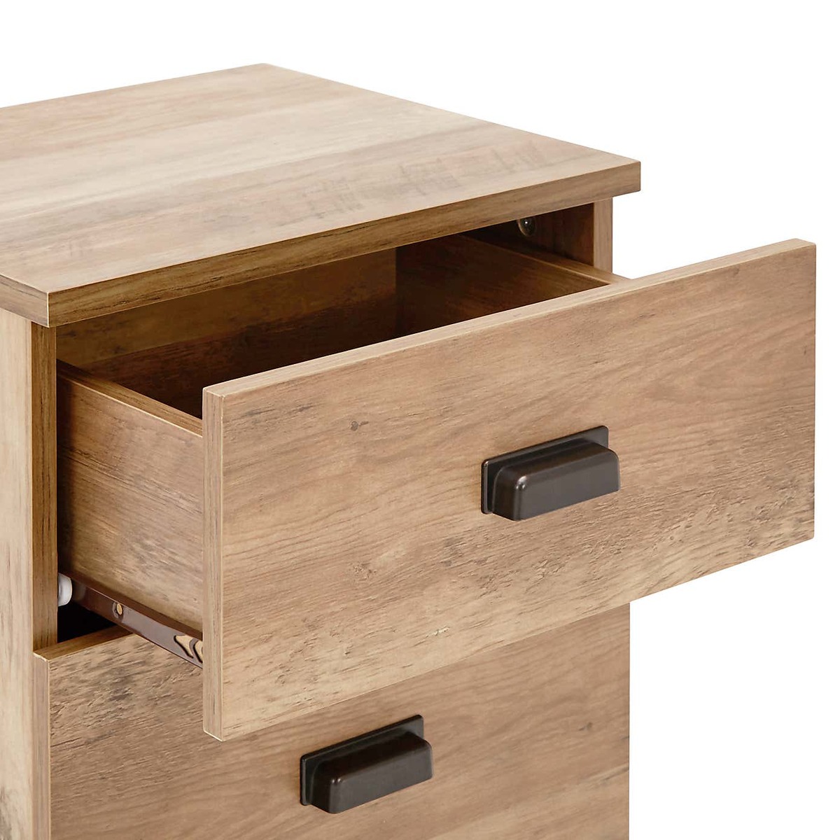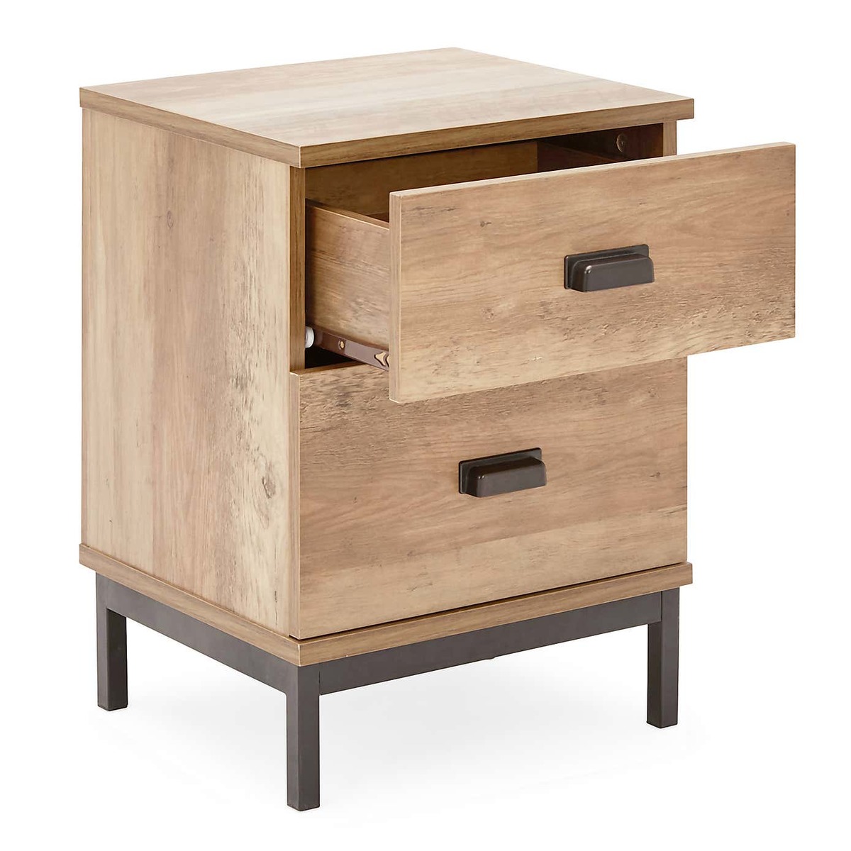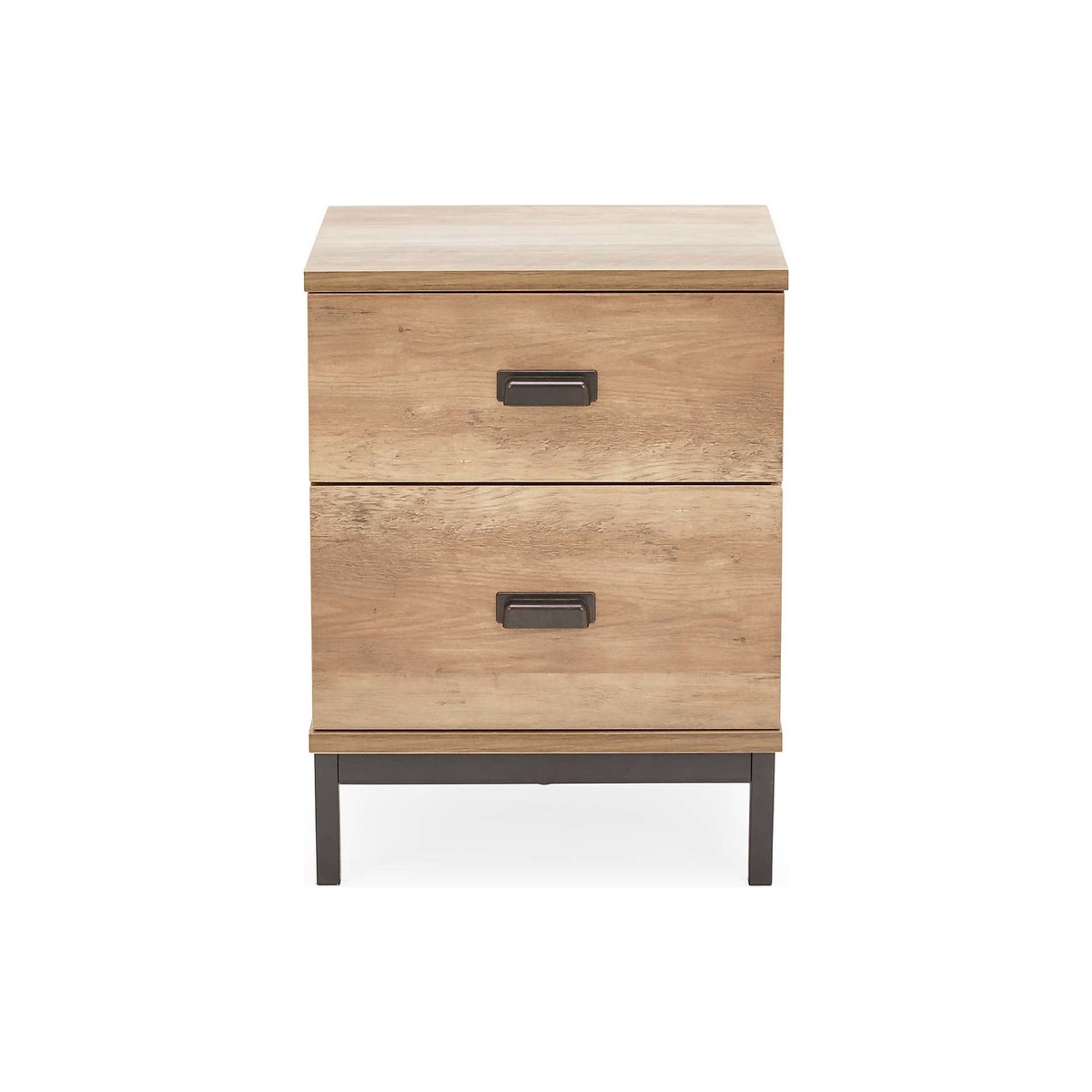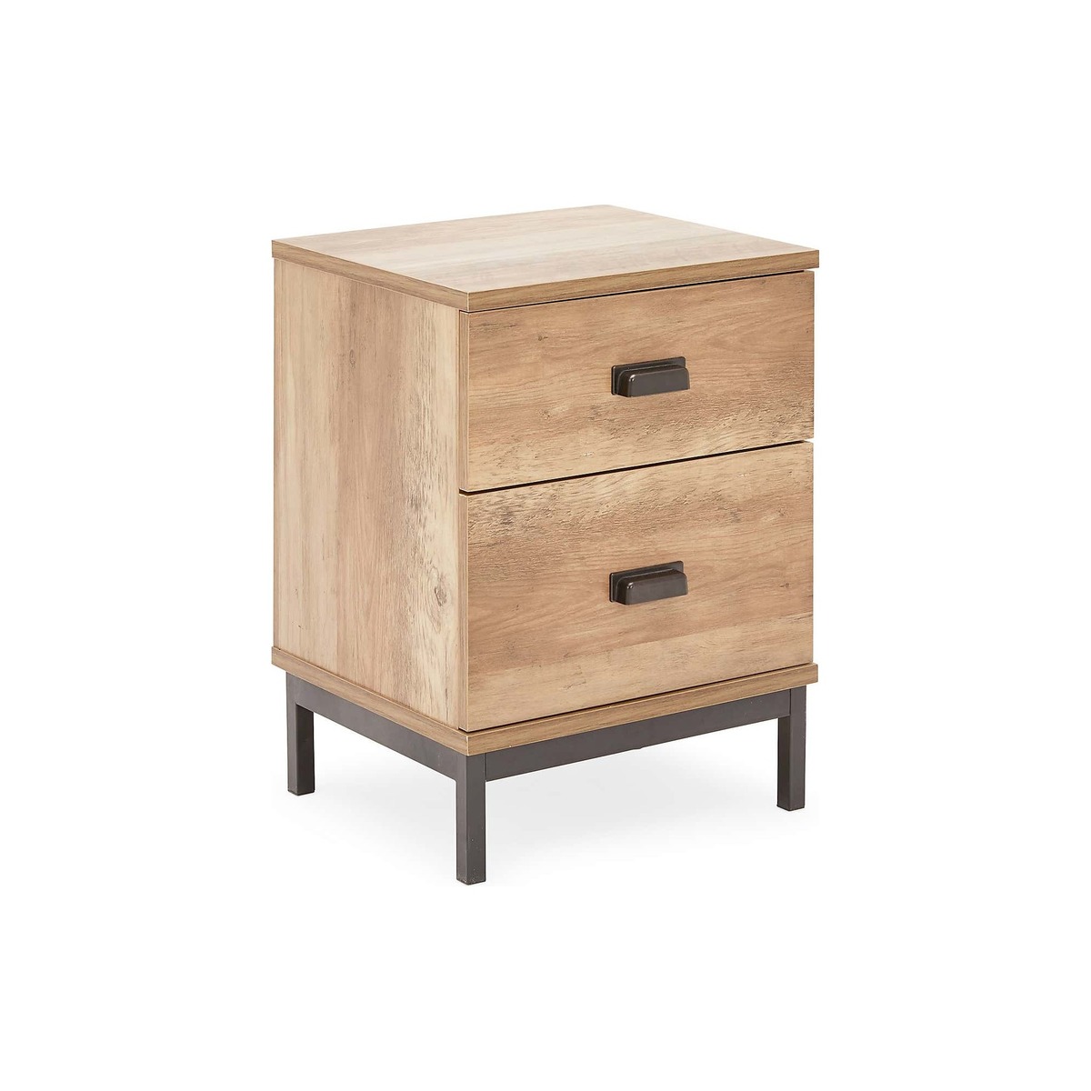 Dunelm Exclusive - Designed and Developed by Dunelm. Inspired by contemporary and simplistic styling the Fulton oak range is a perfect statement piece to any living space. Made from durable materials with a metal tube base and unique matt finish, this self-assembly range features a rustic oak-effect foil finish with complimenting black handles. Beautifully crafted with a straight edge finish, this bedside table features two spacious drawers, complete with smooth metal extension runners and a safety pull-out stop. Care Instruction: Only clean using a damp cloth and mild detergent, do not use bleach or abrasive cleaners. From time to time check that there are no loose screws on this unit. Remove any spills immediately to avoid staining and dust regularly with a soft lint free cloth or duster. This product is also available in a. Pine finish.