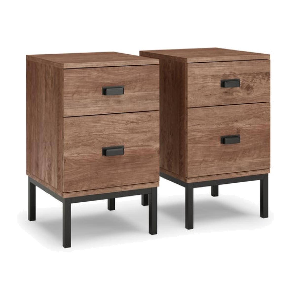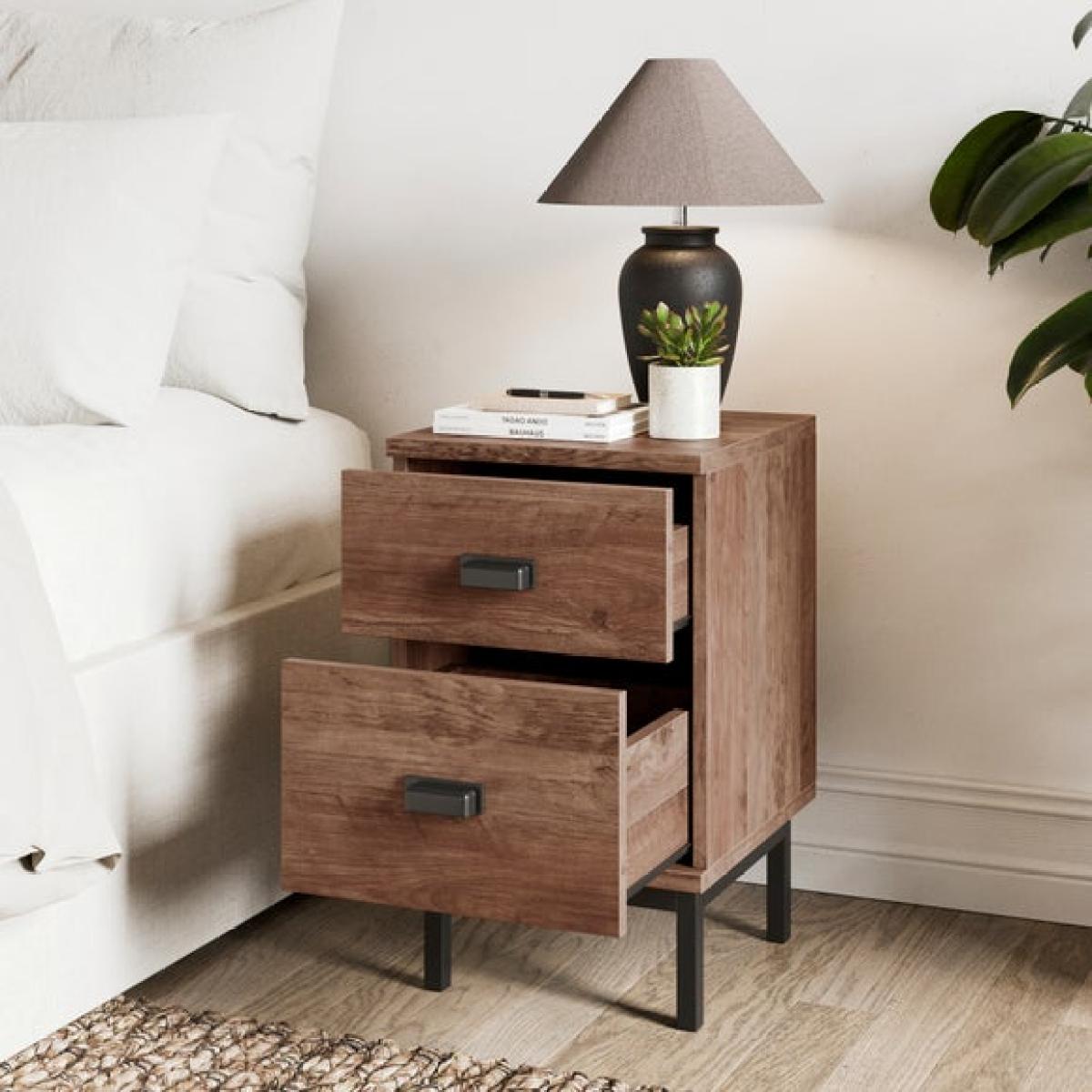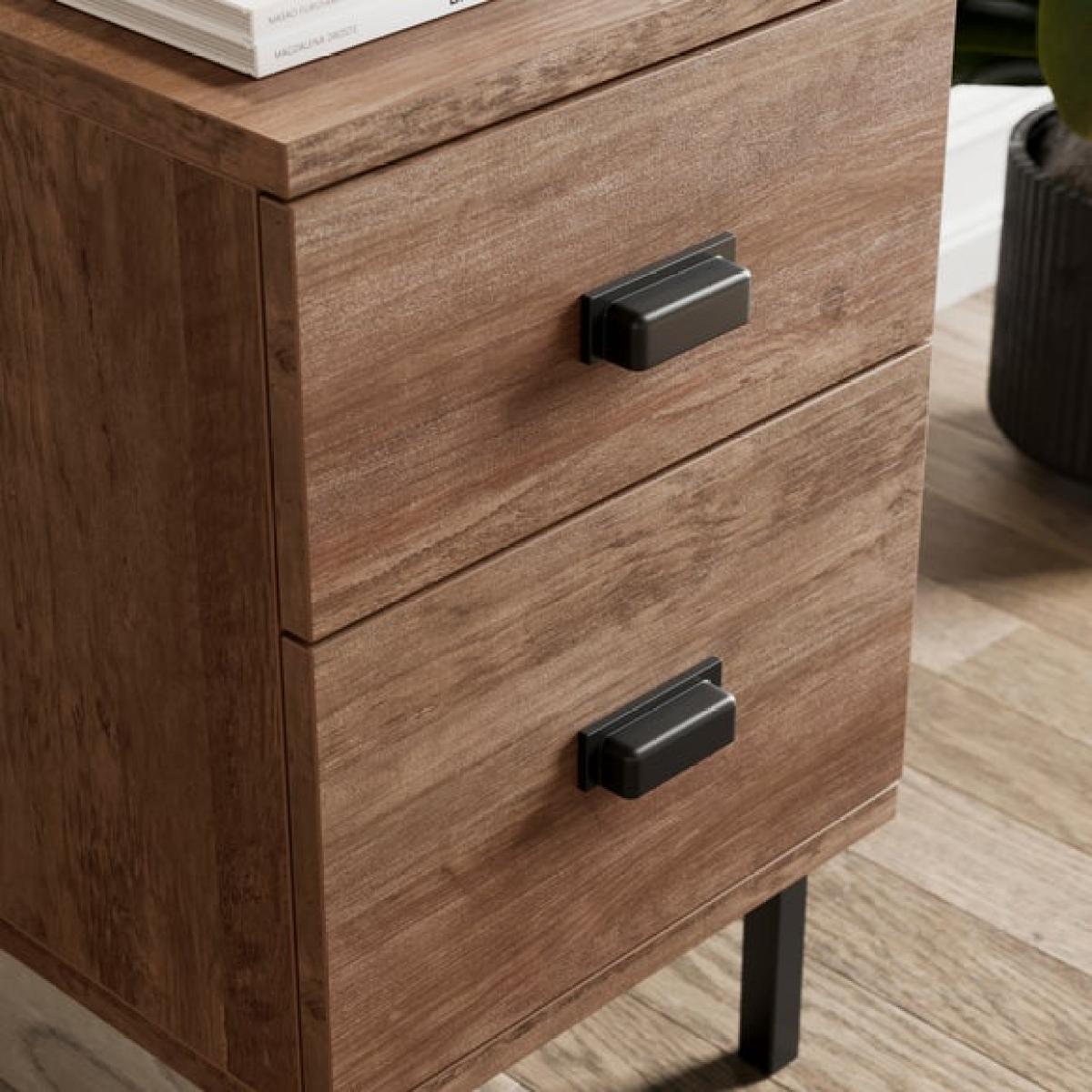 Dunelm Exclusive - Designed and Developed by Dunelm Inspired by contemporary and simplistic styling the Fulton range is a perfect statement piece to any living space. Made from durable materials with a metal tube base and unique matt finish, this self-assembly range features a rustic pine-effect finish with complimenting black handles. Boasting a modern slimline design, the fulton slim bedside table features two spacious drawers to provide additional storage space and is ideal for compact bedroom spaces. Finish=. Pine)