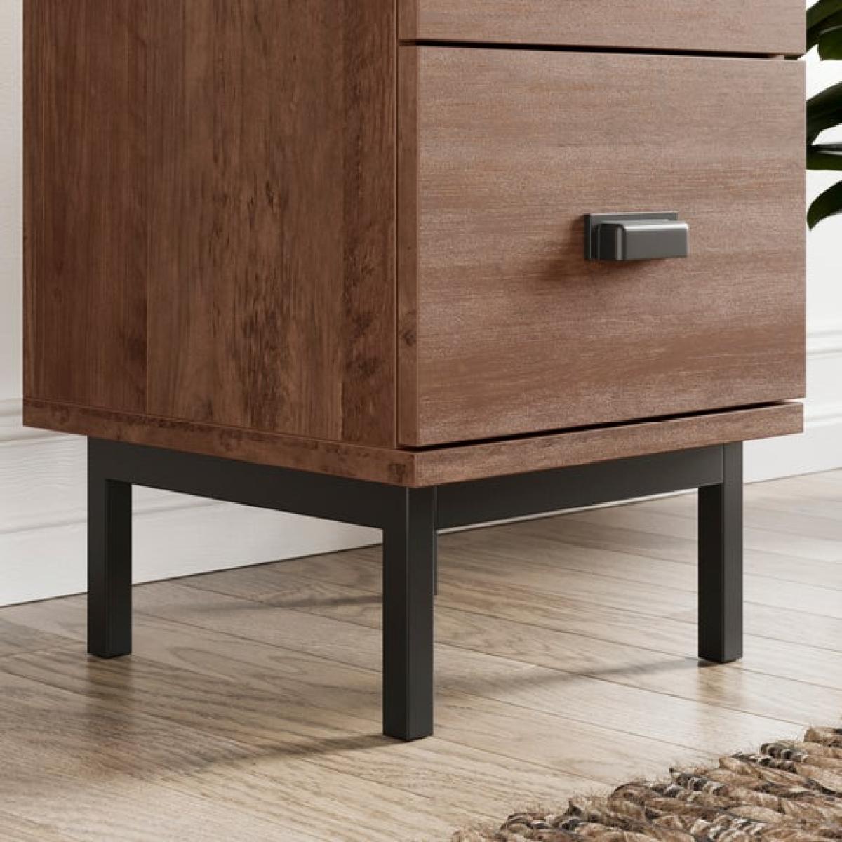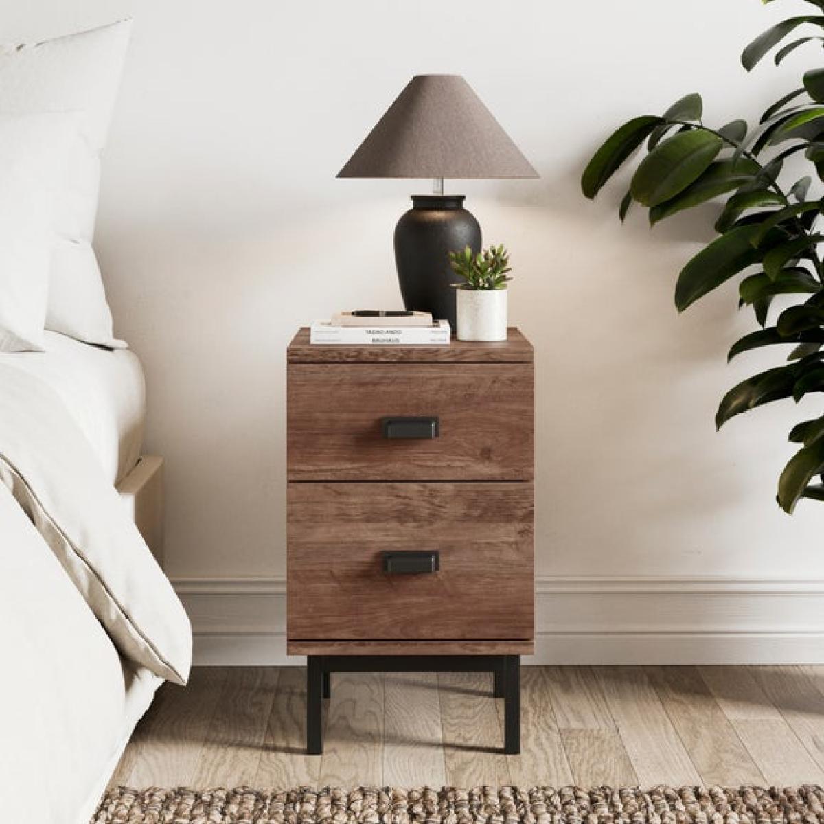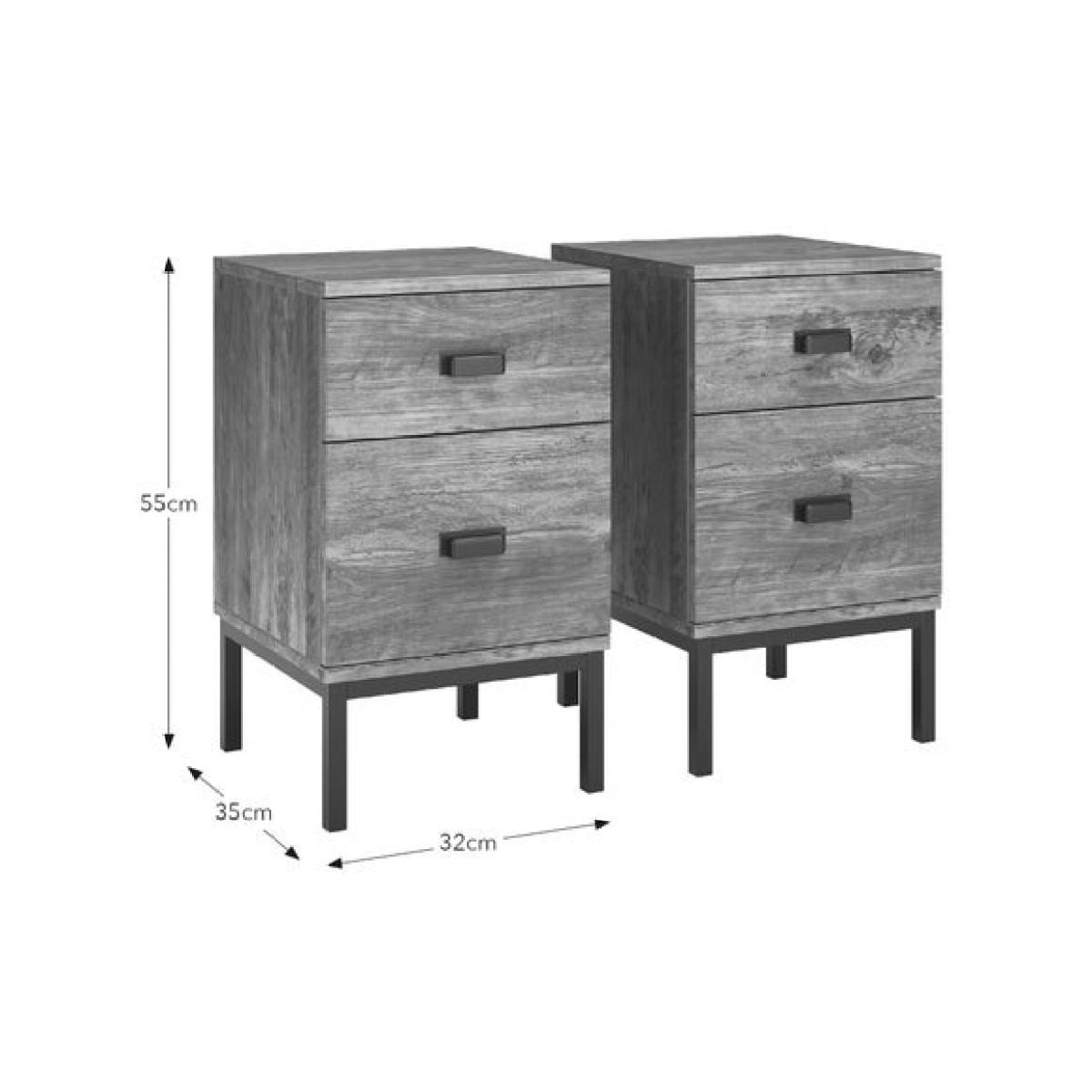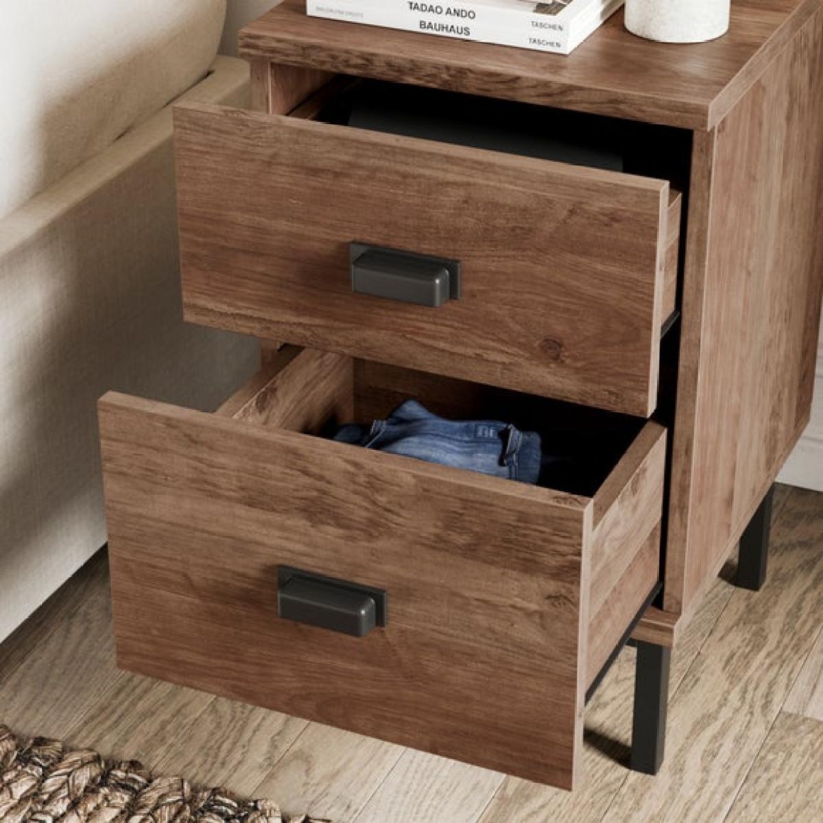Dunelm Exclusive - Designed and Developed by Dunelm Inspired by contemporary and simplistic styling the Fulton range is a perfect statement piece to any living space. Made from durable materials with a metal tube base and unique matt finish, this self-assembly range features a rustic pine-effect finish with complimenting black handles. Boasting a modern slimline design, the fulton slim bedside table features two spacious drawers to provide additional storage space and is ideal for compact bedroom spaces. Finish=. Pine)