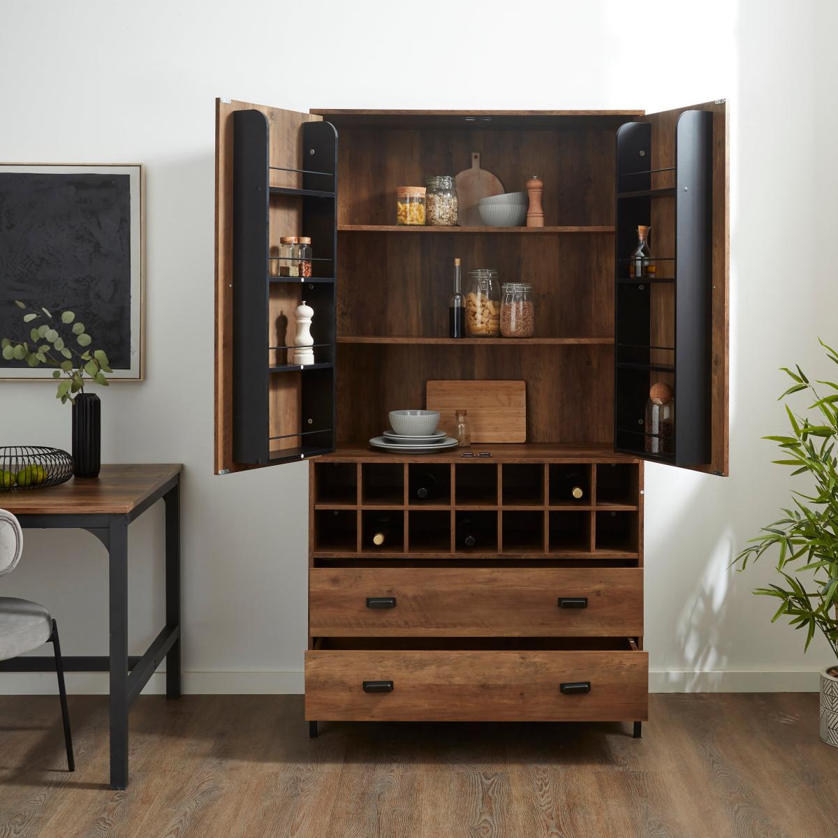 Dunelm Exclusive - Designed and Developed by Dunelm* Large Kitchen Storage* Shelving and Drawers* Pine Effect With 2 doors, 10 shelves behind them, 2 drawers, metal handles, metal legs, and metal hinges, this larder unit offers plenty of storage in addition to its striking industrial look. Ideal for keeping your kitchen organised and adding a touch of modern flair, this larder unit is a must-have for those who appreciate both form and function. This range features pre-fitted drawer runners to make assembly even easier, so you've got more time to sit back with a cuppa and admire your new furniture.