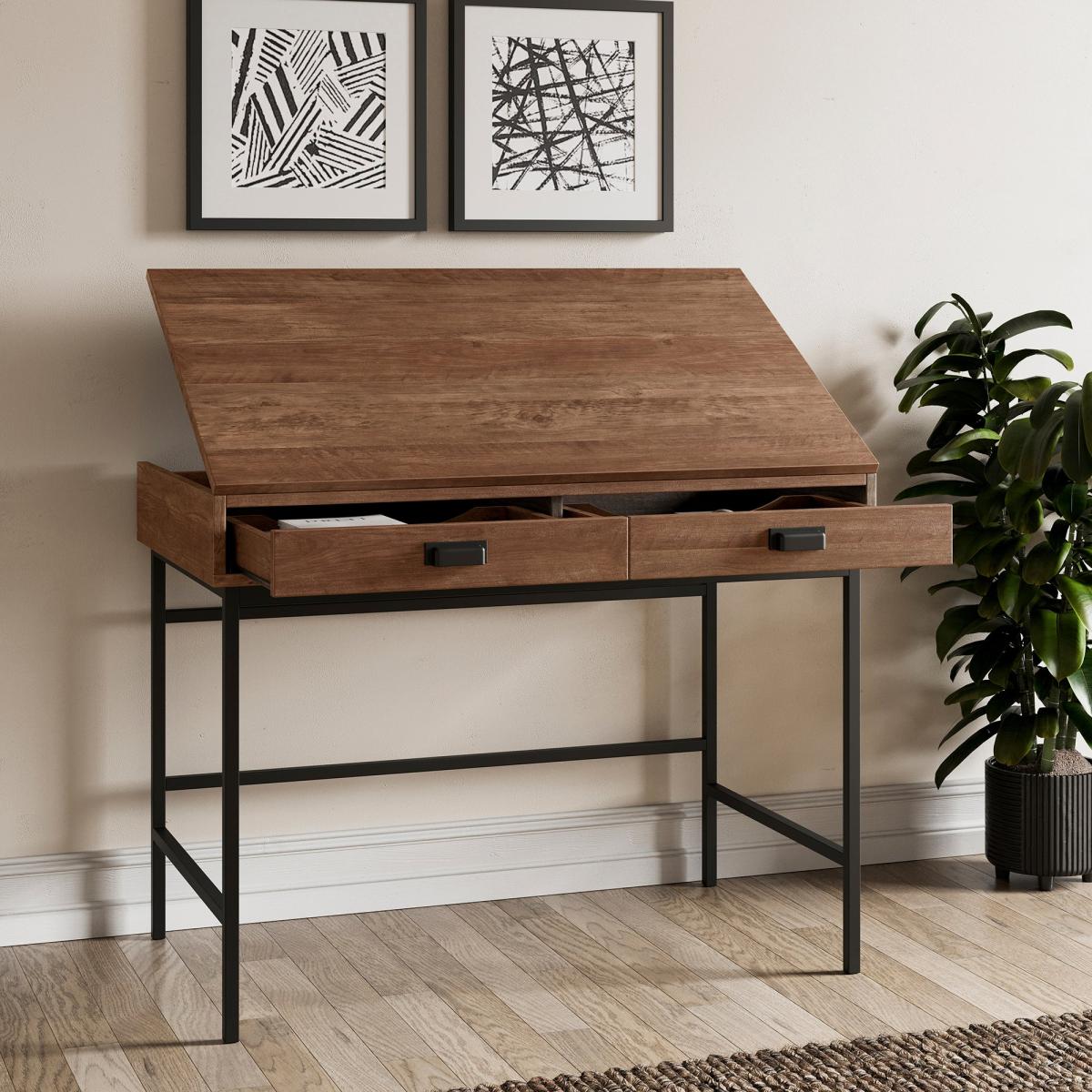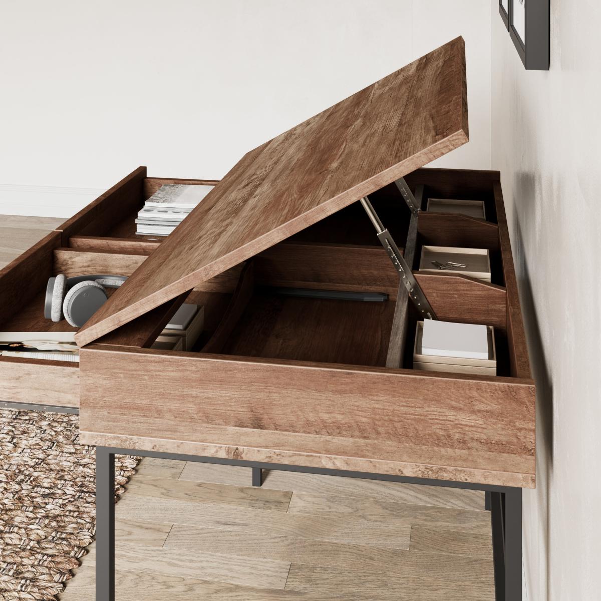 * Lift up table top* 2 large drawers* Metal legs Exclusively designed by Dunelm, this desk offers a lift-up tabletop with hidden storage, providing a clever way to keep your workspace tidy and organised. The adjustable working heights cater to a range of tasks, whether you’re working, drawing, or crafting. With two spacious drawers and a pine-effect finish, this desk blends rustic charm with modern practicality.